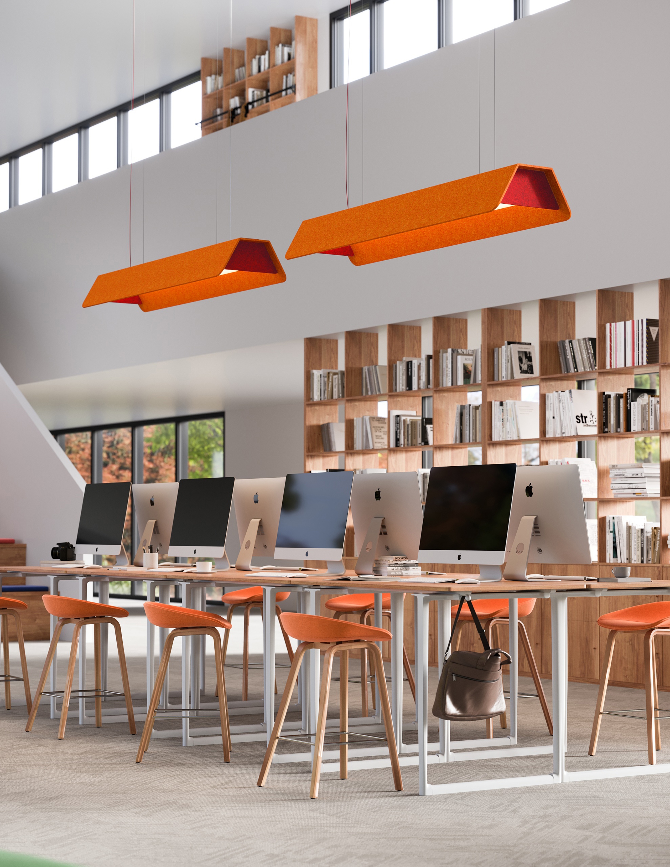Roof’s acoustic felt frame absorbs reflected sounds in a room; it is particularly well-suited for environments with hard surfaces or tall glass windows. Surface mounting is preferred for low ceiling applications, such as small, enclosed rooms. Suspended mounting fits best in open area environments with higher or unfinished ceilings, where designers can take advantage of the luminaire’s large scale.