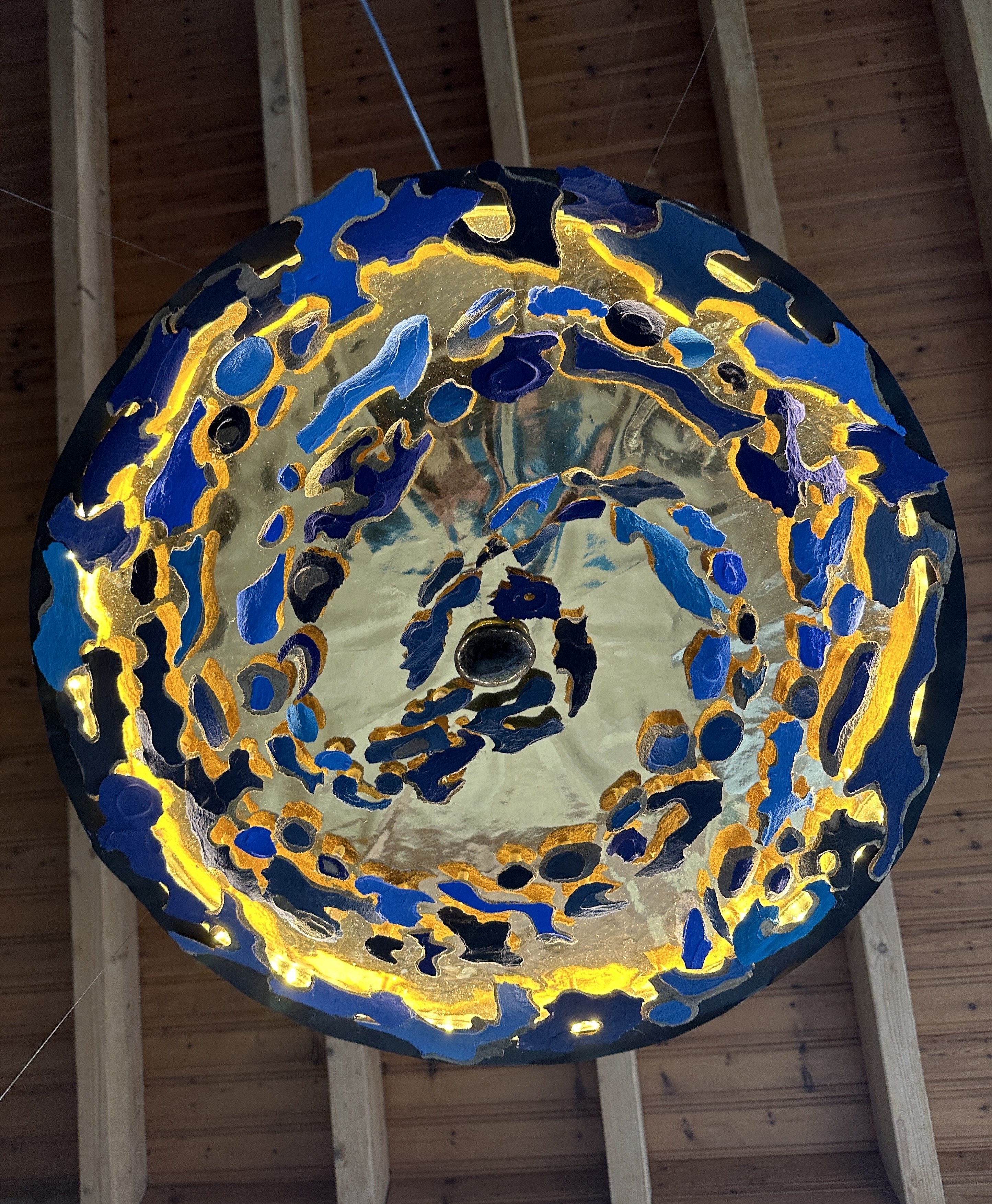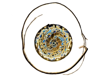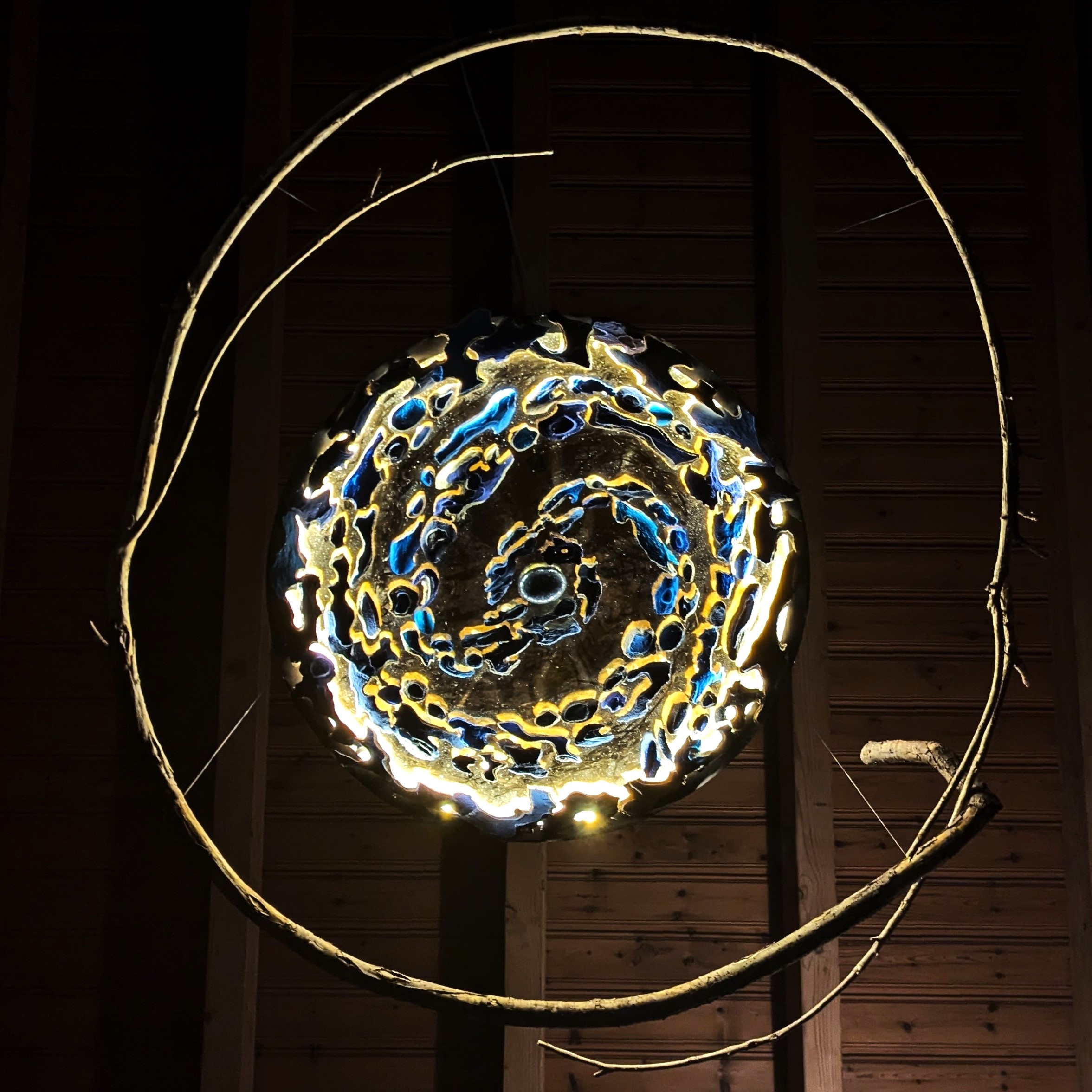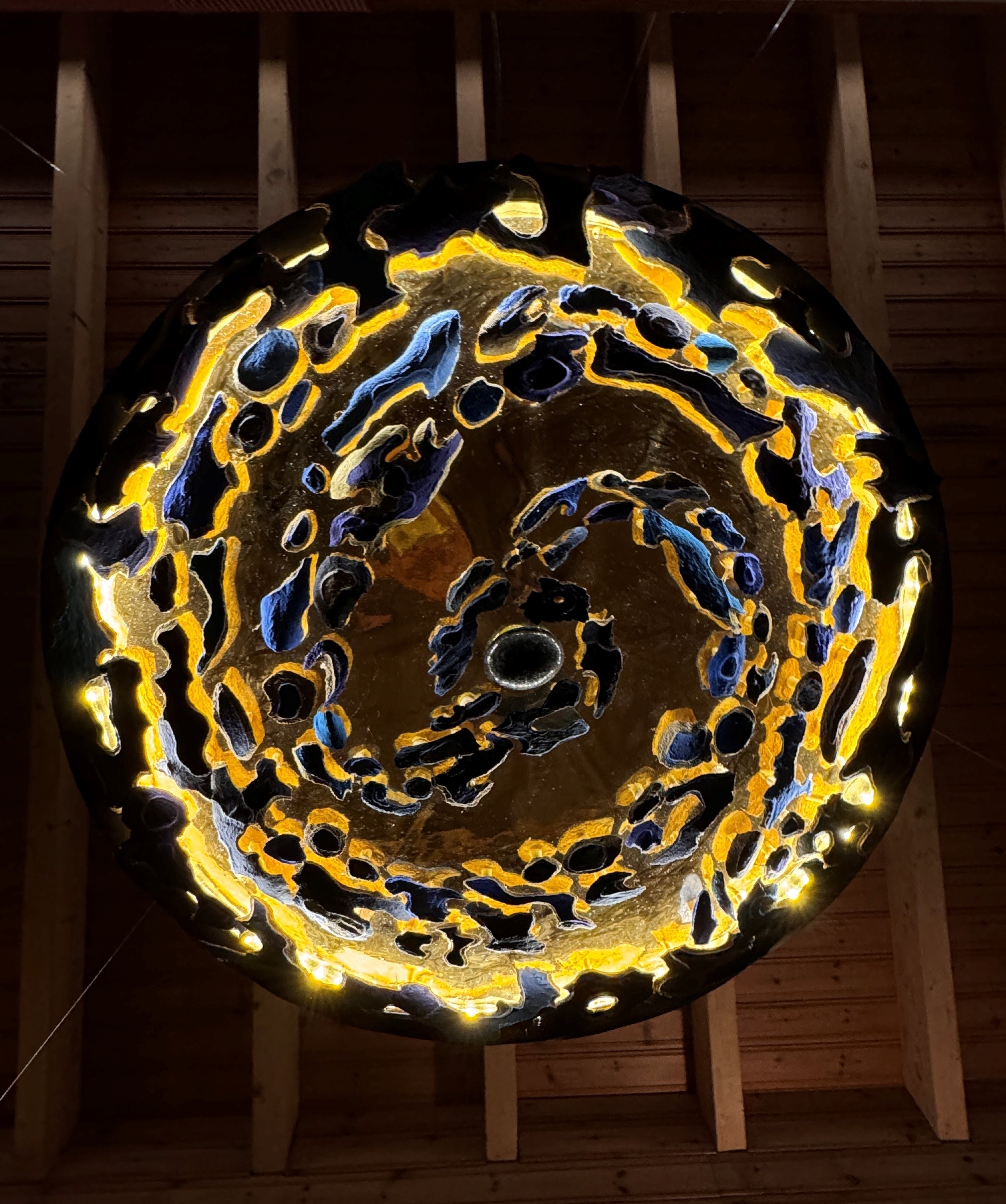The lamp’s design centers around the blue bark, positioned a few centimeters above a reflective gold layer. This creates a captivating play of light and shadow, mimicking sunlight filtering through water.