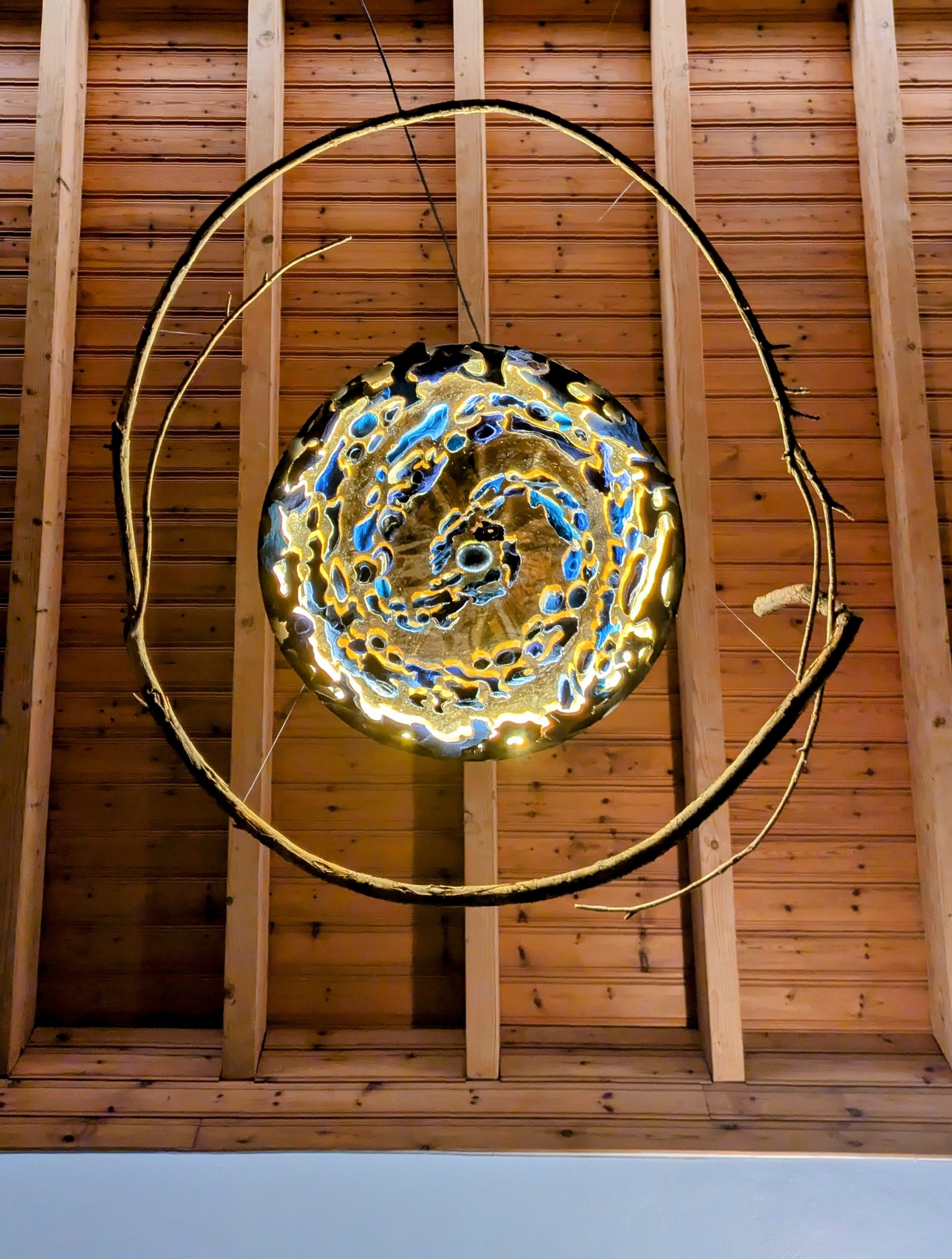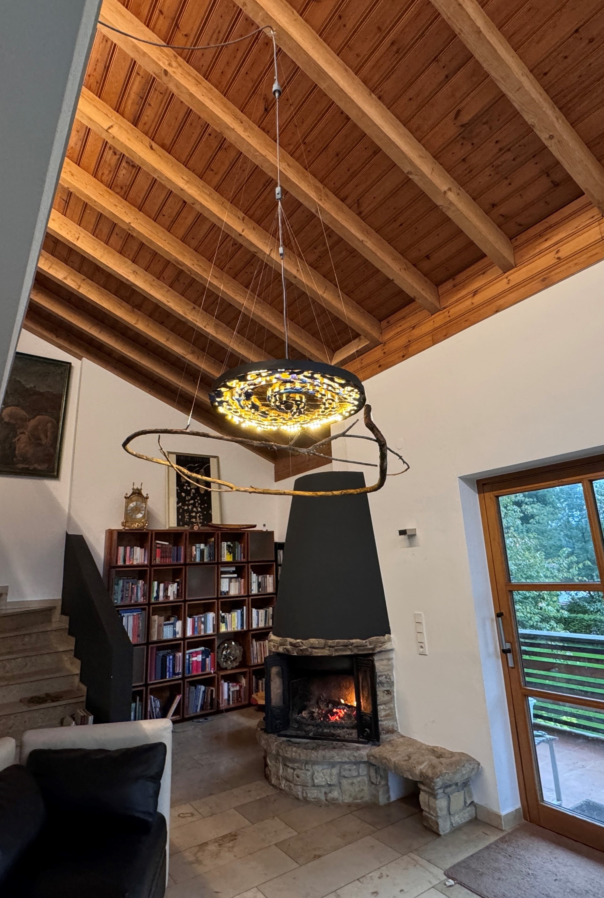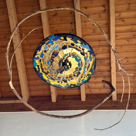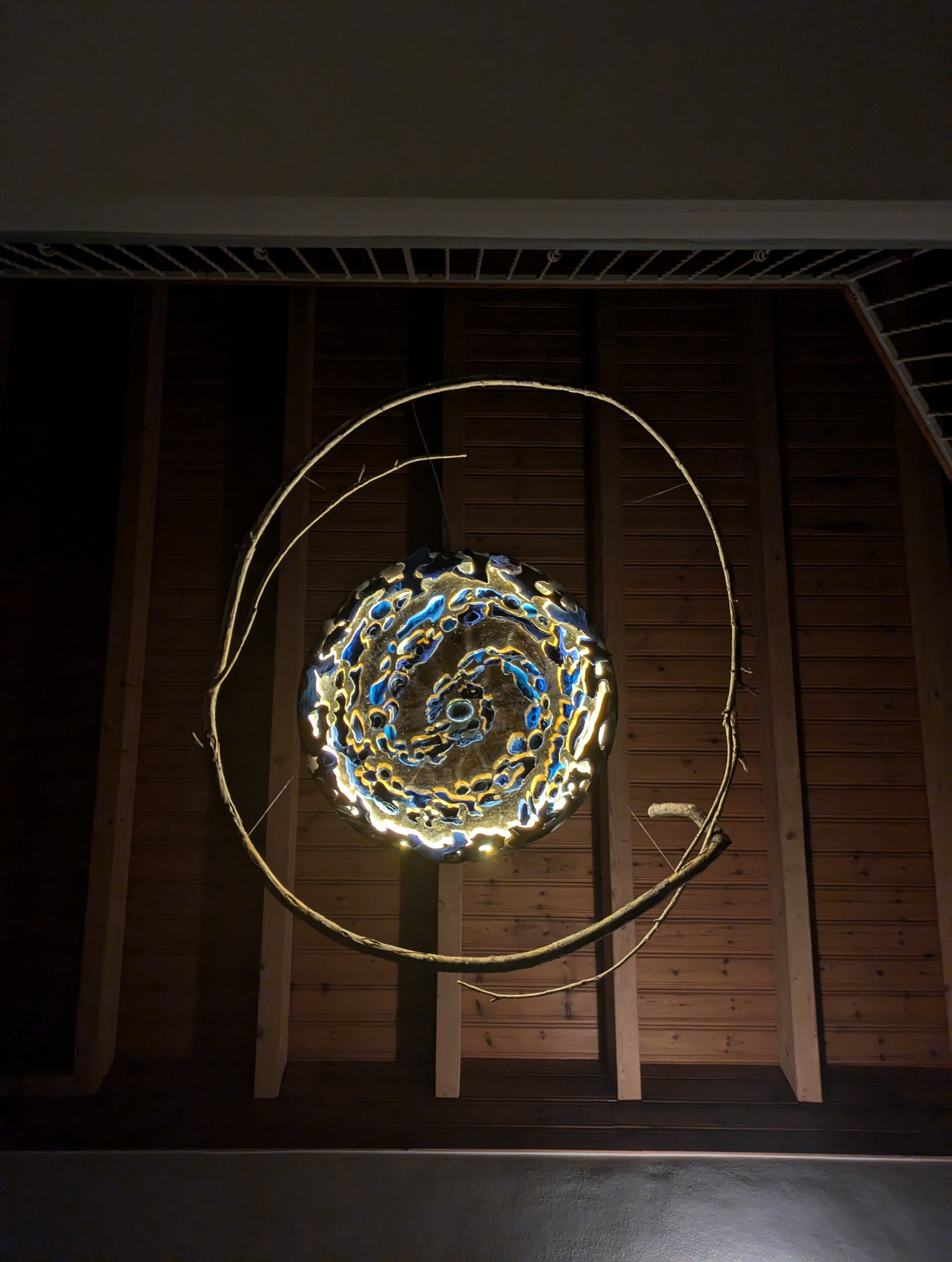 The lamp’s design centers around the blue bark, positioned a few centimeters above a reflective gold layer. This creates a captivating play of light and shadow, mimicking sunlight filtering through water.
