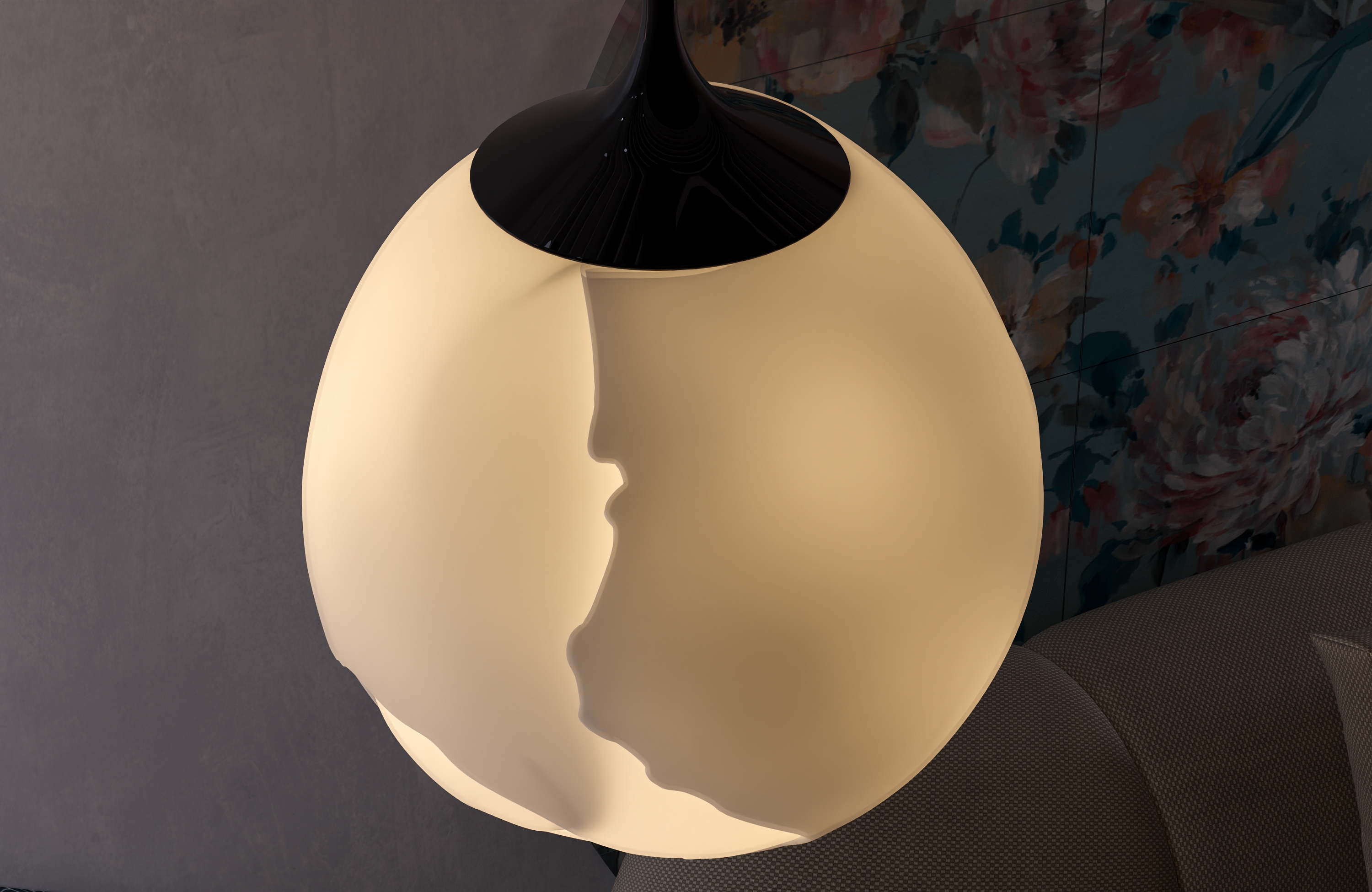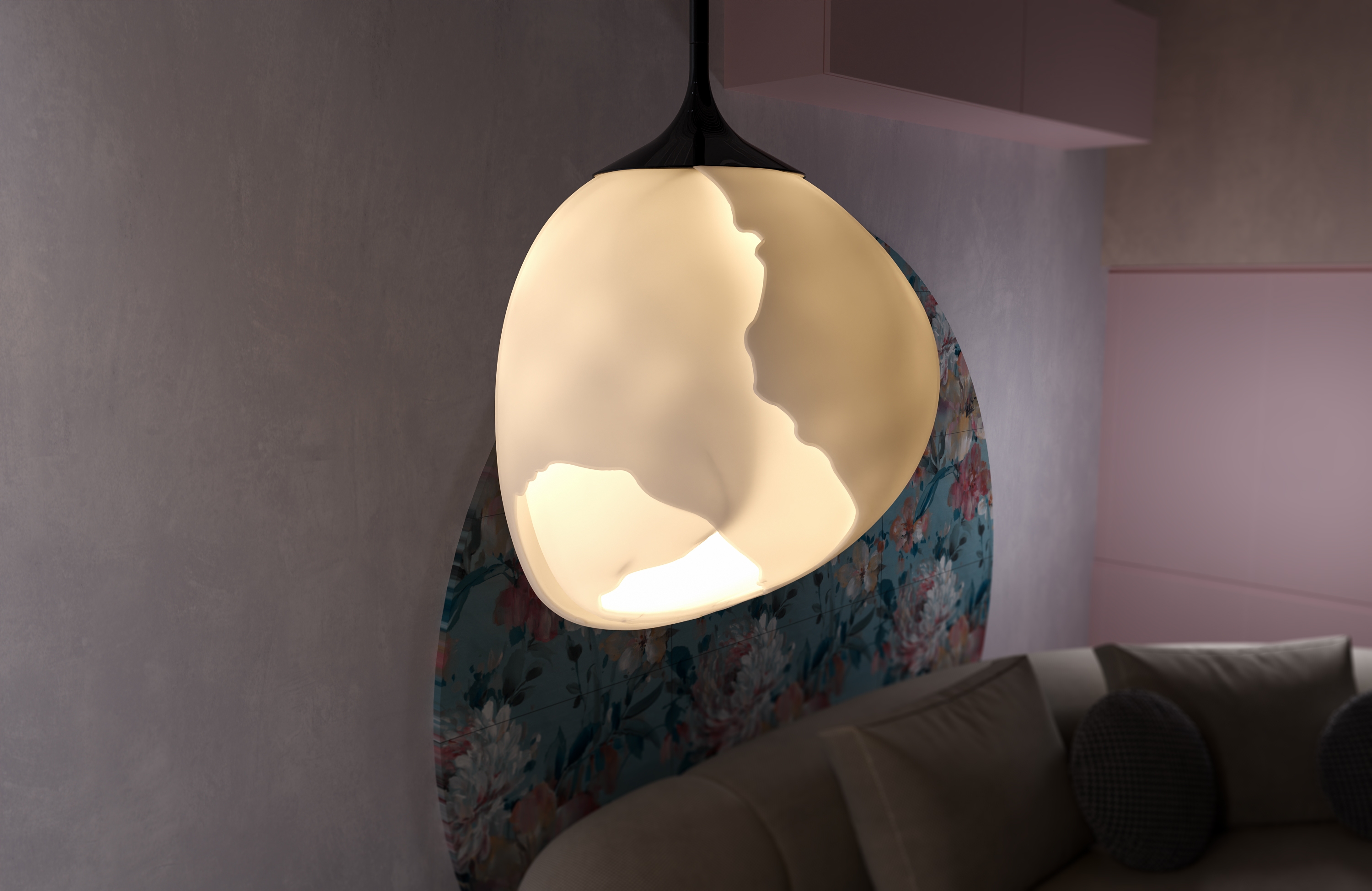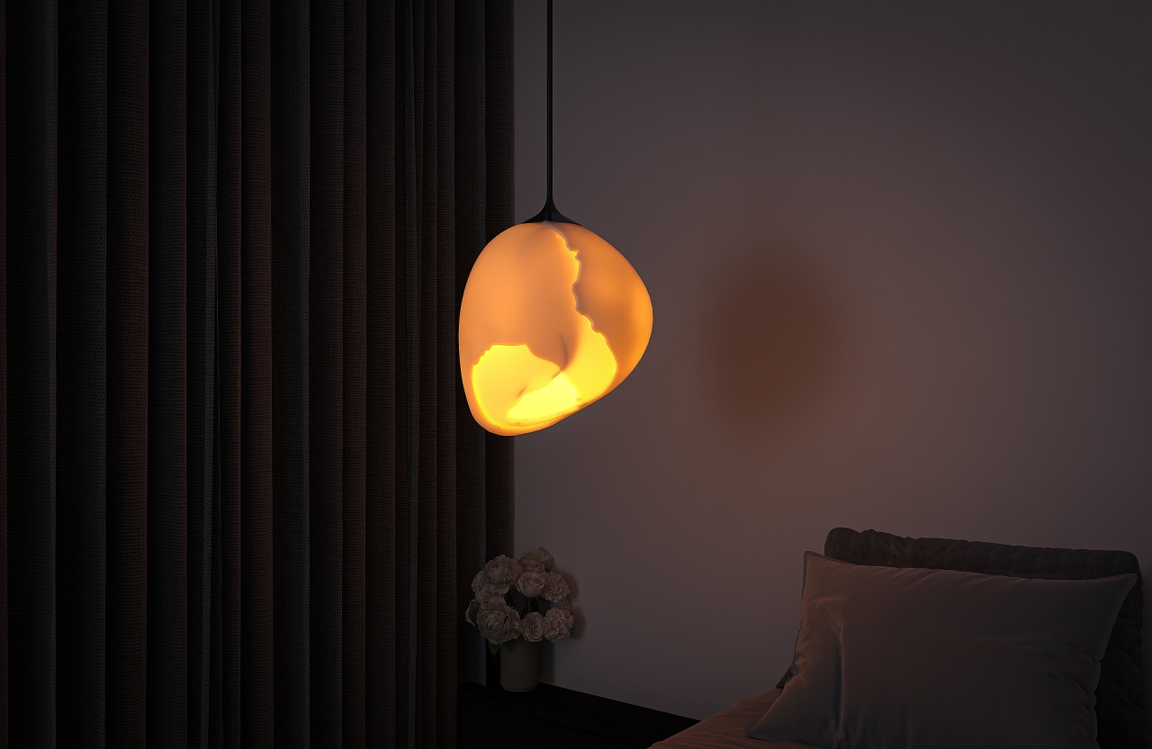 This lighting design incorporates the concept of birth and rebirth. Its organic and shell-like structure displays a symbolic form of the cycle of life; As if from the heart of the created cracks, a light that is a symbol of life gradually comes out and reaches the surrounding environment. This lamp somehow portrays the contrast between fragility and strength with a display of irregularly formed cracks on its surface.