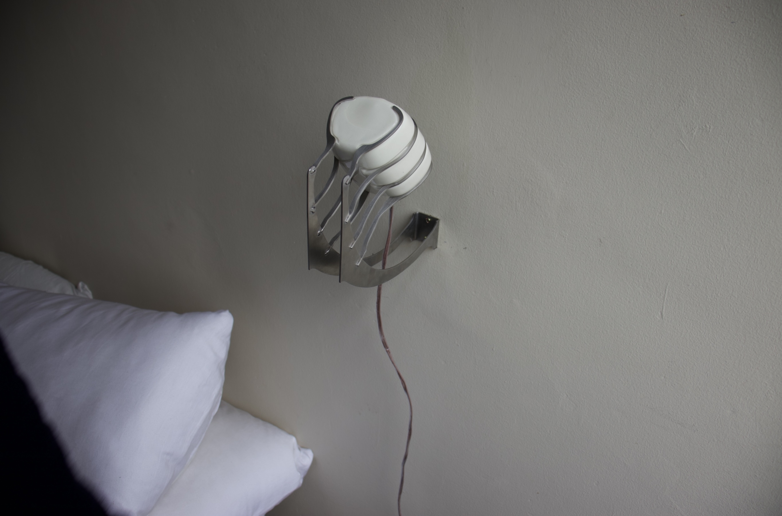 It is made from glossed porcelian that is wrapped tight by a rib cage of machined stainless steel metal. It is a balance between grotesque and ugly both at once. It employs heavy duty fabrications and techniques to make corperal forms that are simultaneously chic, erotic and alien.