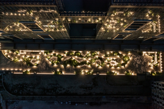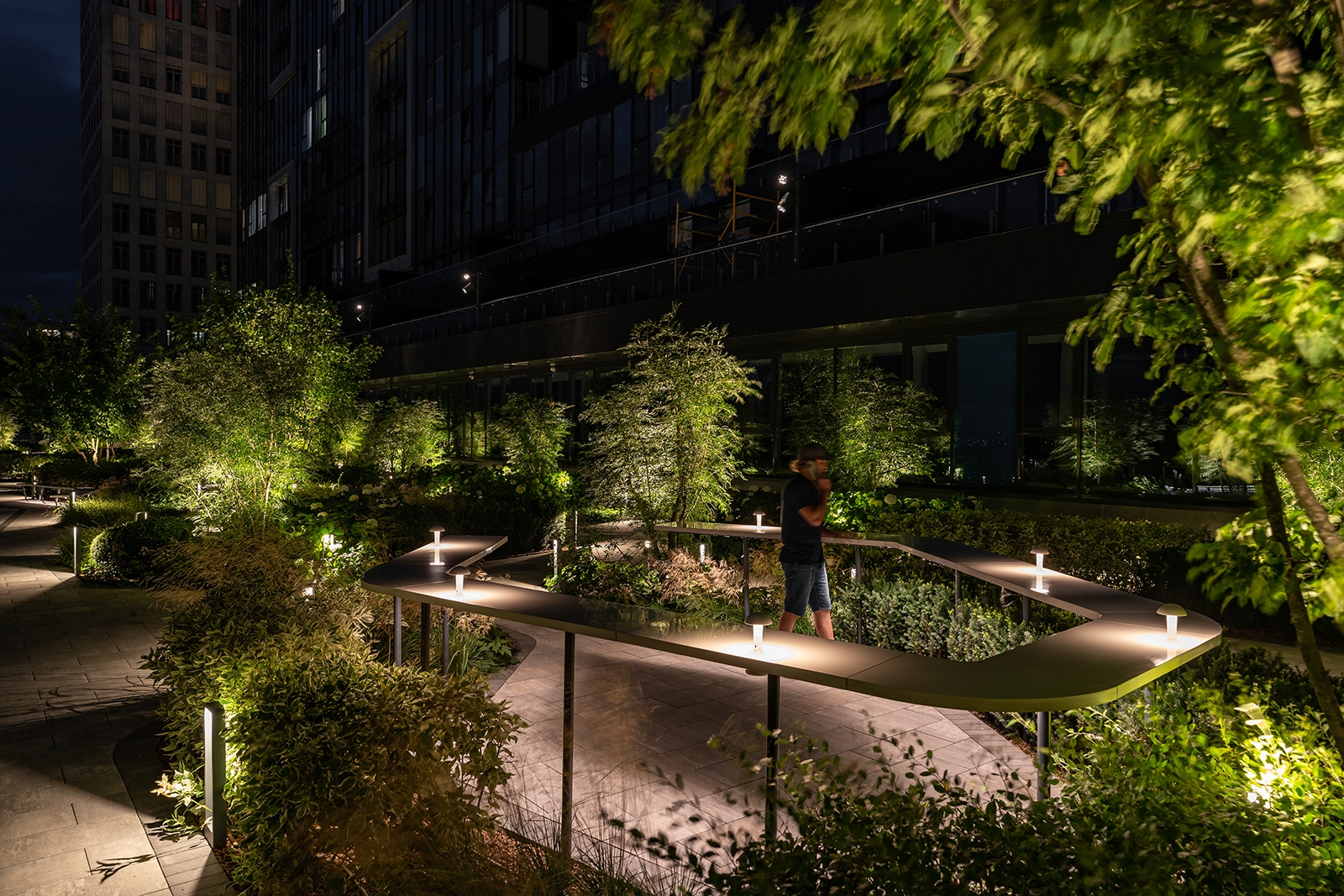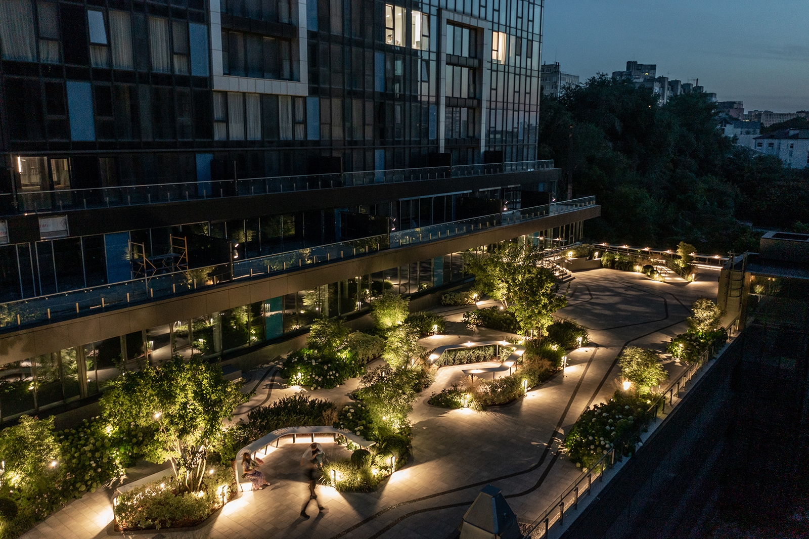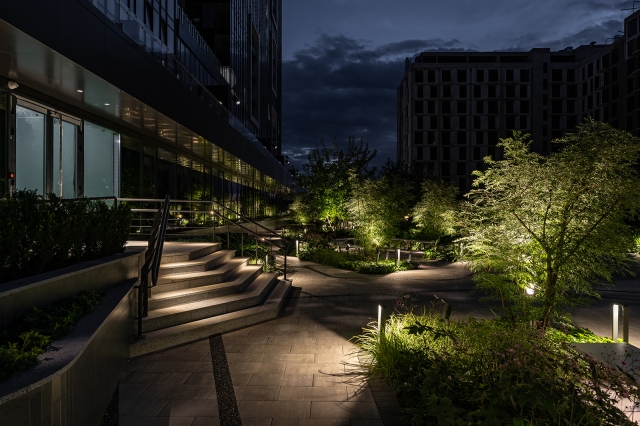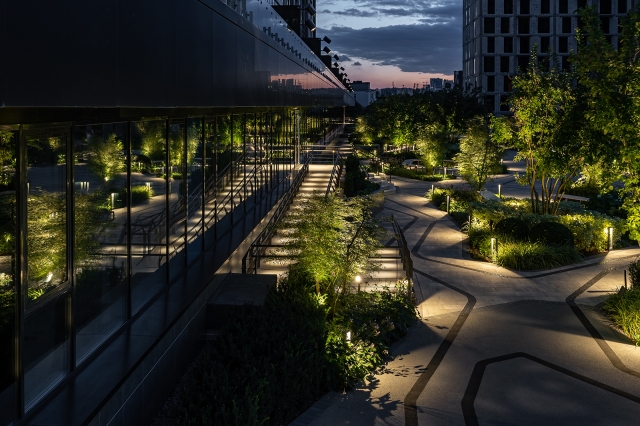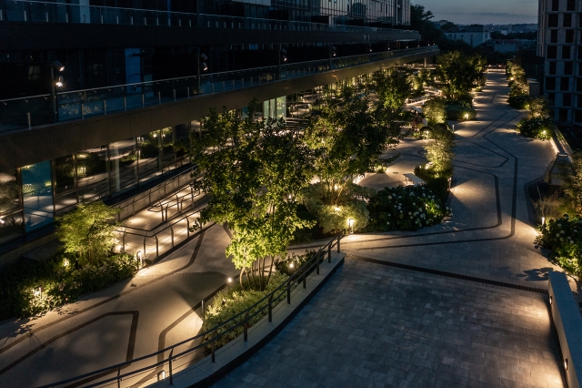 To avoid installing supports on the ground, we mounted these fixtures on the building’s facade, equipped with specialized optics, and directed them from the side to create a unified light pattern across the entire area. We integrated lighting into fences, benches, bar counters, and mushroom-shaped lanterns, which adds atmosphere and harmony to the whole space.