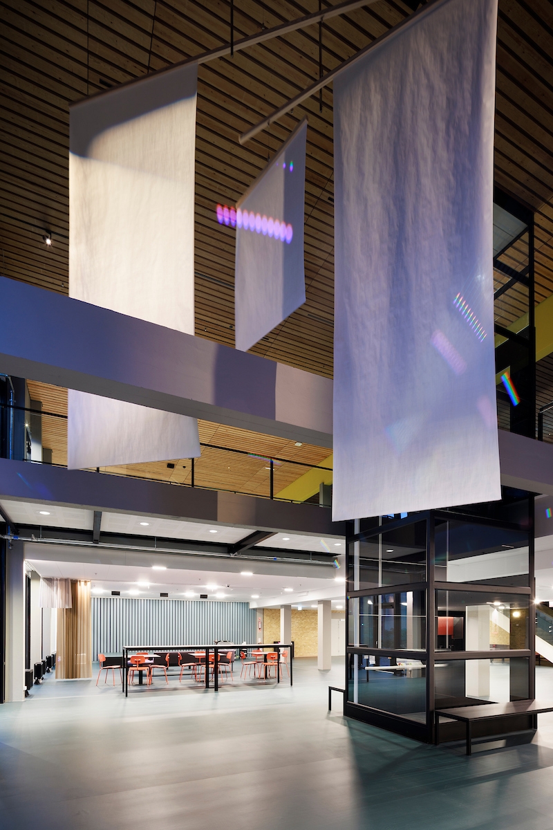 Through the lighting design, the building becomes emblematic of a vibrant, 24/7 campus. As darkness falls, the facades are lit with subtlety and the building becomes a lantern in the landscape. Passers-by can orient themselves and experience improved security and comfort. Upon entry, well-positioned light embraces a sense of safety and minimizes reflections, enabling views to the exterior despite the darkness outside.