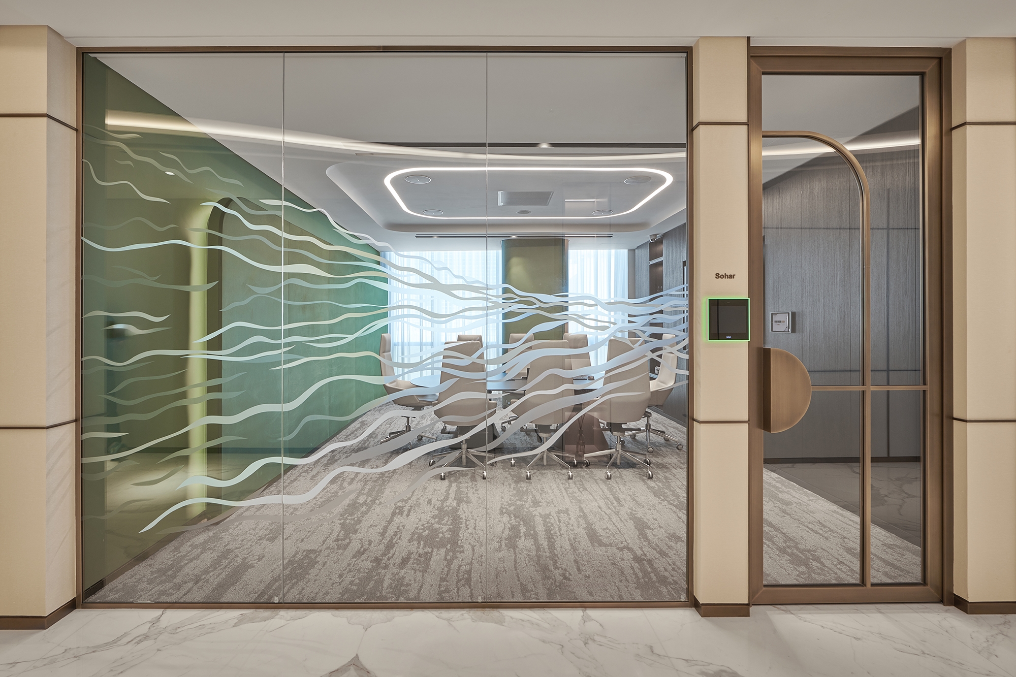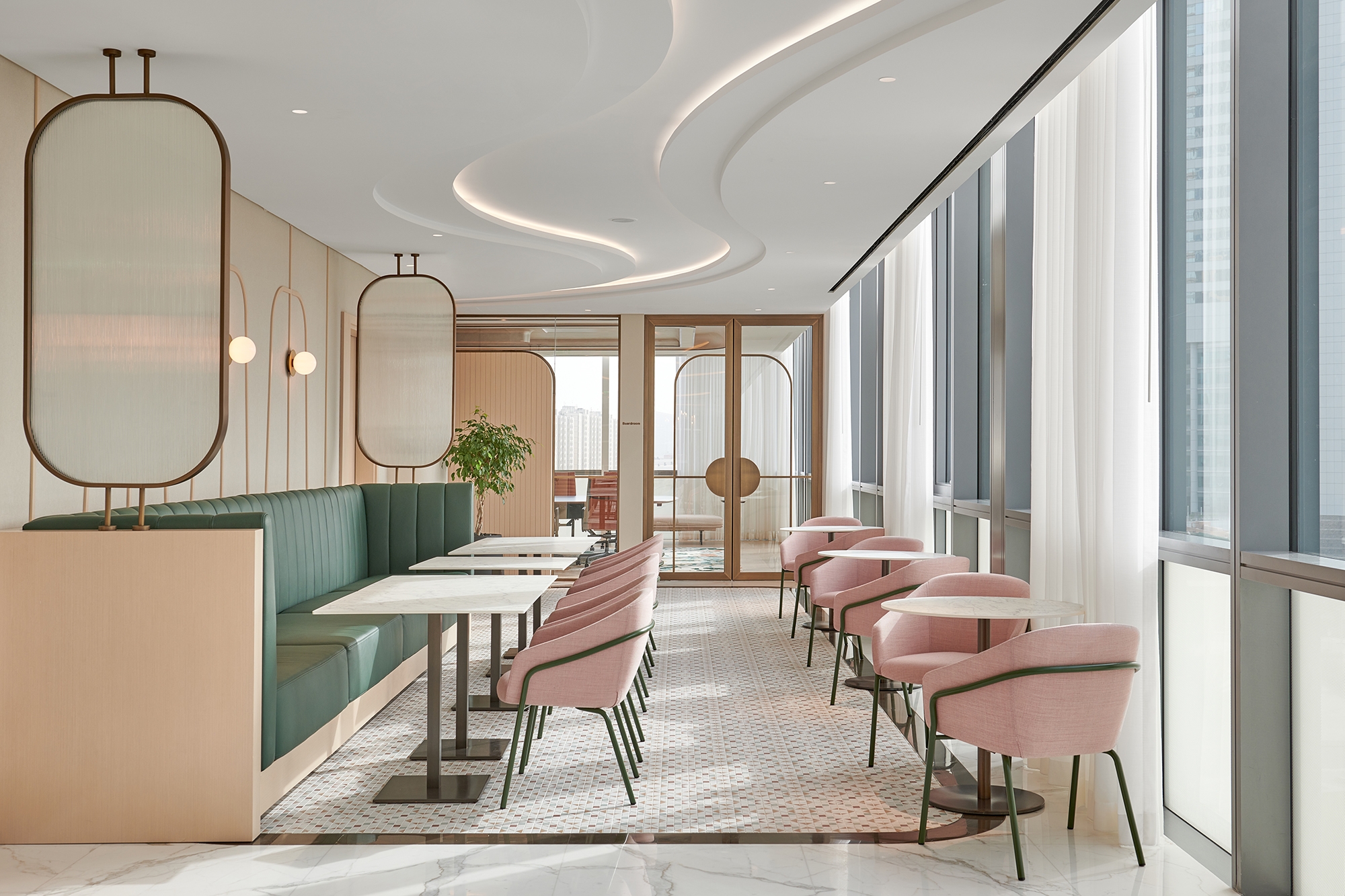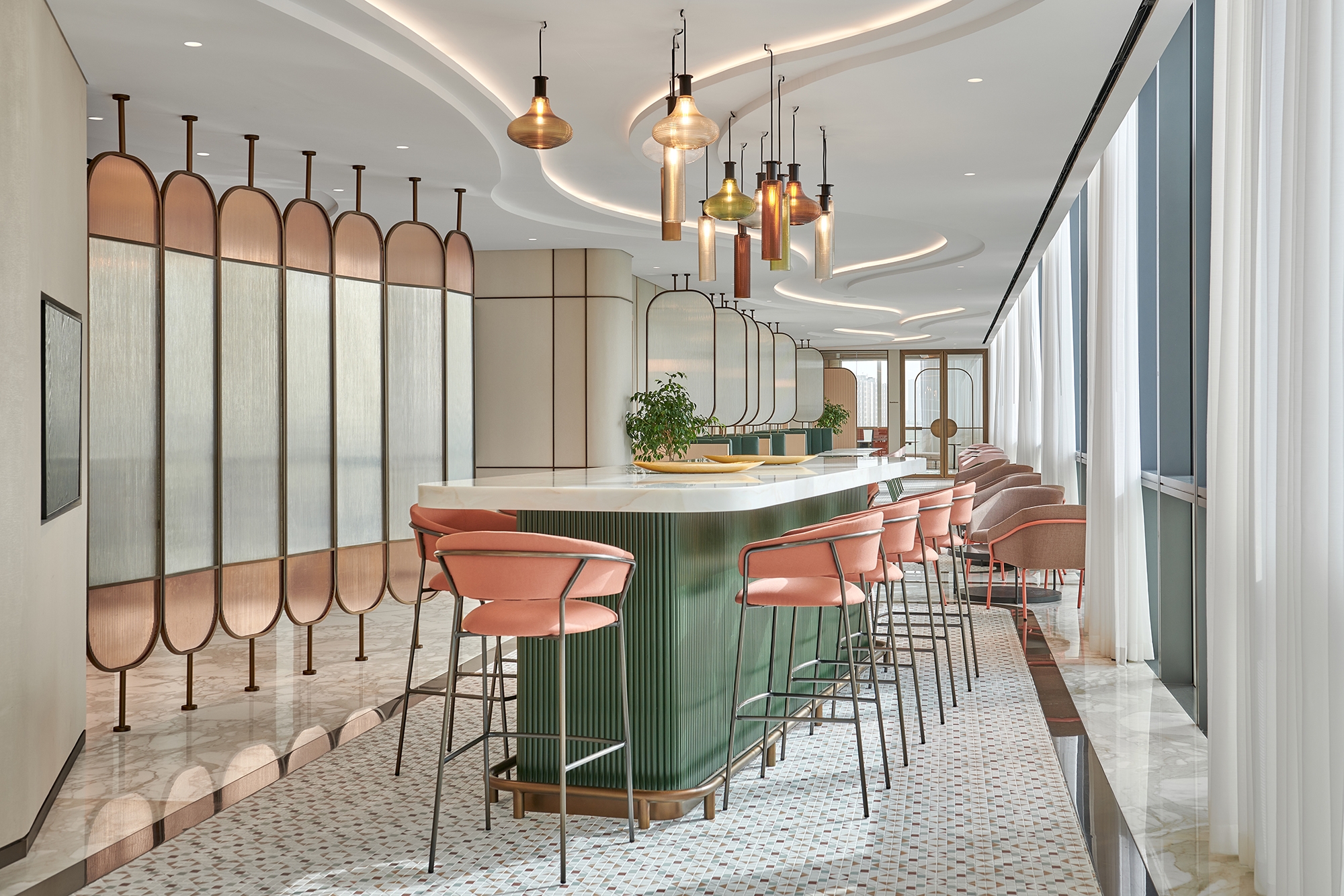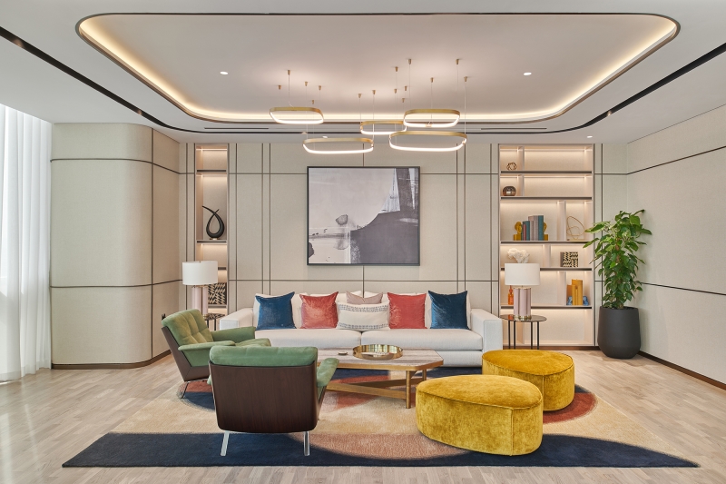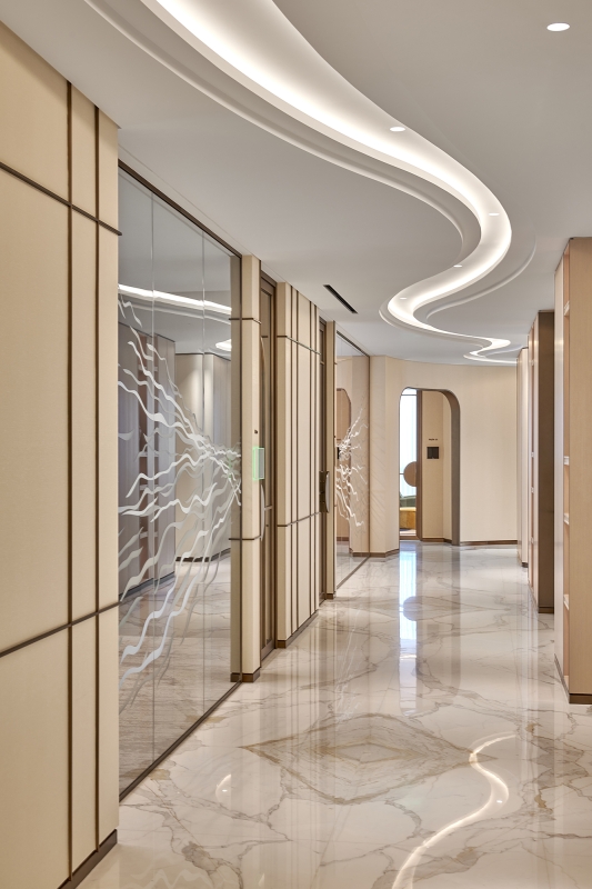 Curved lines of light run throughout the entire scheme, uniting the communal areas and connecting spaces with a consistent design language. Elegant and harmonious, this steady flow of light becomes an energizing current that helps to aid transitions and animate each space.