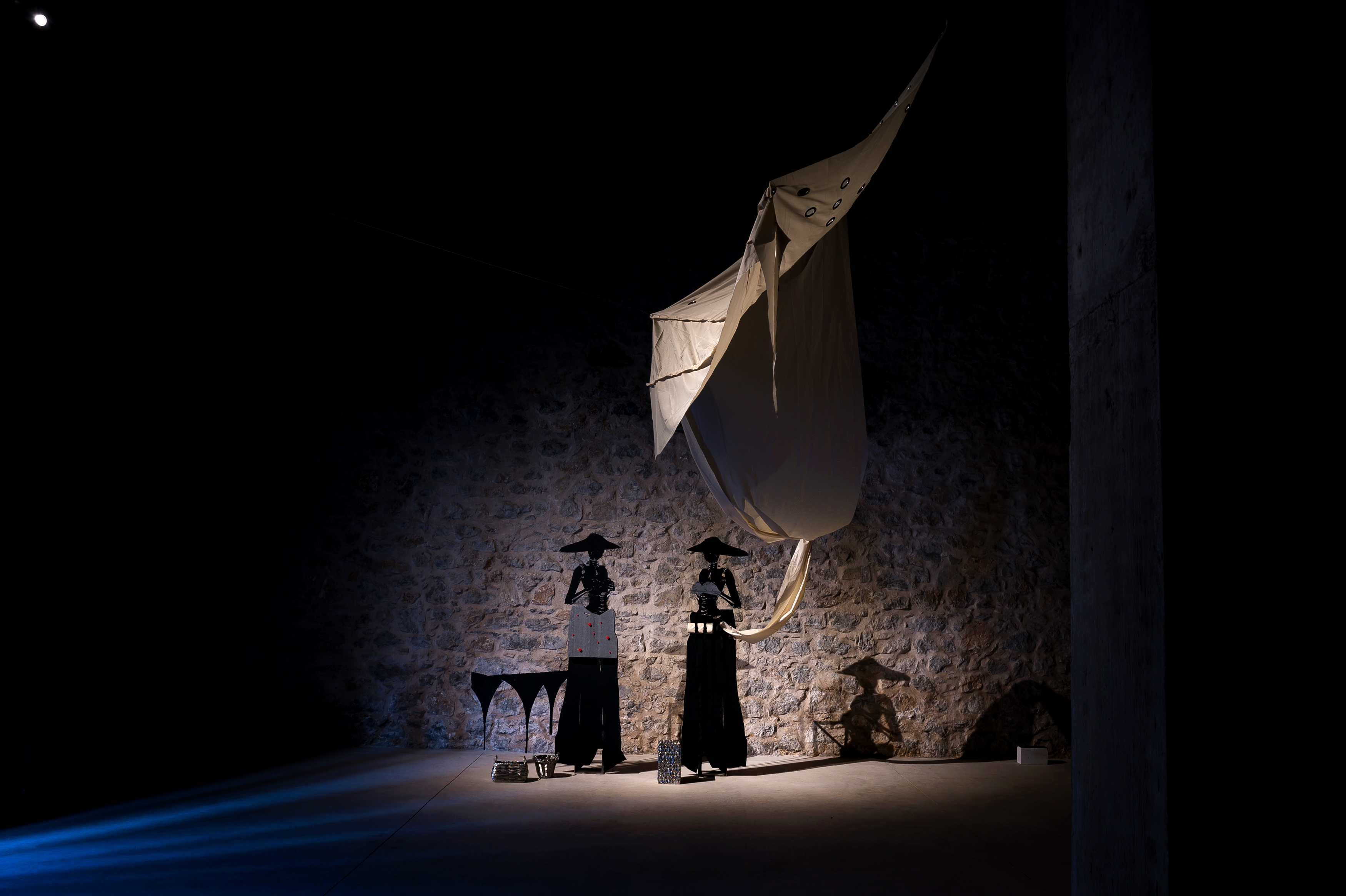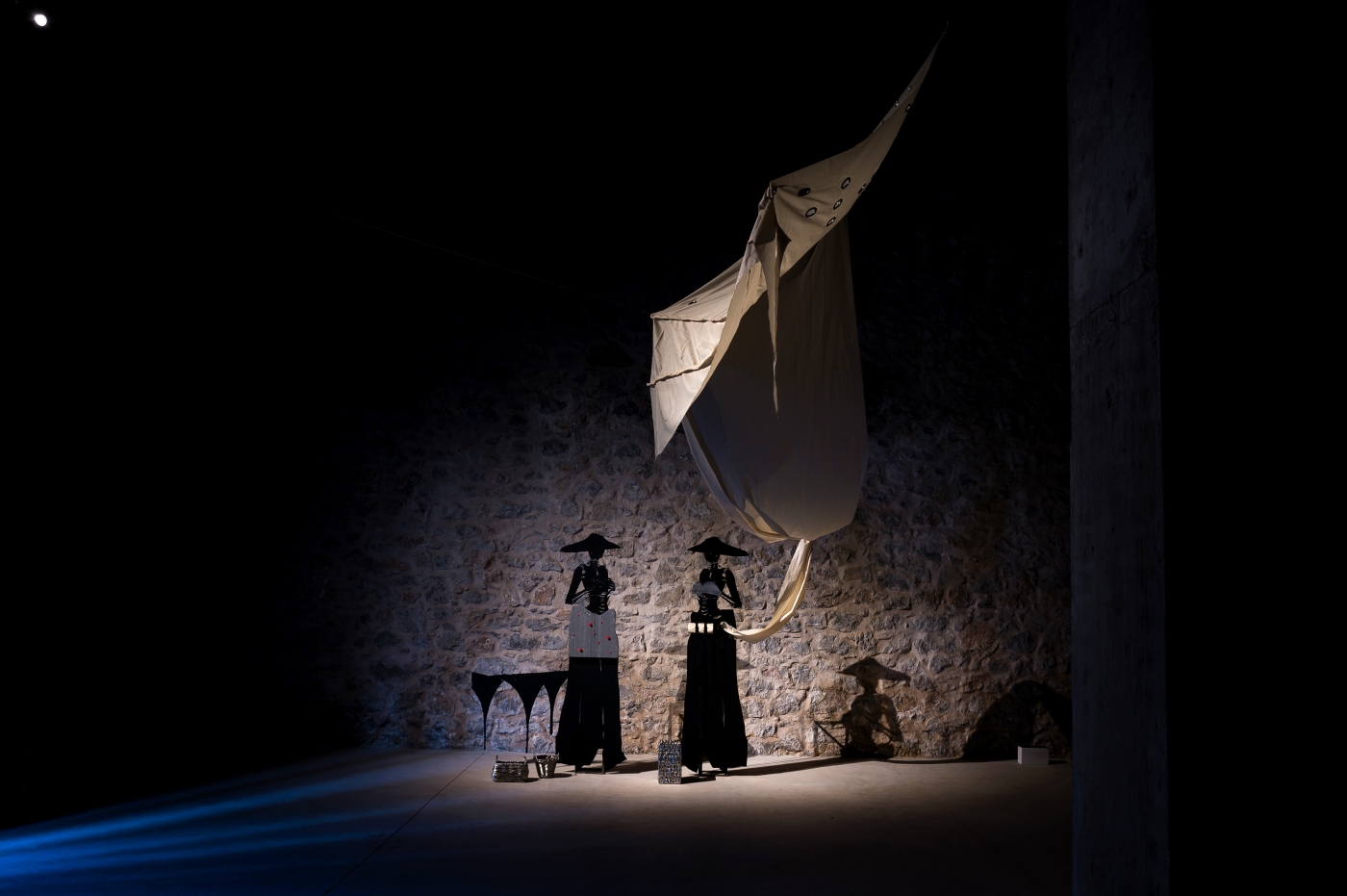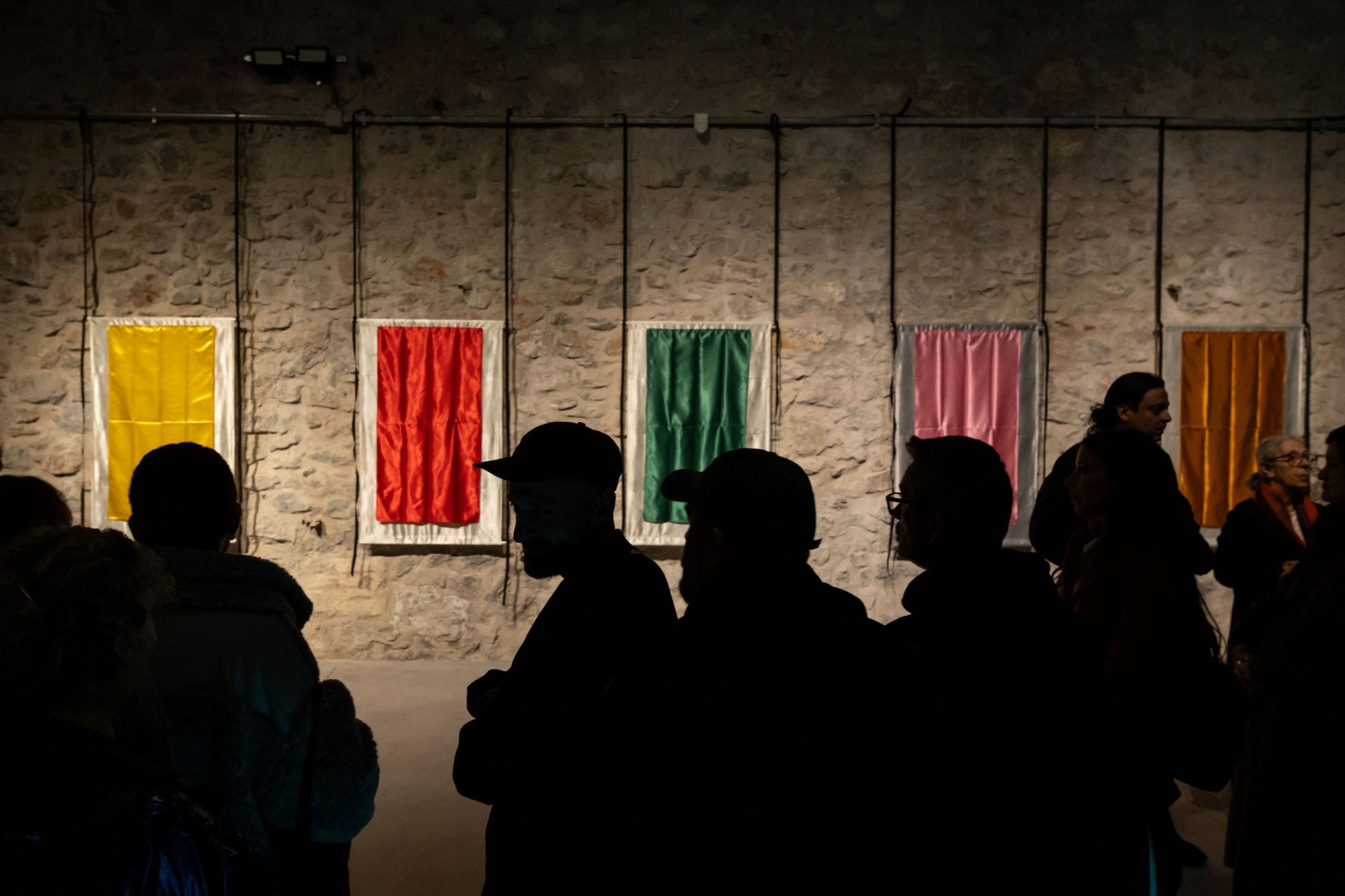 During the opening night, the dark parts of the exhibition were filled with pools of light, marking the route of a performance, thus creating a momentary stage, with the audience still in the darkness of their wondering.