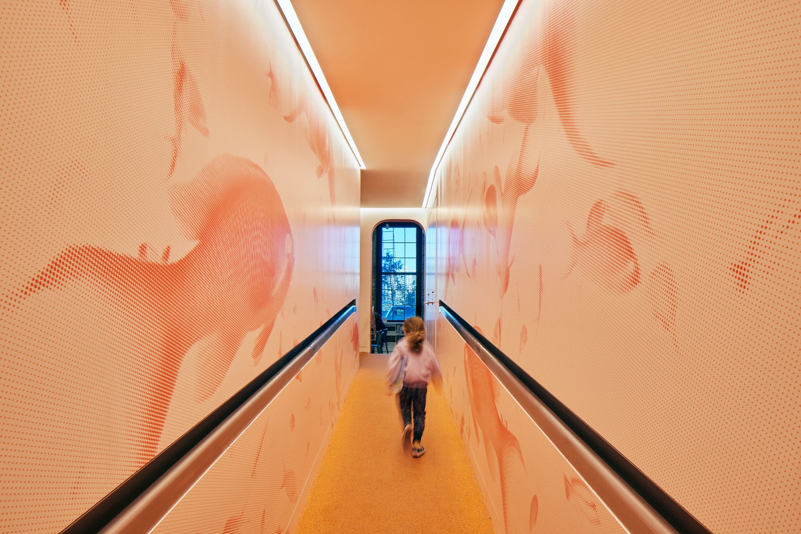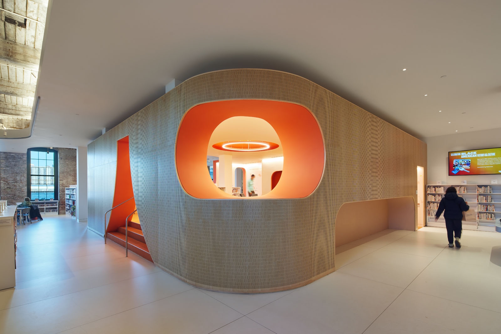The library intentionally places the children’s reading room at the heart of the space, as this particular program was lacking and important to residents in the surrounding neighborhoods. The lighting emphasizes this center, with continuous perimeter mounted LED fixtures along the walls of the space to highlight the curving forms and graphic wall coverings, paired with a circular up/down pendant in a colorful ceiling pop-up.