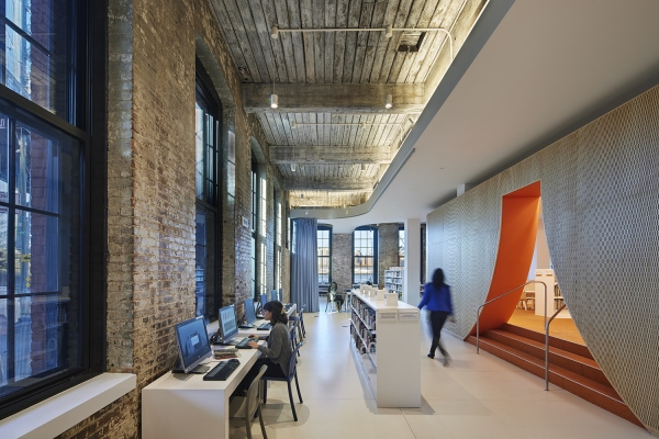 Sustainability ApproachThe existing wood construction ceilings and brick walls were exposed in early demolition and preserved, becoming an important feature in the final design. The existing ceilings are highlighted with asymmetric uplight coves from the ceiling planes that were added to house other architectural services, providing a visual connection to the rich history of this culturally and historically diverse neighborhood.
