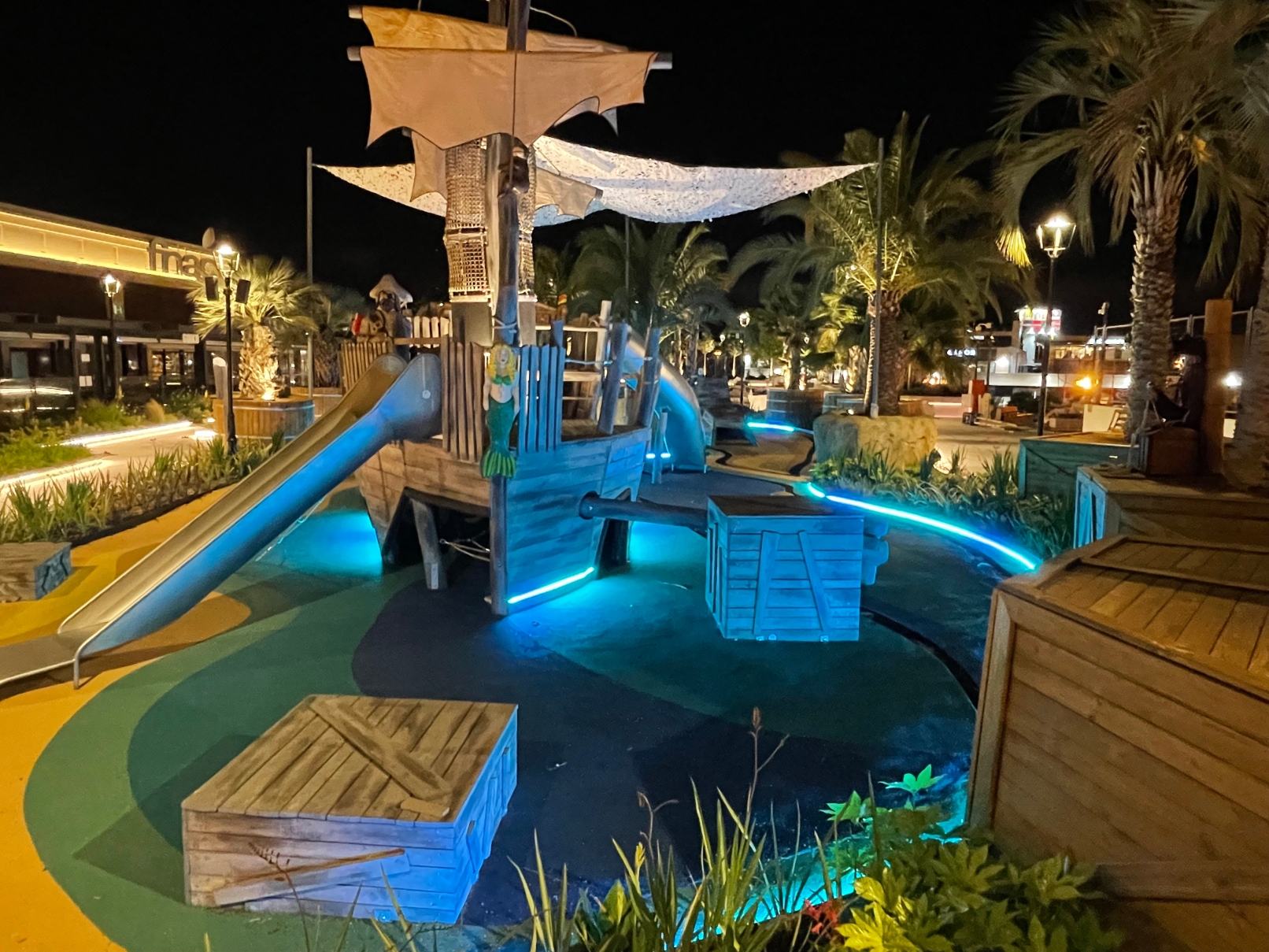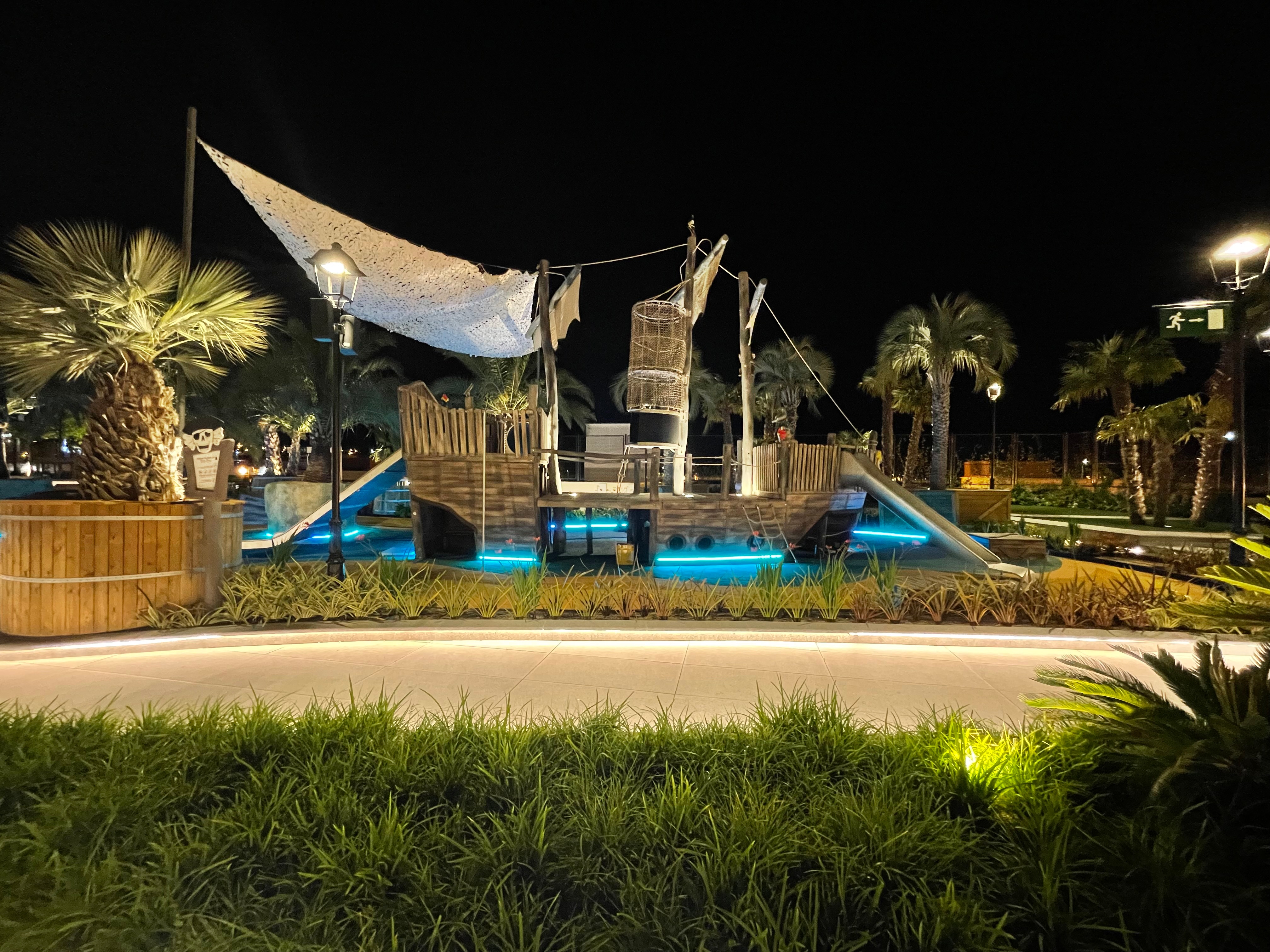 Sometimes fixed warm light for a calm enchanted walk, others digital to make external, the happenings inside the building, or colored and digital to make the surroundings of the pirate ship, to move like a turquoise ocean, or shift the game to a burning lava. The use of color, very carefully chosen where to be used, and programming made to be smooth, slow, and timeless. The Lighting is designed, aiming for a very high visual comfort, light pollution control, actively helps the public with the wayfinding as well as the recognition of the architecture and different uses.