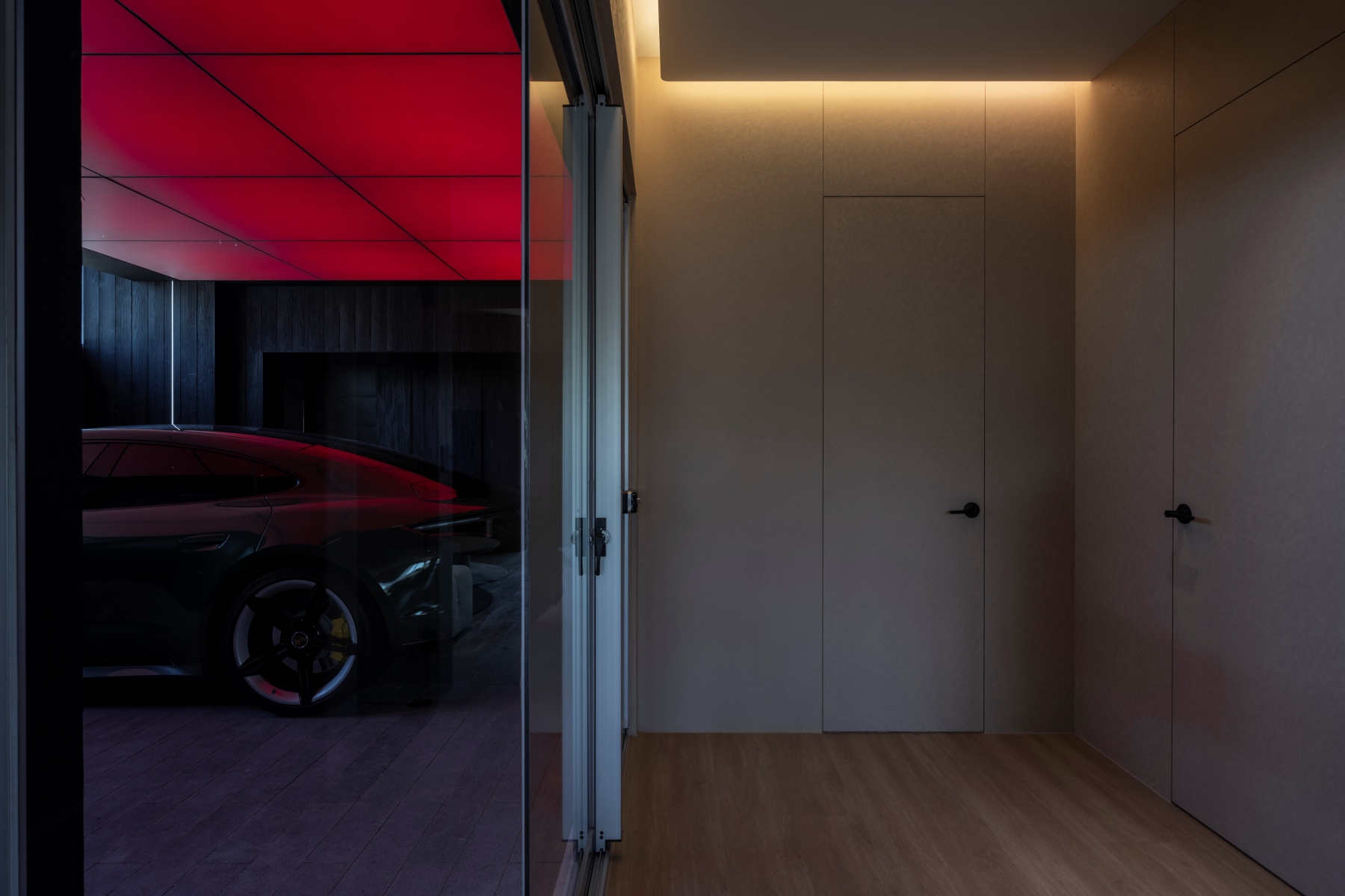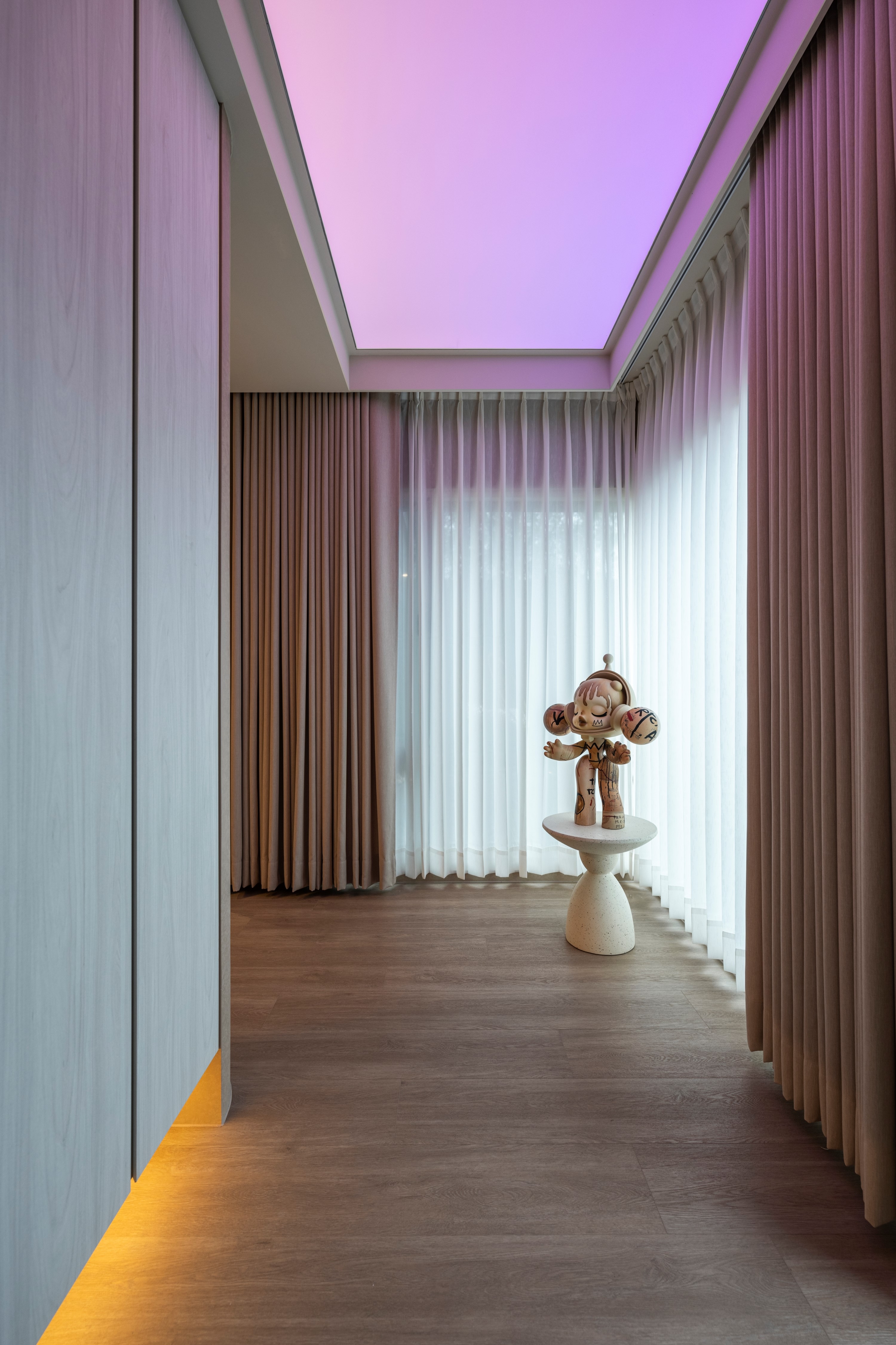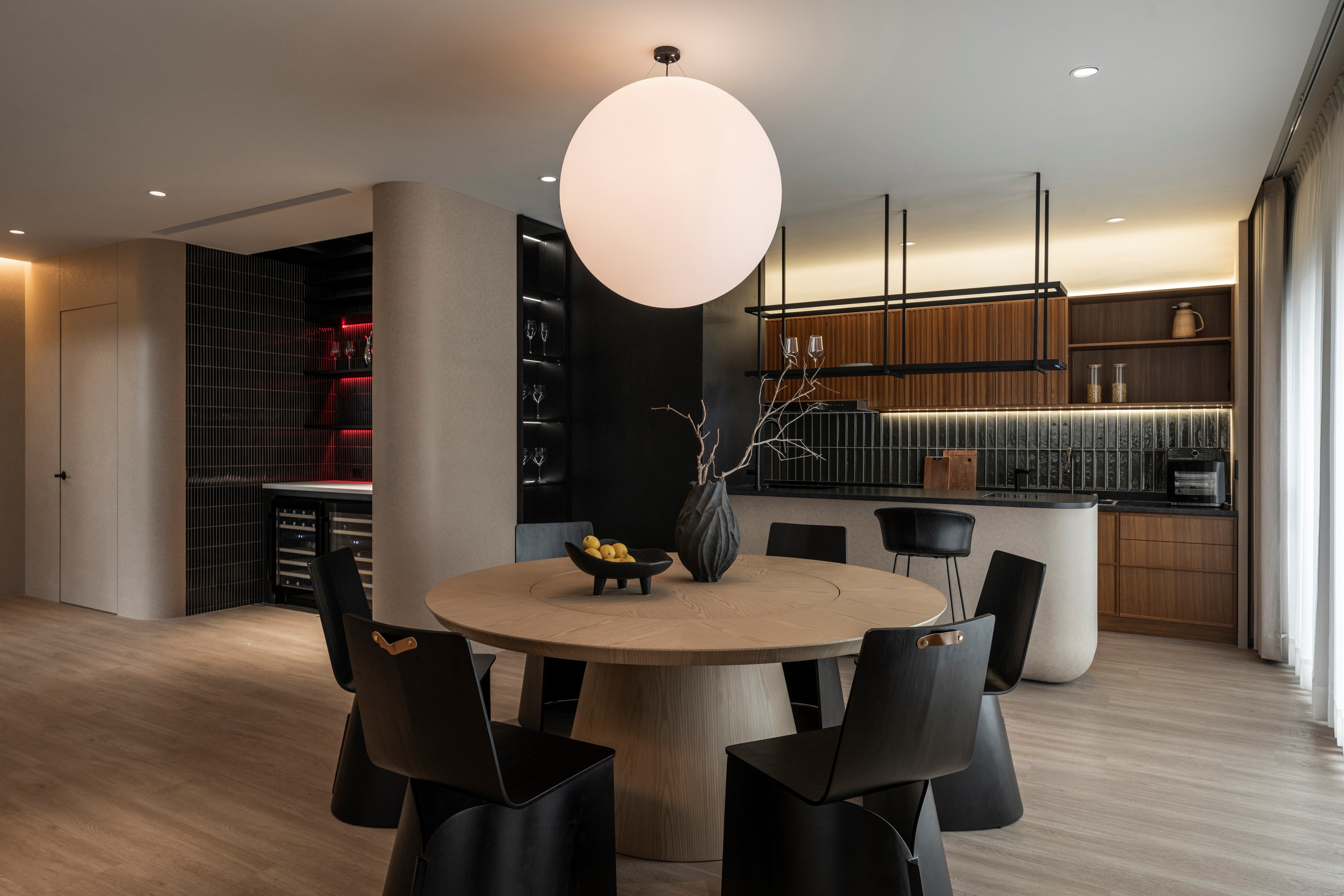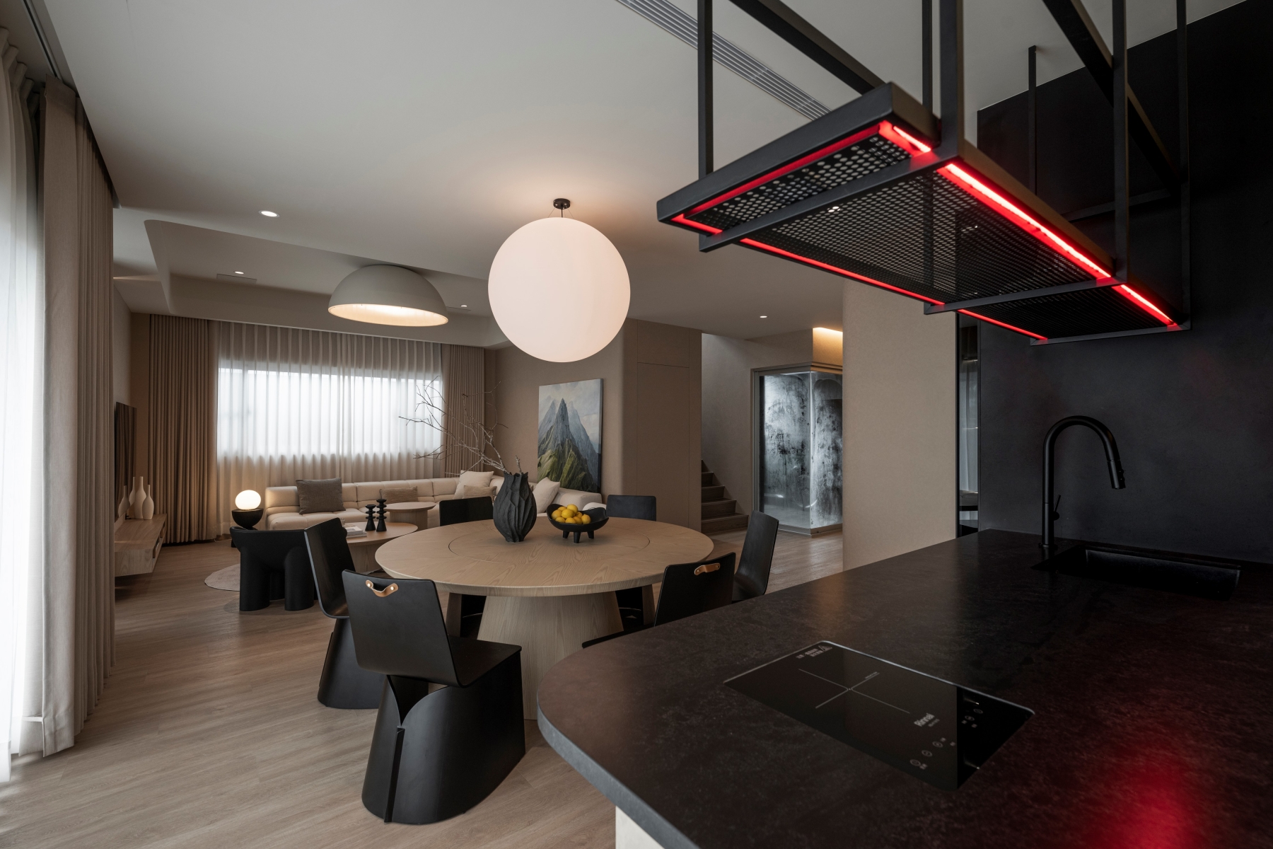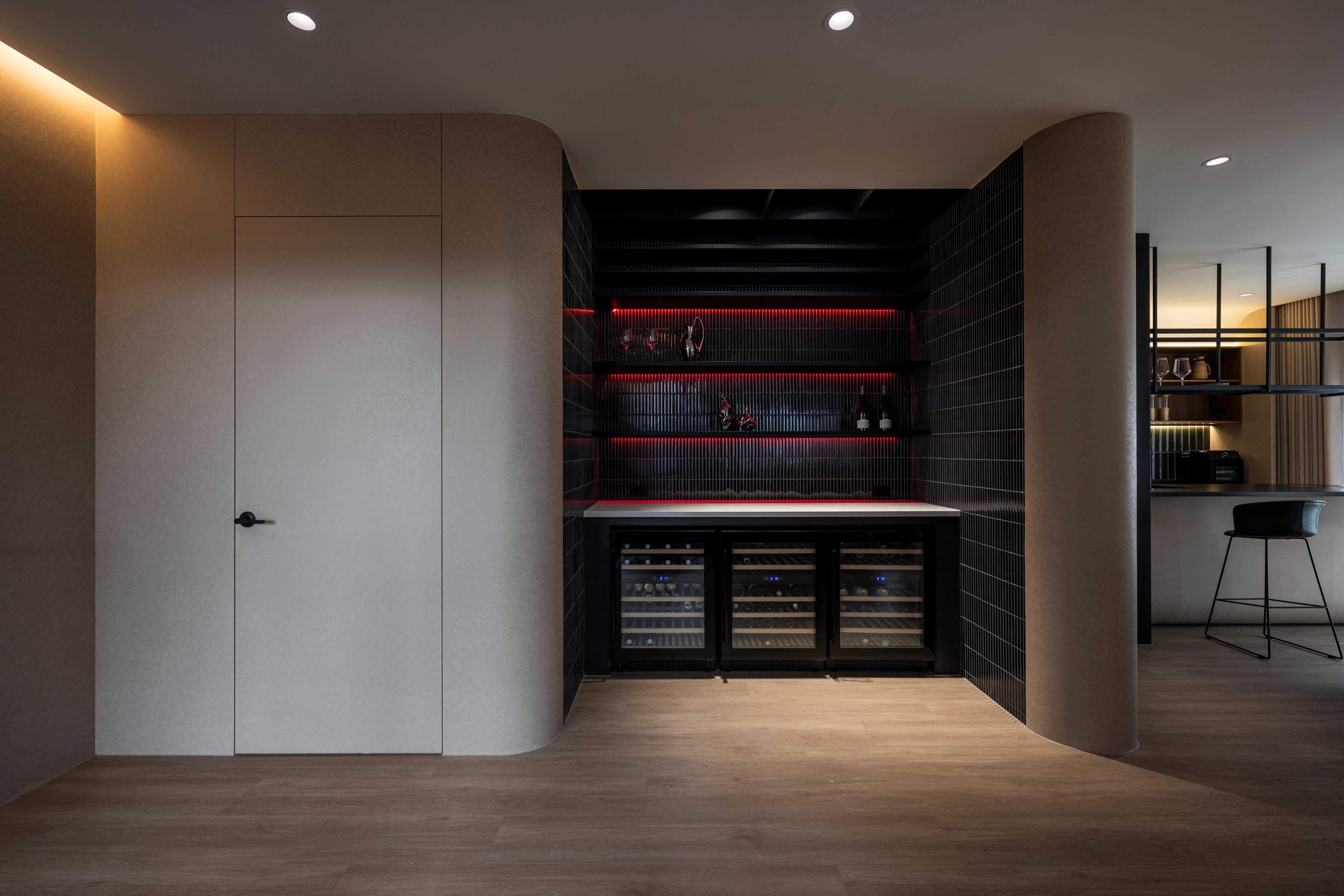 In contrast, the common areas and bedrooms are centered around a warm, nature-inspired ambiance. The recessed stretch light fixture on the stairwell ceiling echoes the pineapple fields outside, with the lights flowing like moonlight to connect the indoors and outdoors. Custom-made lighting in the living room creates a soft, natural glow. A modern wine bar with adjustable lighting is designed for the homeowners ‘s love of hosting. The stretch ceiling in the hallway offers a gentle transition between spaces, softening the flow with subtle lighting changes.