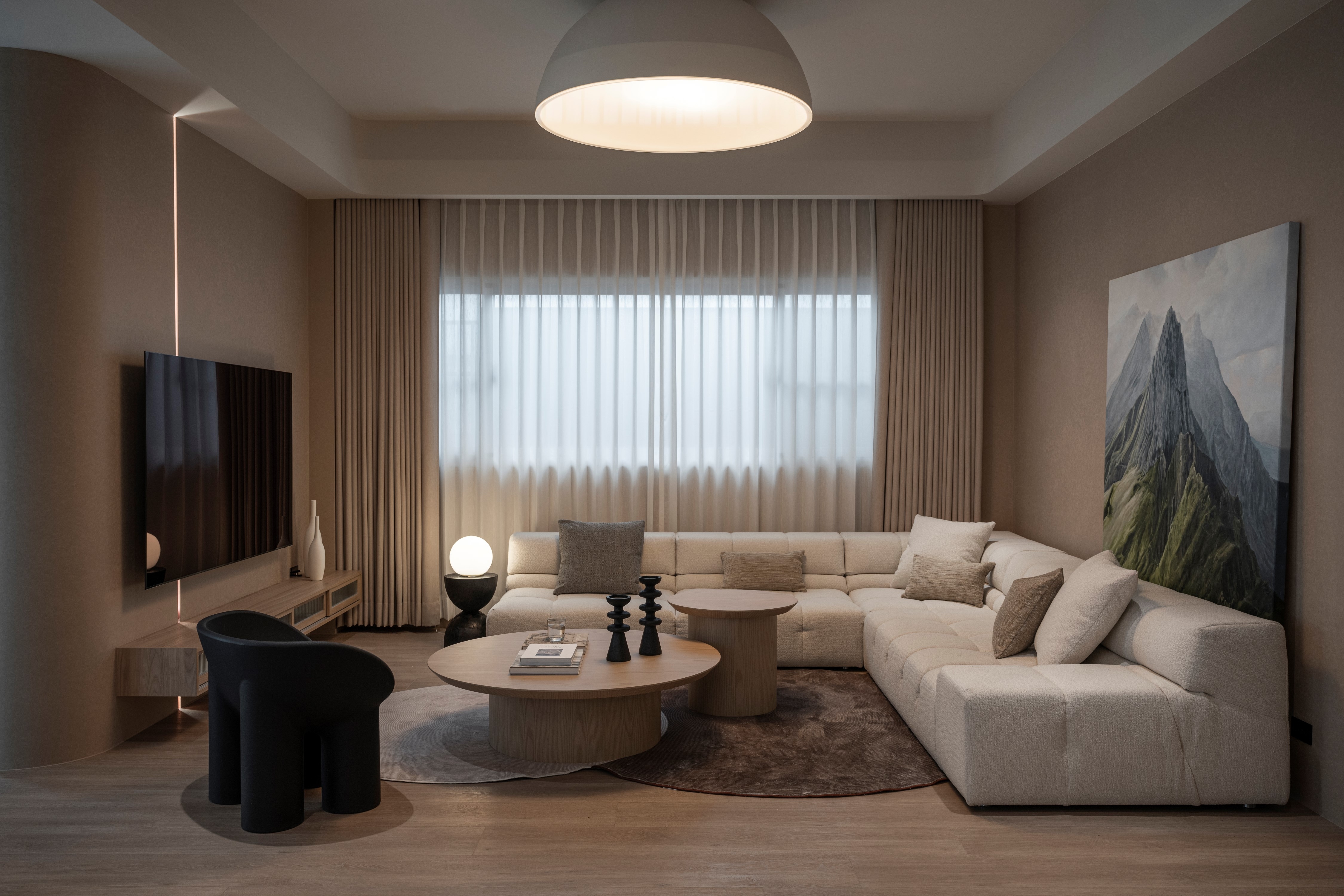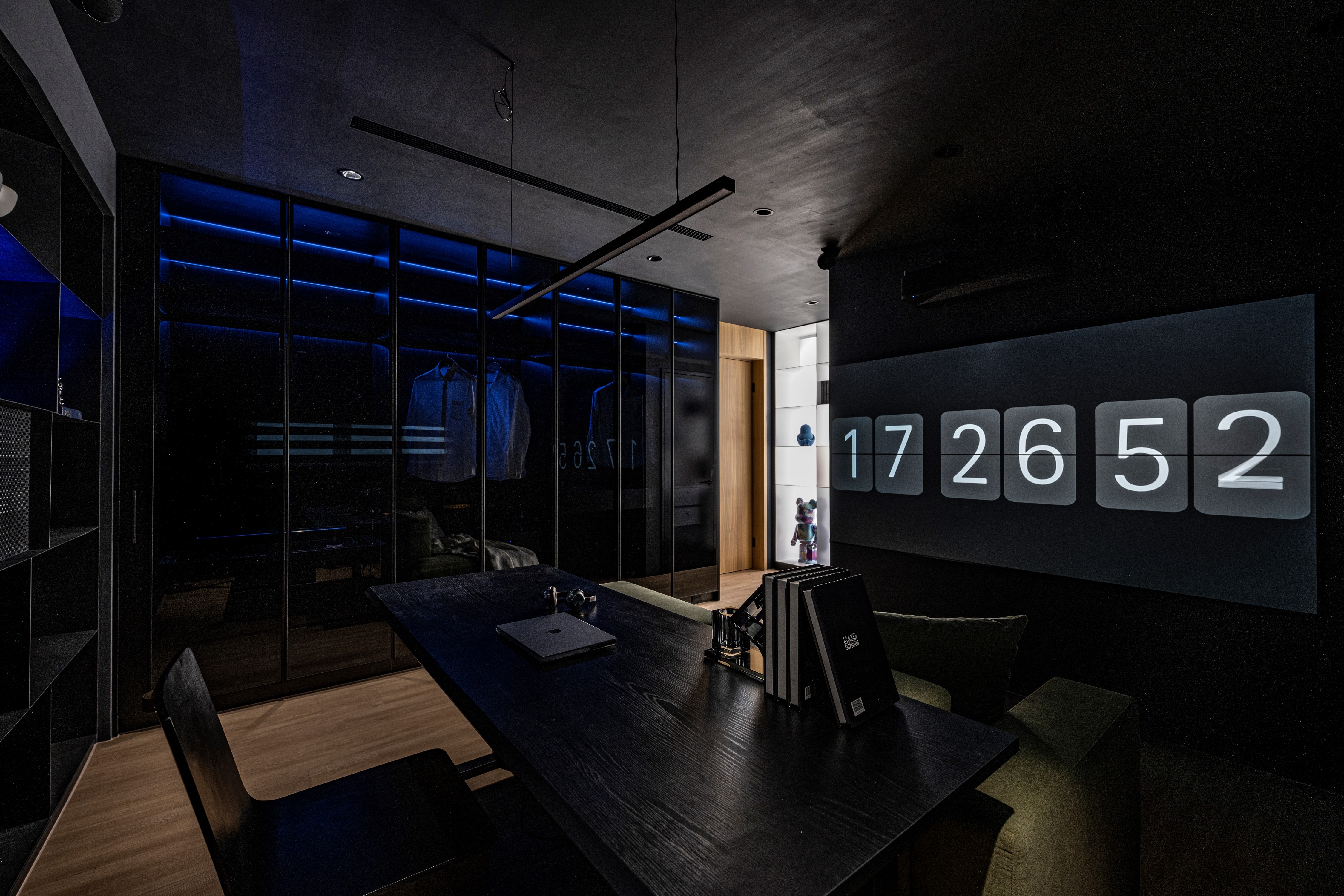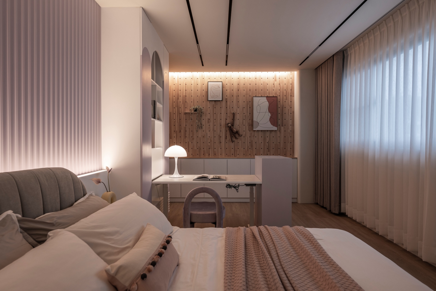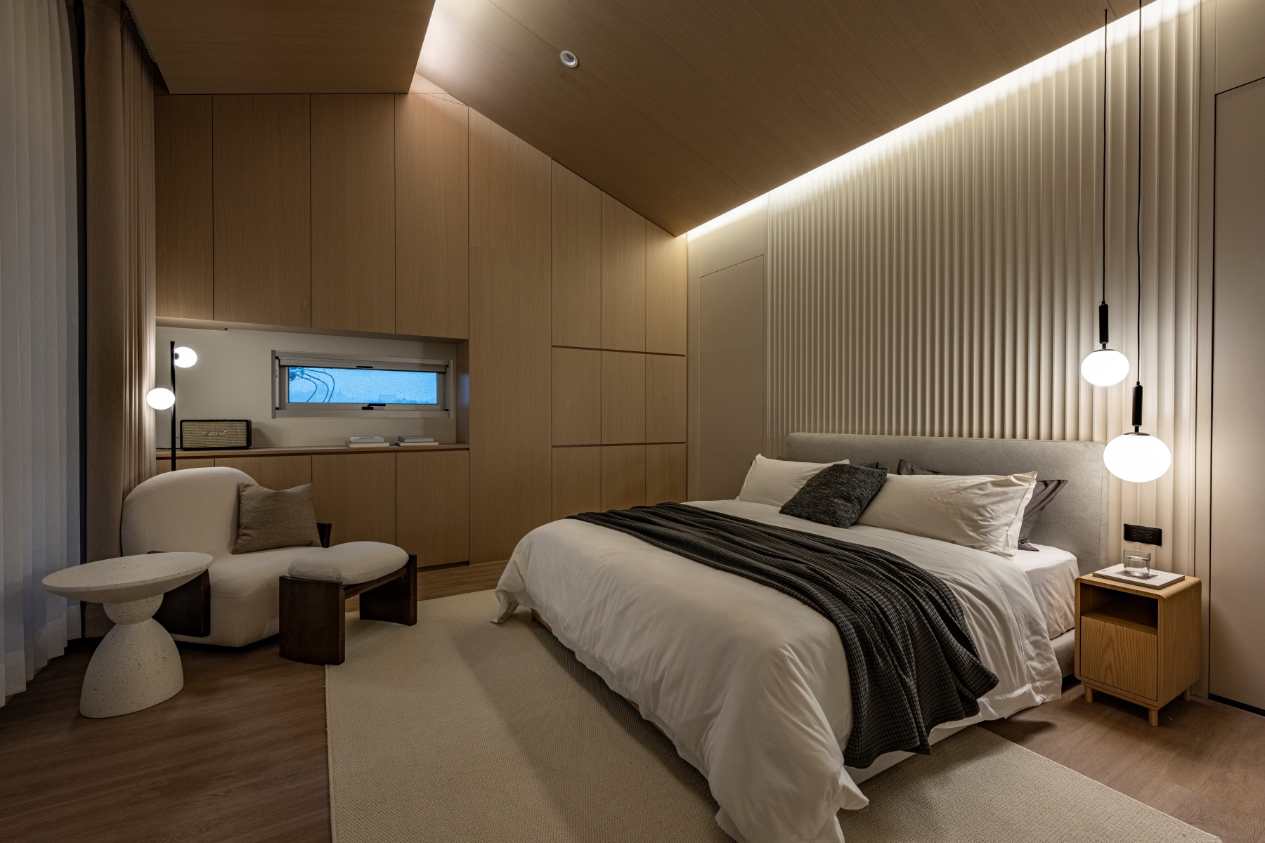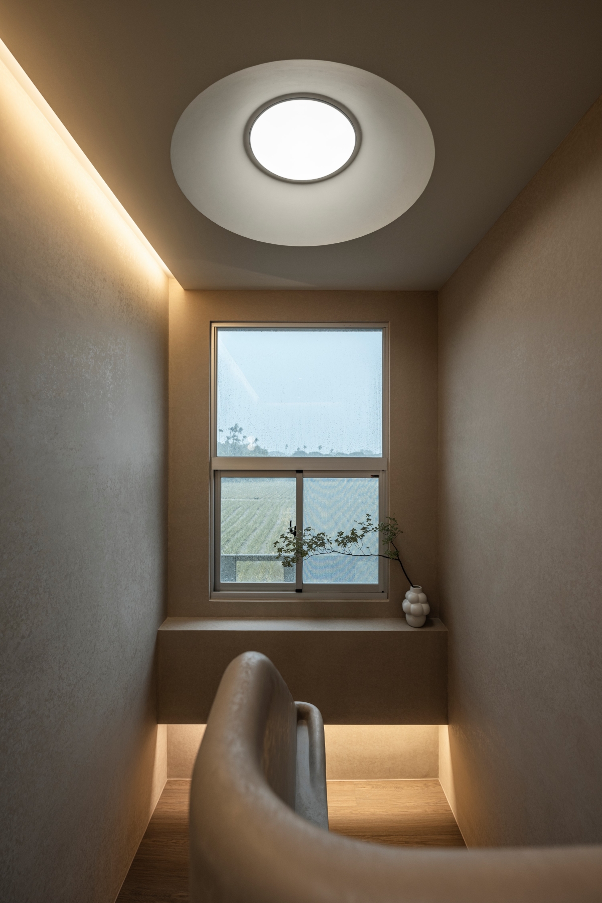 In contrast, the common areas and bedrooms are centered around a warm, nature-inspired ambiance. The recessed stretch light fixture on the stairwell ceiling echoes the pineapple fields outside, with the lights flowing like moonlight to connect the indoors and outdoors. Custom-made lighting in the living room creates a soft, natural glow. A modern wine bar with adjustable lighting is designed for the homeowners ‘s love of hosting. The stretch ceiling in the hallway offers a gentle transition between spaces, softening the flow with subtle lighting changes.