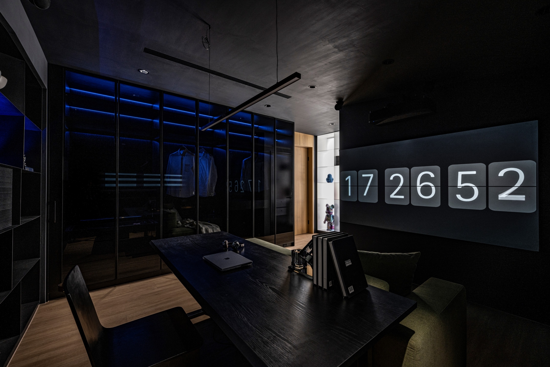 The goal of this design is the balance between modernity and warmth. The male-oriented spaces feature a sleek, high-tech style. The garage, equipped with sensor-activated illuminated stretch ceilings, is modeled after the famous Popsicle Studio LA set. The multifunctional room, serving as both a home office and media room, uses dark tones combined with adjustable RGB lighting for a refined yet playful atmosphere.