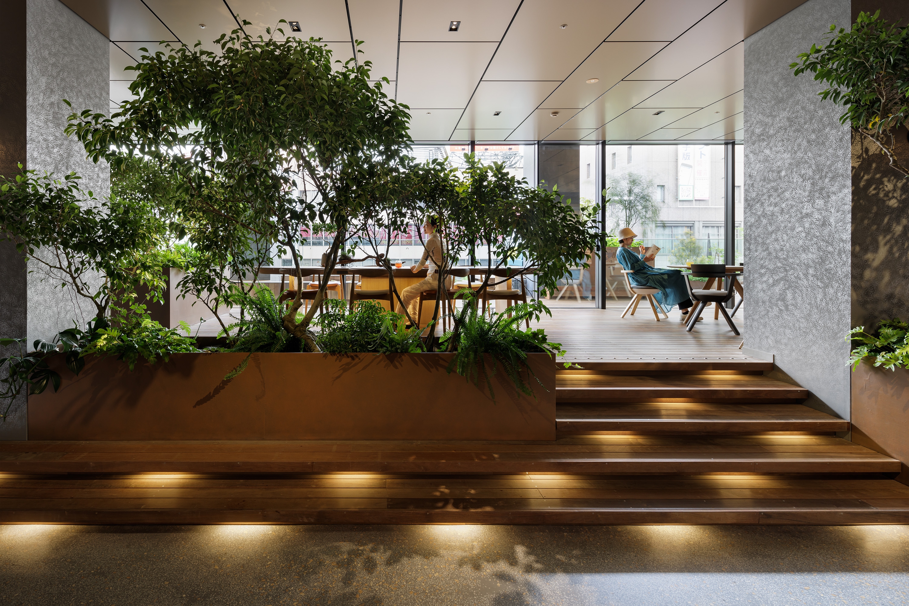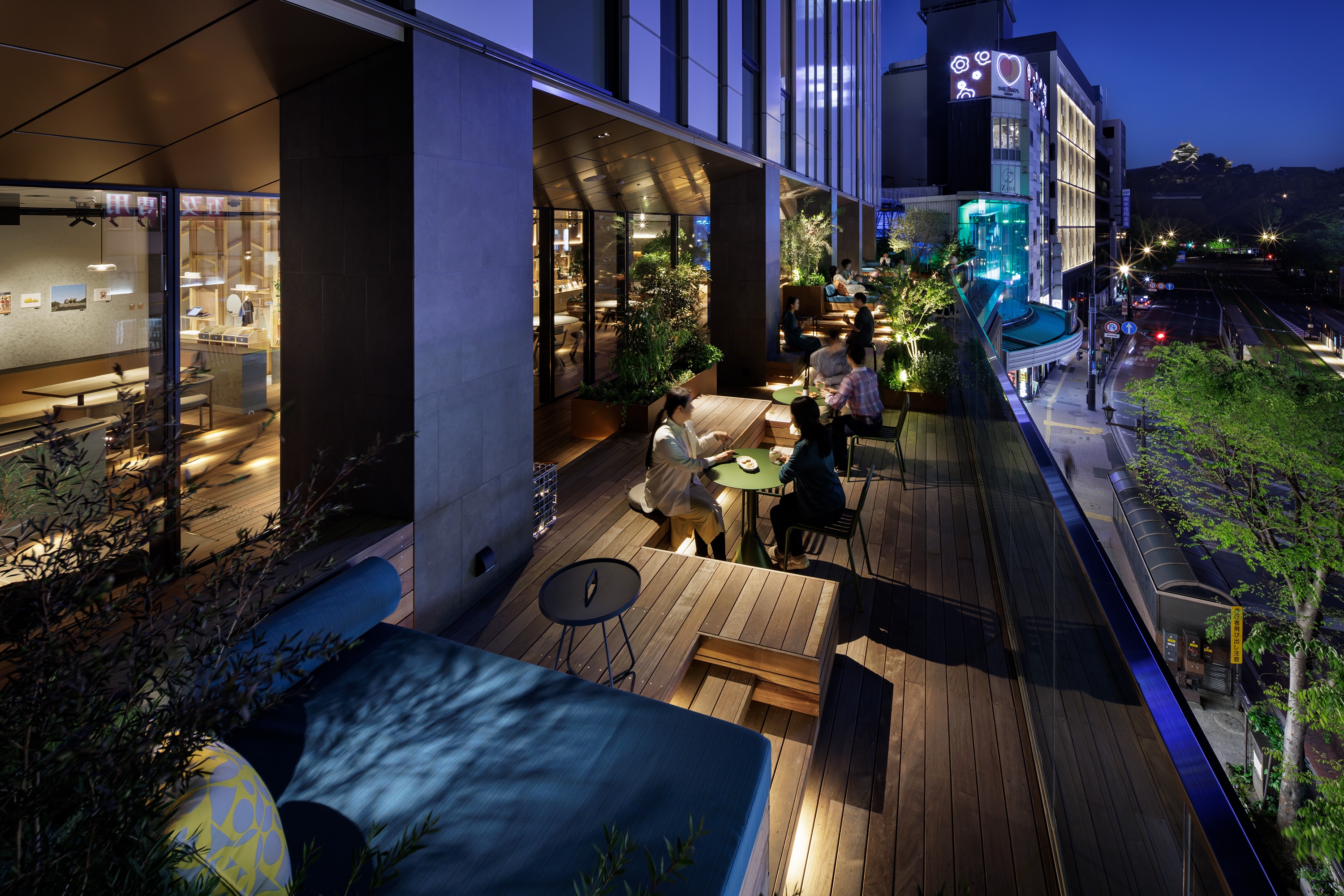 The 1st floor hotel entrance interior is a gravel floor resemble the castle. Lighting was planned to express sunlight through leaves, evoking an outdoor atmosphere. In the public space on the 3rd floor used as a reception, benches with different height imagine of kuruwa, the vallum of the Castle, and plants growing in Kumamoto are planned to sextend outwards to draw in the bustle of the city below and connect the inside and outside of the hotel.The lighting mixes interior and exterior methods and expressions to blur the boundary between inside and outside. Also, a light control system enabling lighting scenes based on the time of day, aiming to reduce electricity usage at night and create a light environment that aspects that vary from day to night. In the guest rooms, due to the limitation on the number of light control circuits, a plan was made to balance day and night by using a unified circuit to minimize the number of circuits with indirect lighting and using on/off circuits for other room lights for each use.