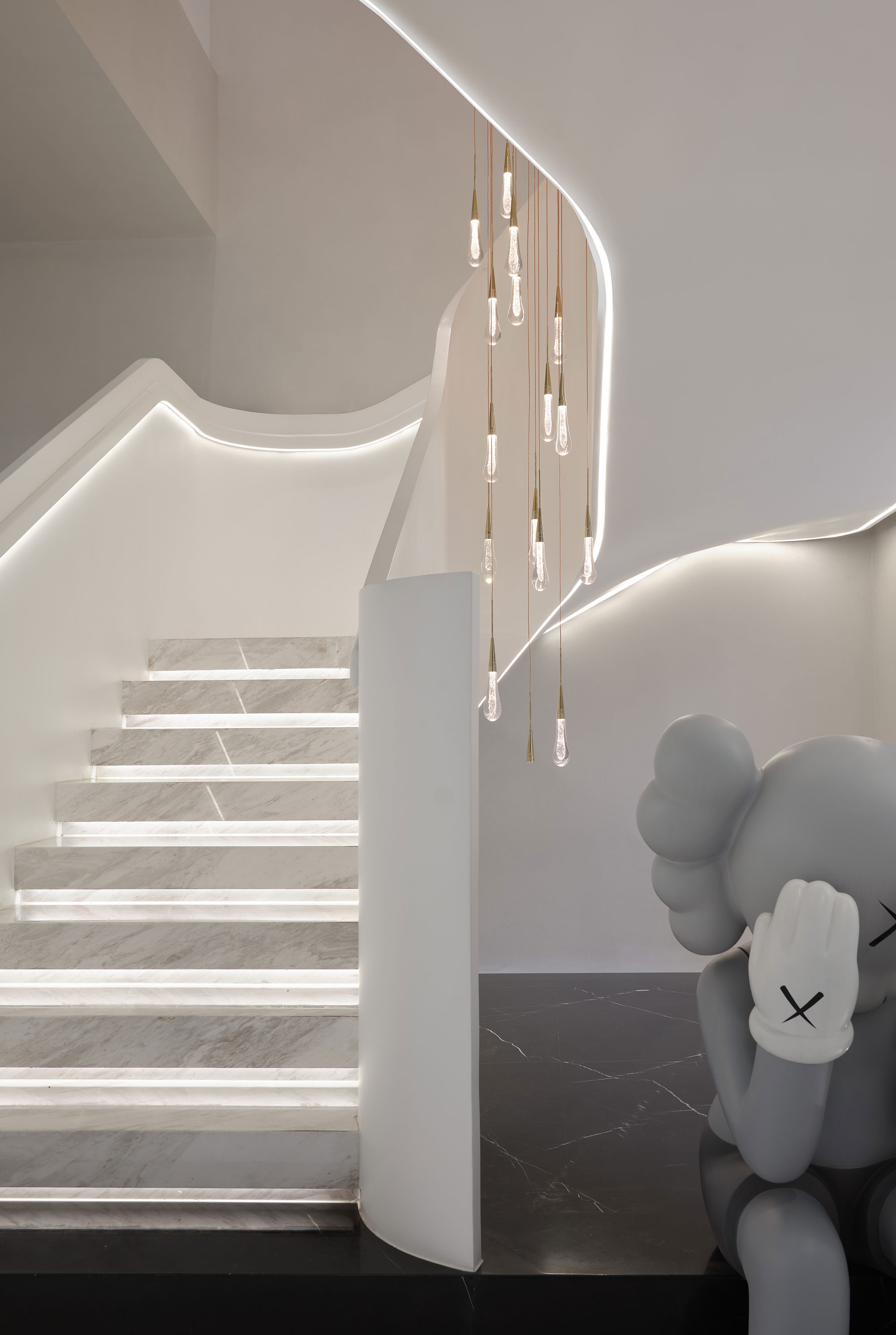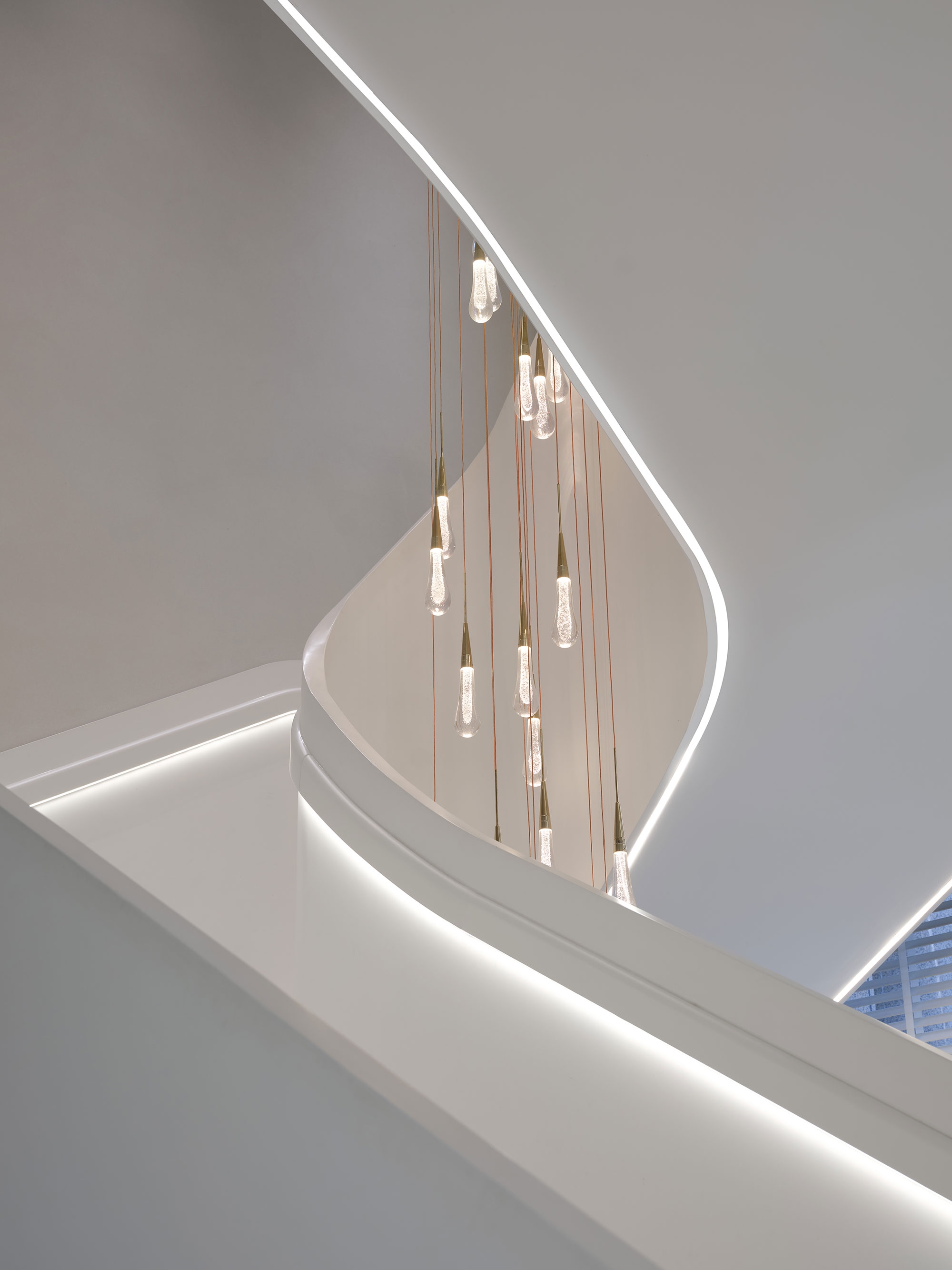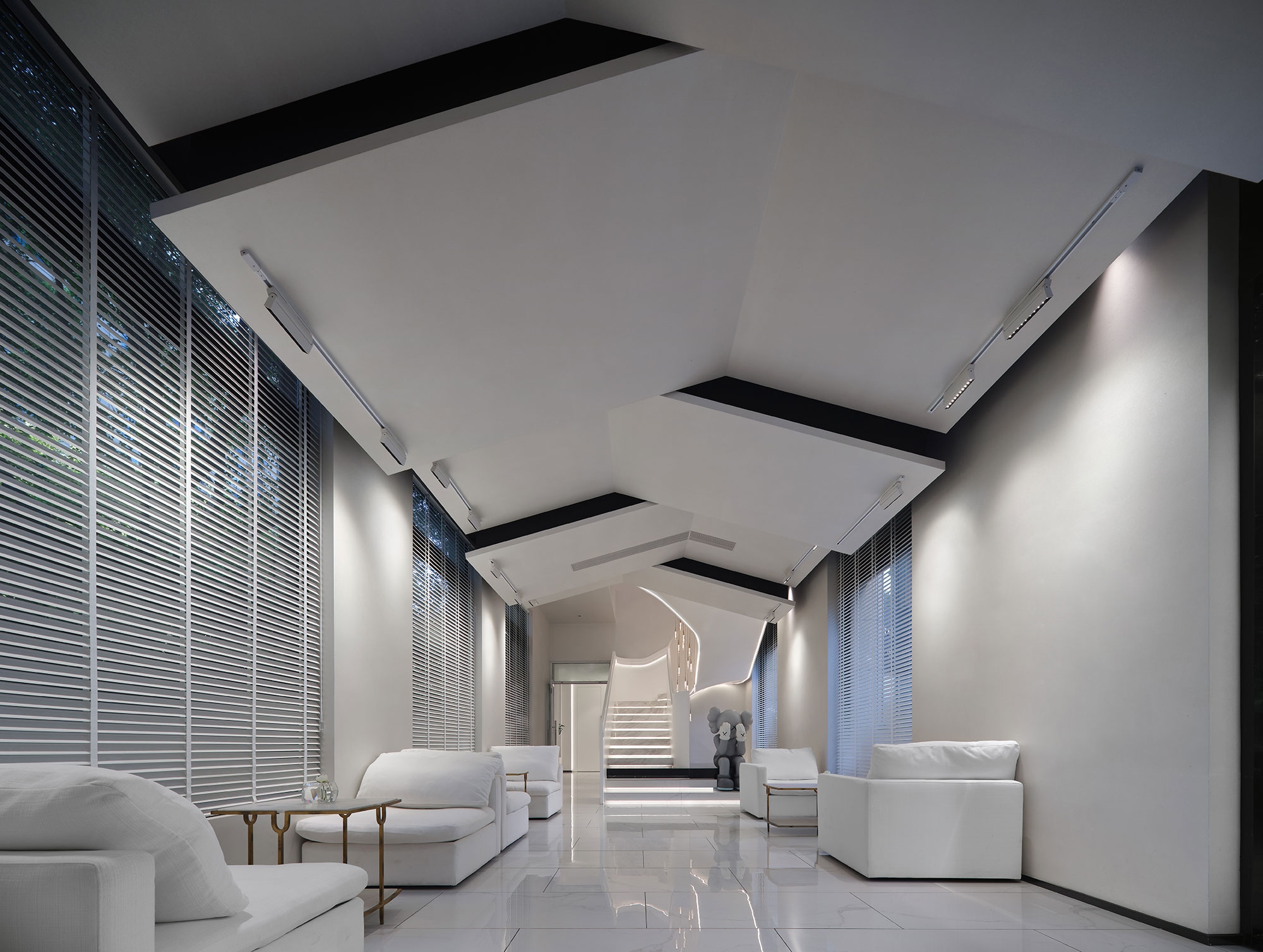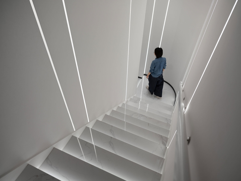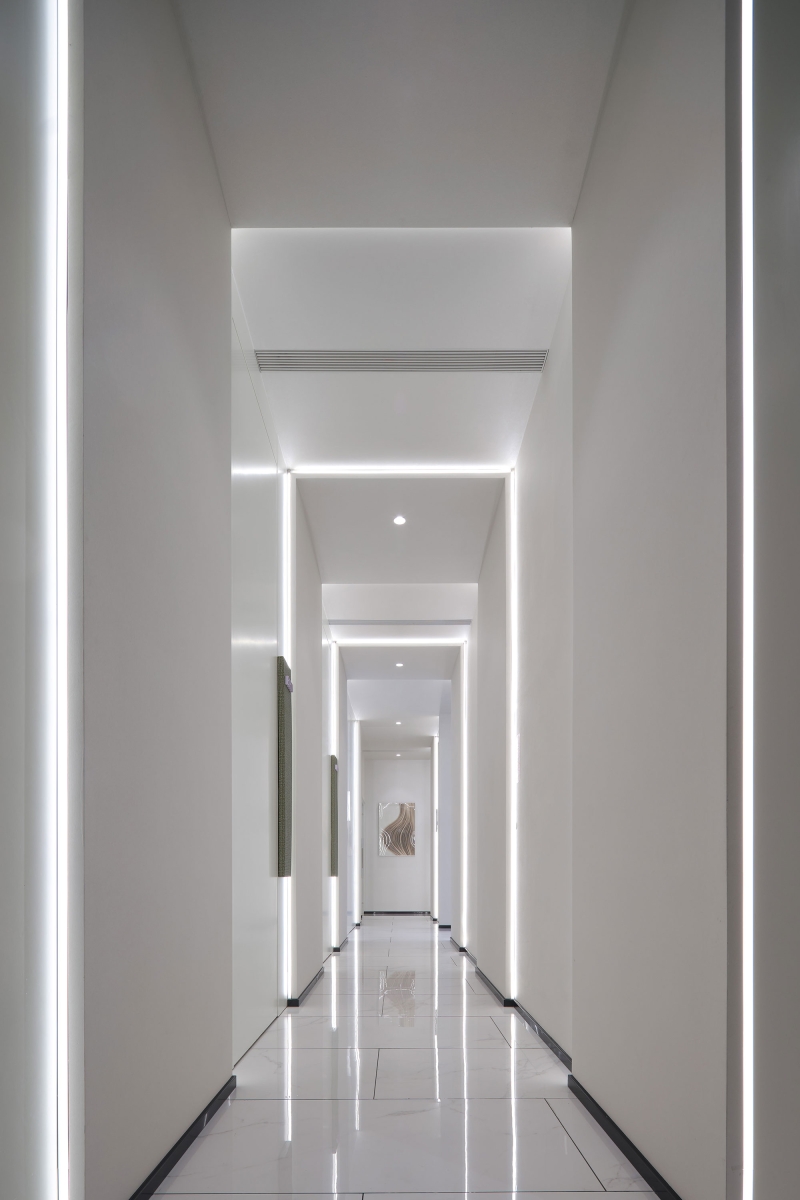 To soften the overall ambiance, the lighting design opts for a warm 3500K color temperature, avoiding the starkness of overly white or cold lighting. The subtle interplay of light and shadow along the spatial lines creates a deep, layered effect, enriching the visitor's experience and enhancing the depth of the space.