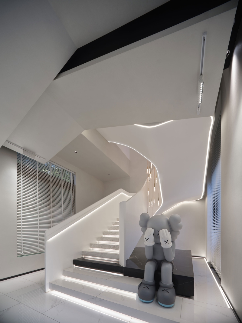 Based on the existing building structure, the design connects two floors by incorporating a spiral staircase that adapts to the building’s original structural constraints. This artistic staircase not only enhances spatial flow but also introduces a distinctive minimalist, avant-garde style and a fresh sensory experience. The varying form and function create a visually striking focal point that captures attention and elevates the overall spatial feel. Each renovated area stands on its own while staying connected, catching light and encouraging creative exploration.