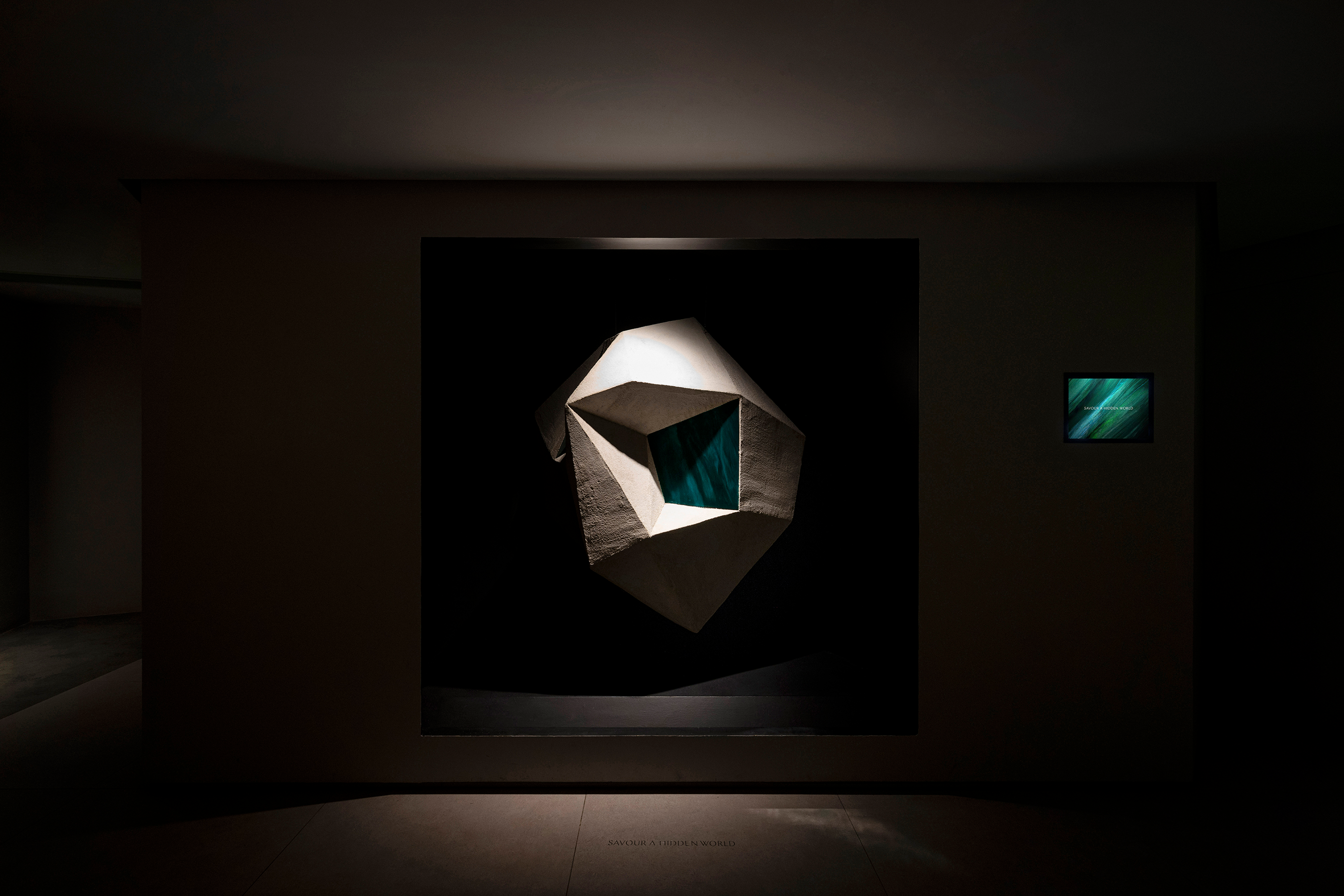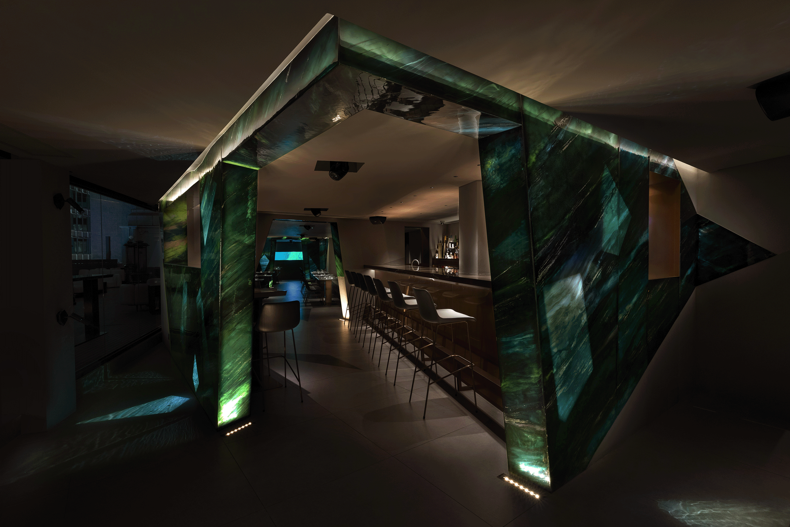 As they step through the entrance, guests encounter a rotating stone structure that showcases the four characters of AOAO through an array of resin images. Cleverly hidden lighting fixtures activate as the structure shifts, illuminating the matching resin surfaces, bringing the restaurant's name to life through a sequence of pre-programmed lighting changes.