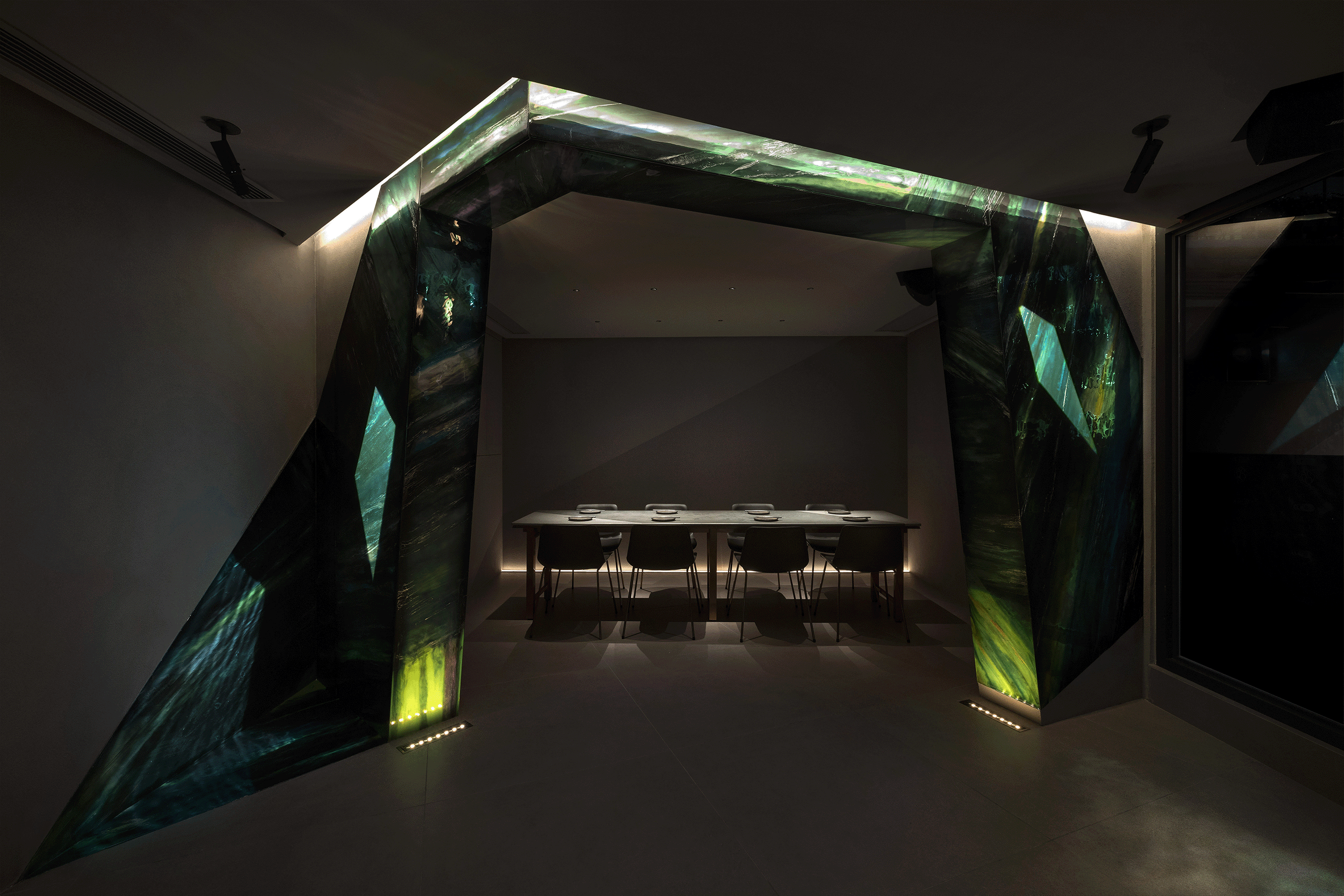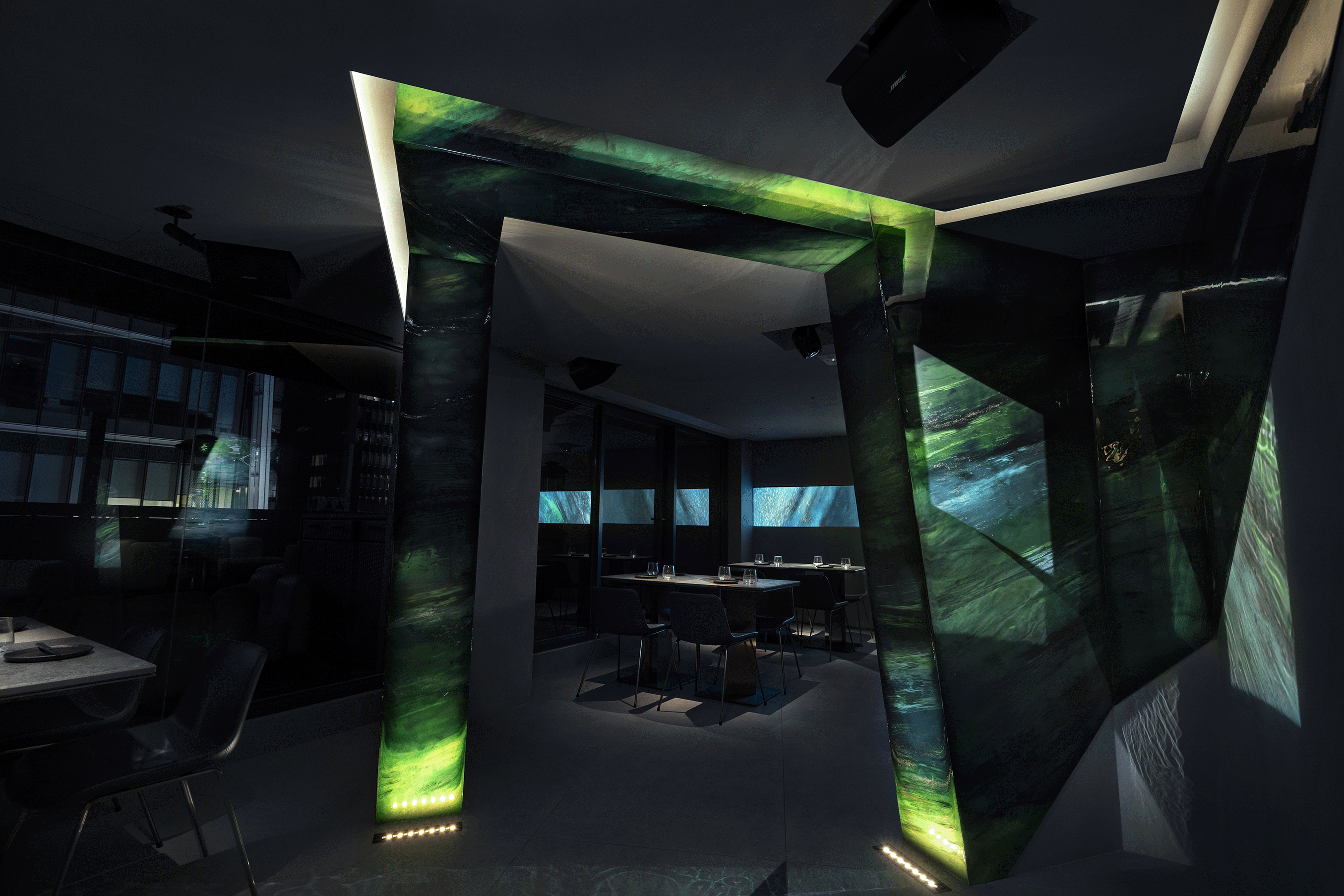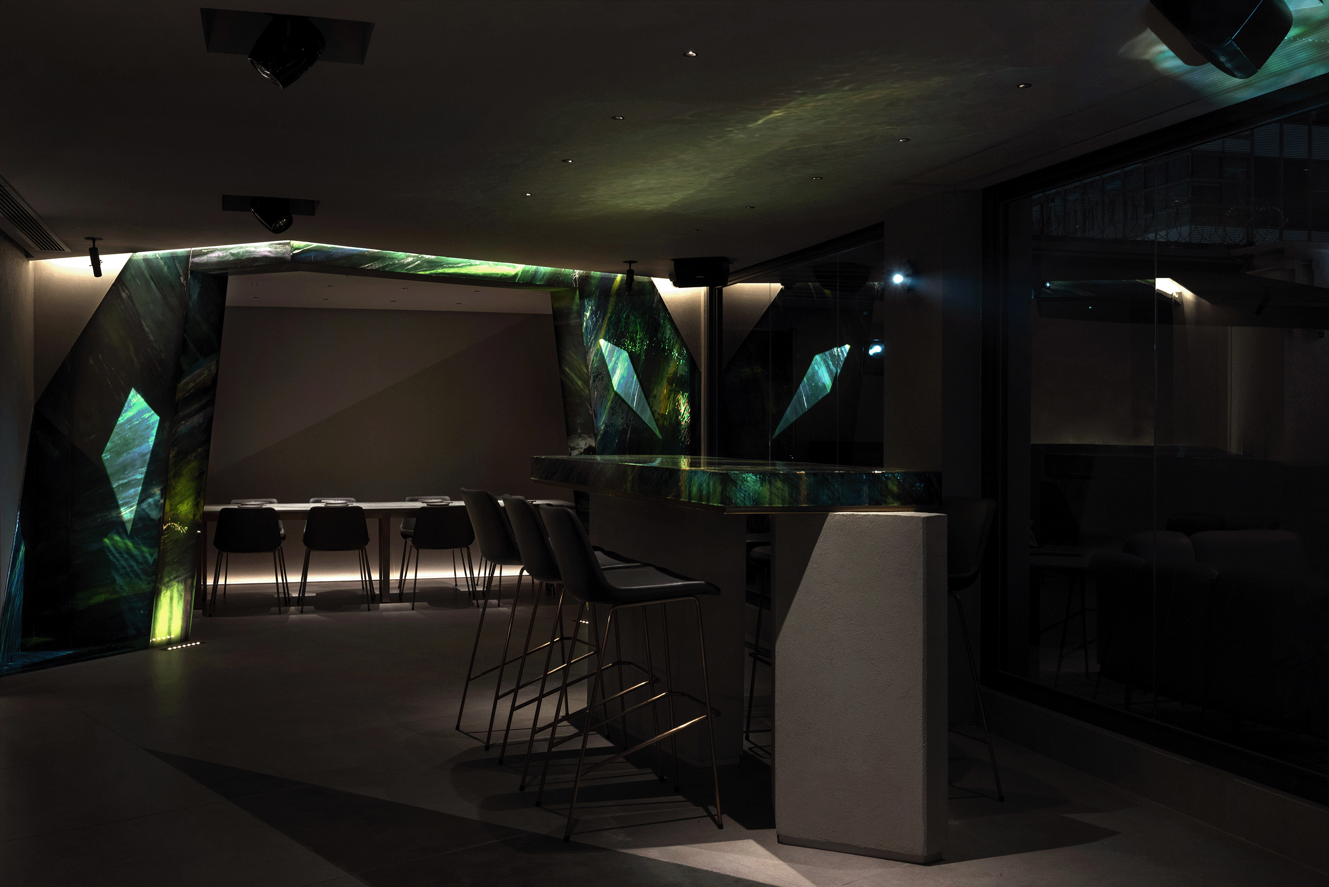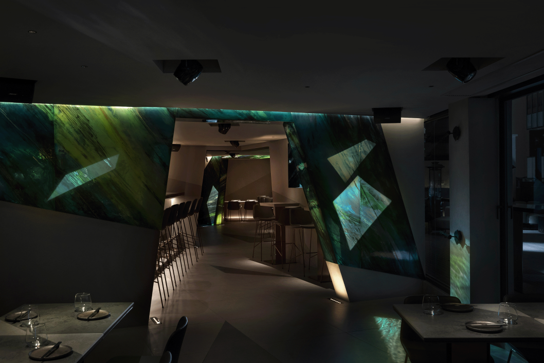 The strategic placement of projector lights in the dining area seamlessly enhances the theme without intruding upon the dining experience. The interplay of lighting upon a feature wall of resin art creates mesmerising interplays of green shadows and reflections, elevating the overall sensory ambience. Through the synergy of innovative lighting techniques, dynamic scenes, and unwavering attention to detail, the lighting design team transcended the ordinary, suffusing diners in an opulent aura of beauty and serenity.