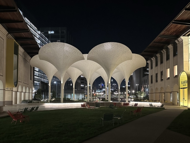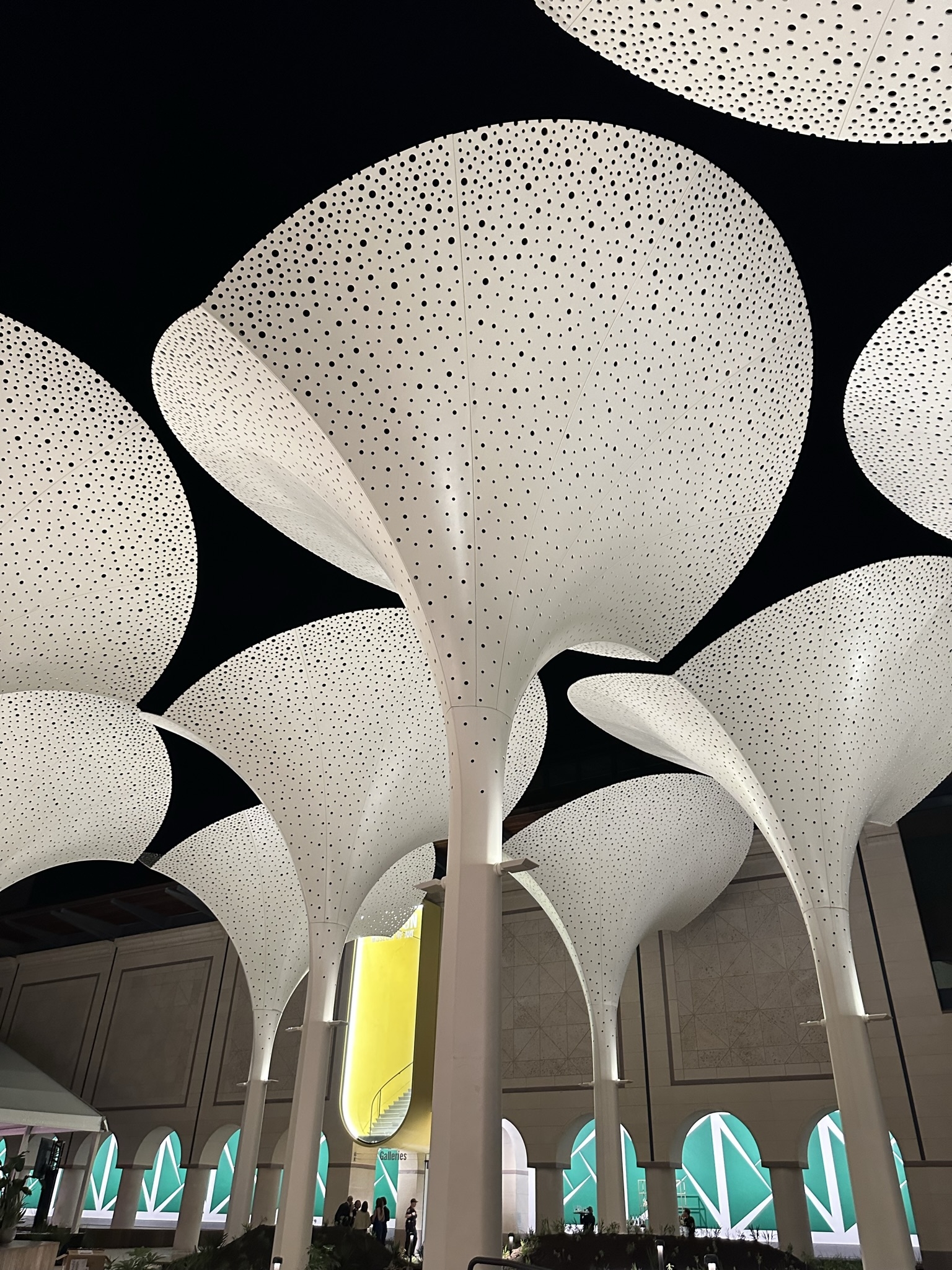 The lighting design plays a crucial role in enhancing the museum's atmosphere and functionality. Warm tones and relatively bright pathways create a welcoming ambiance, while lighting integrated into the infrastructure reduces visual clutter. Low-level lighting fosters a sense of intimacy, encouraging visitors to appreciate the surroundings. Concealed lighting within trees and foot rail lighting illuminate paths where light levels are low, providing both safety and aesthetics. The lighting design incorporates three layers of light. The primary core layer consists of indirect or diffuse lighting integrated into the architecture and millwork to wash surfaces and textures. The secondary accent layer highlights architectural features, while the third layer adds unique spatial character and serves as a design element to create focal points. Illuminating petals at the site entry provides high levels of ambient light, signaling the entrance and enhancing the overall aesthetic. The arcades feature bright, glowing entries that define the edge of the plaza. Pendants and glowing ceilings within the arcades provide an inner glow.