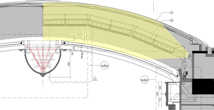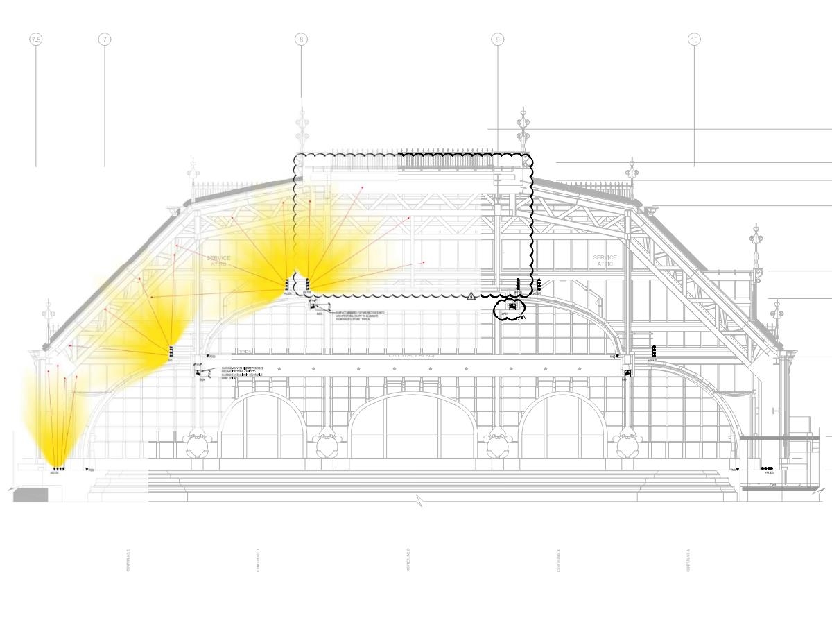 Mock-up photos and sections of the Crystal Palace Skylight and Shakespeare Hall Level 3 illustrate how lighting effects were carefully coordinated.