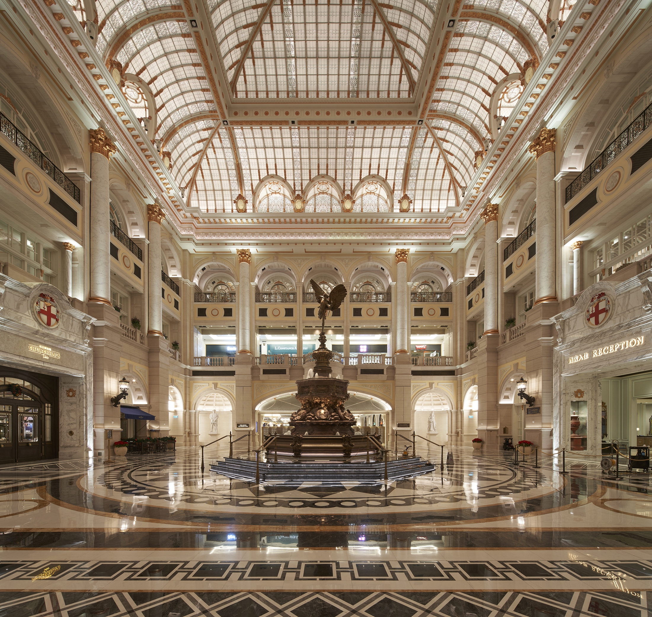 Entry DescriptionTo revitalize this under-performing casino resort, the owner envisioned a bold London theme transformation. The project focused on two multi-story atrium spaces. The first, a 4-story atrium, was reimagined as "The Crystal Palace," the resort's grand entrance. This transformation featured a new skylight, themed facades, and a replica of Piccadilly Circus' Shaftesbury Fountain. The lighting design illuminated sculptures, columns, arches, cornices, the skylight, and two-story faux windows, all RGBW-enabled for a nightly theatrical show.