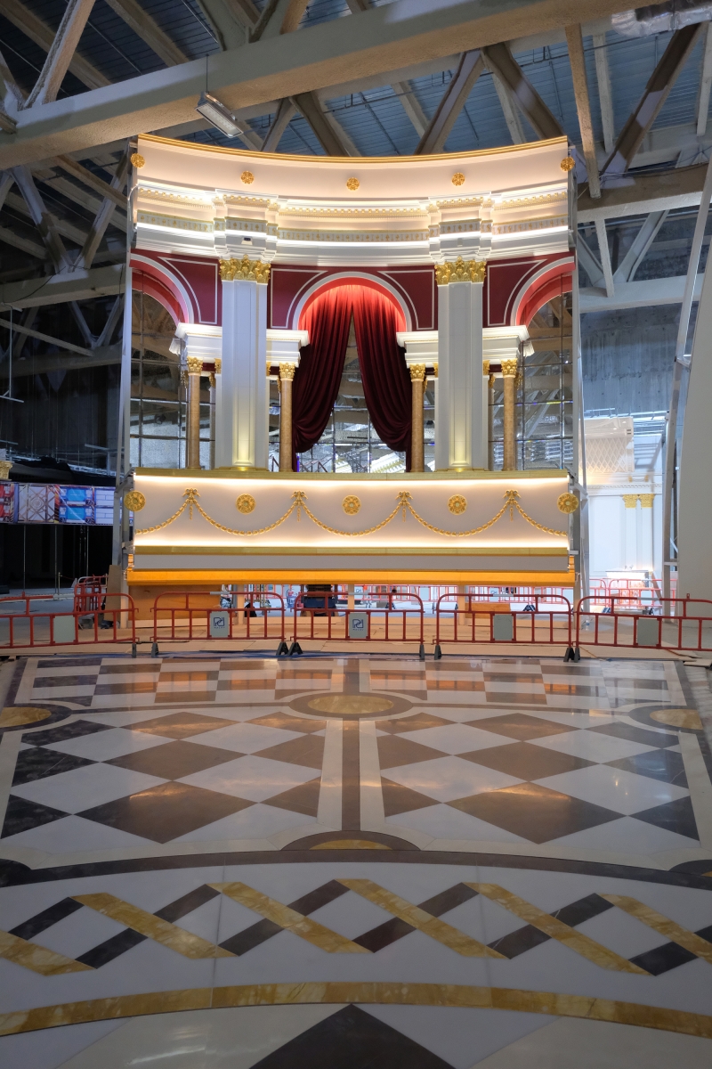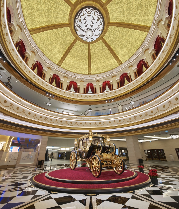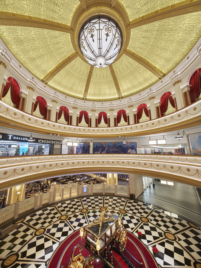 "Shakespeare’s Hall," a 3-story atrium, was redesigned for themed displays and performances. A second skylight layer was added to obscure the existing glass, with perimeter illumination allowing color changes. The top level features columns, arches, drapes, and cornices accented by concealed linear LEDs. A perimeter ceiling trough on the second level houses theatrical fixtures, enhancing displays or performances, while small coves light balcony fascias with gold filigree accents.