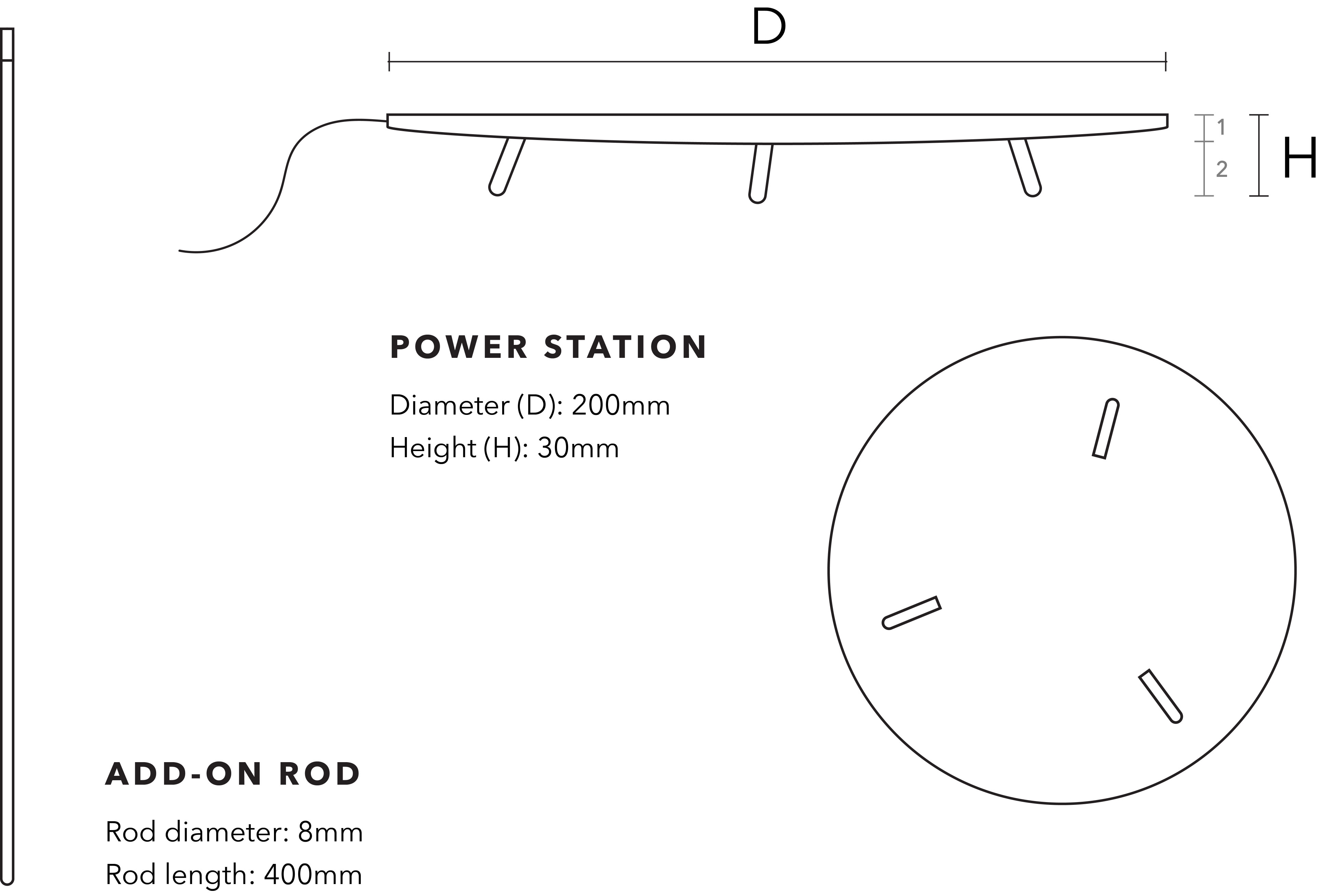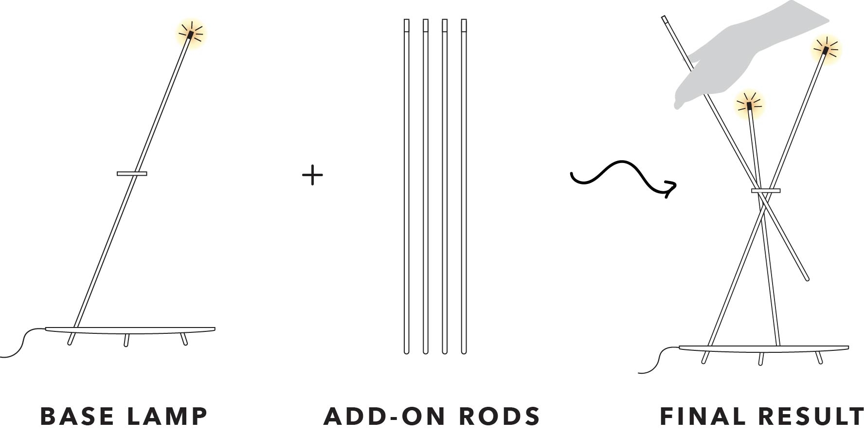 The main components of the lamp are the base and add-on rods. The base can be used as a standalone lamp and represents the lowest possible brightness level that this lamp offers. Additional rods can be added and purchased individually, allowing the user to adjust the brightness and appearance of the lamp with each use based to match different moods and settings.