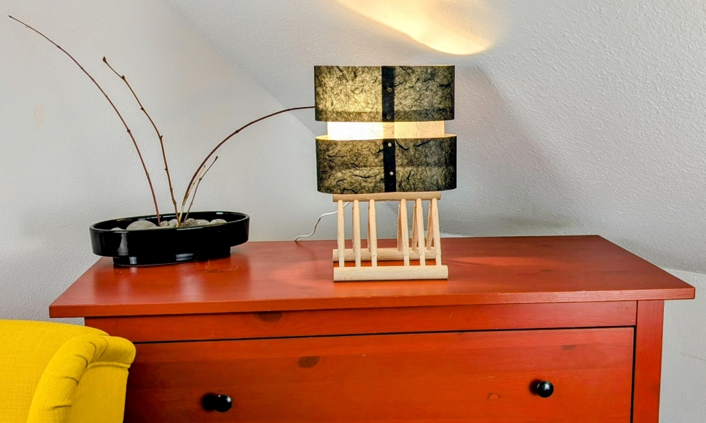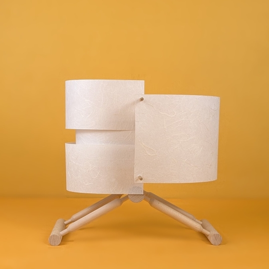 "More Than Light — A Creative System". This modular lighting system is based on an unique way to design lamps and invites users to become co-creators. The frames, made of interlocking wooden rods, form the base for customizable paper panel configurations. Users can choose from multiple colors, panel assembly options, allowing for different shapes and degrees of transparency. Decorative patches in geometric shapes or stencils empower individuals to personalize their lamp — by painting, coloring, or attaching elements — creating a unique design language. The construction is tool-free and designed for easy repair and adaptability. This approach not only encourages creative interaction but also extends the product’s lifecycle through modularity and personal attachment.
