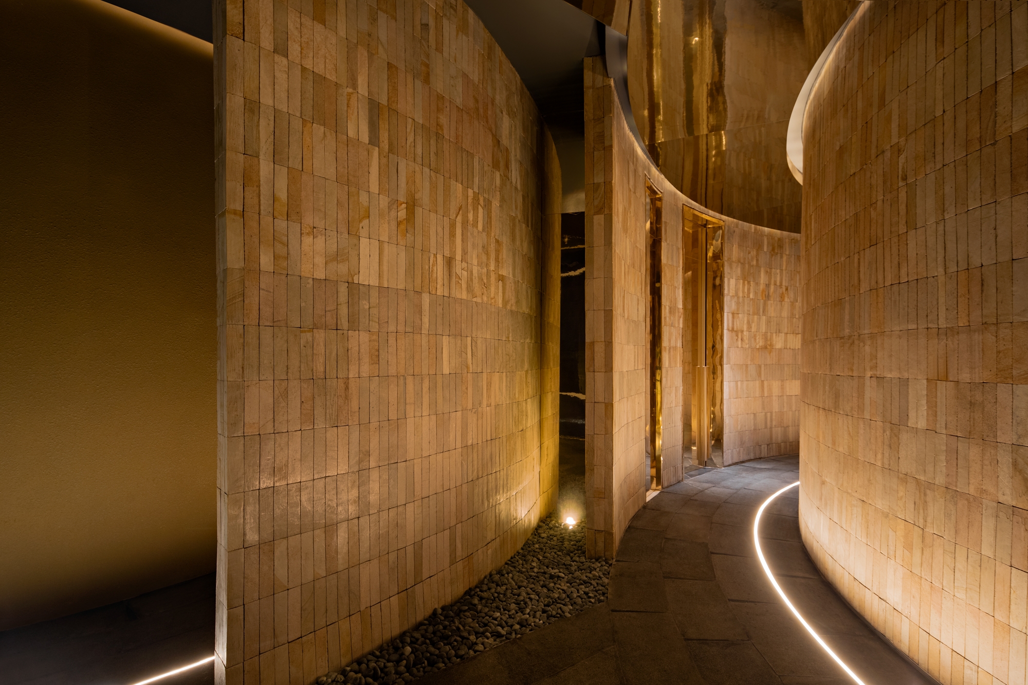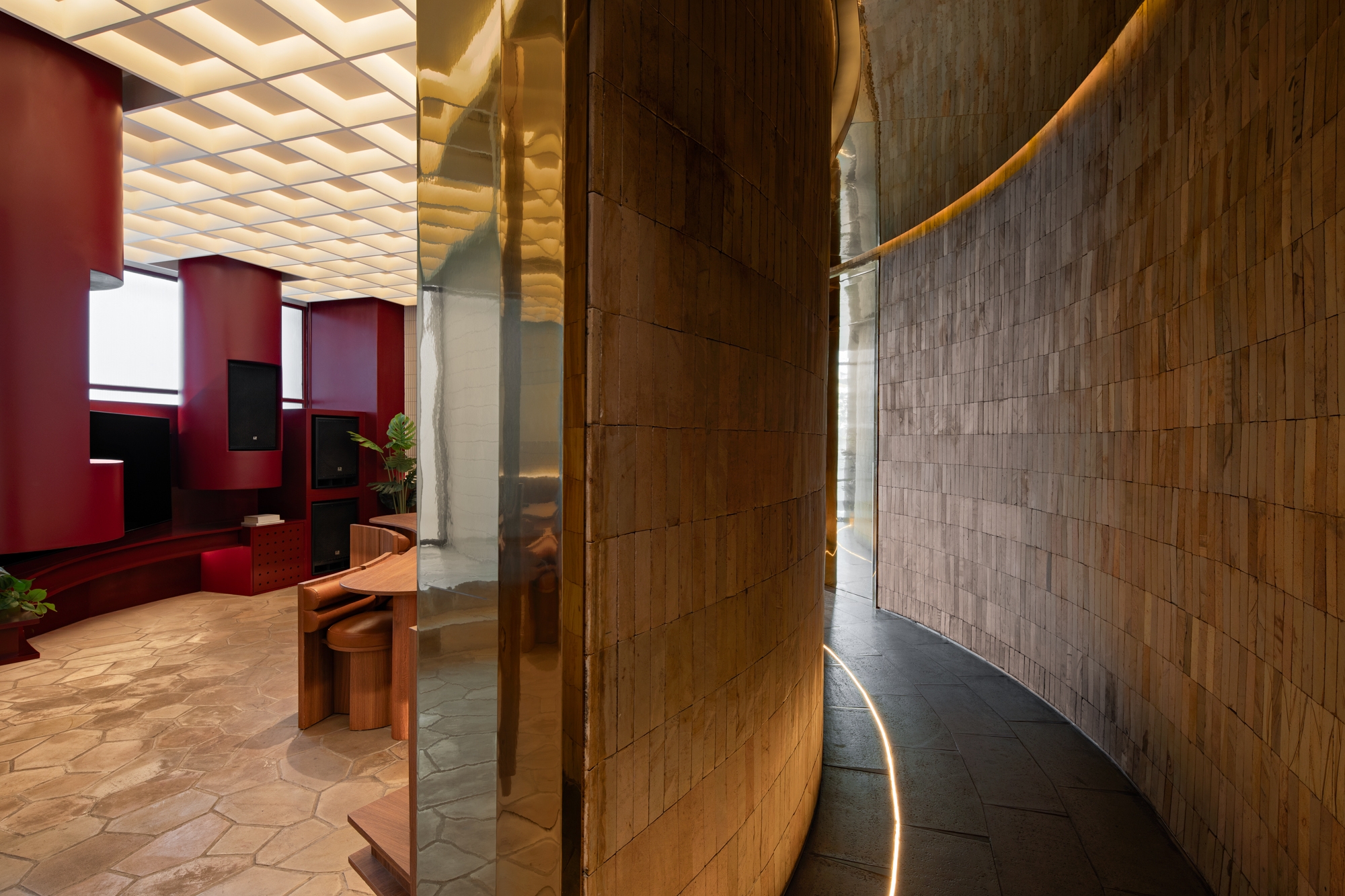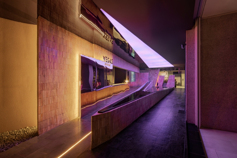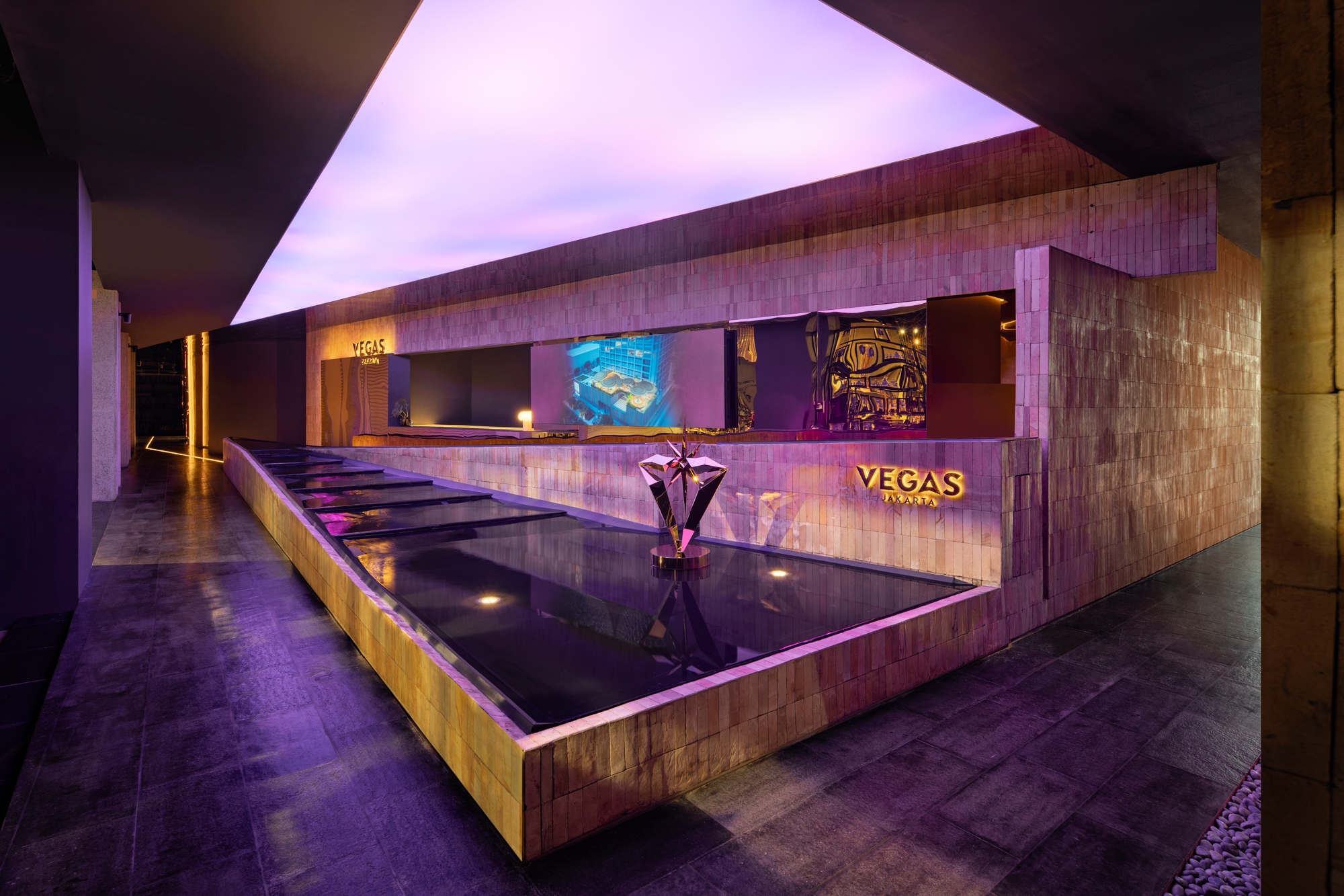 Entry DescriptionThe design features modern architecture with sleek, angular lines and a prominent purple and gold colour scheme. Neon lighting highlights the contours of the building, giving it a futuristic appearance. Lighting creates a vibrant and inviting atmosphere, typical of entertainment venues. The overall aesthetic suggests a stylish and potentially upscale location.