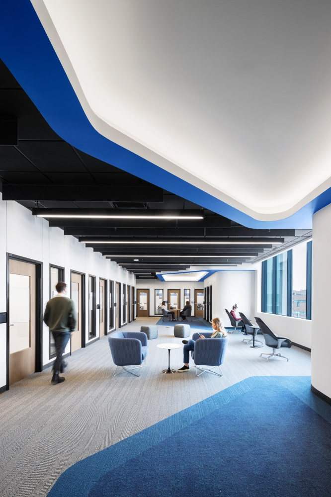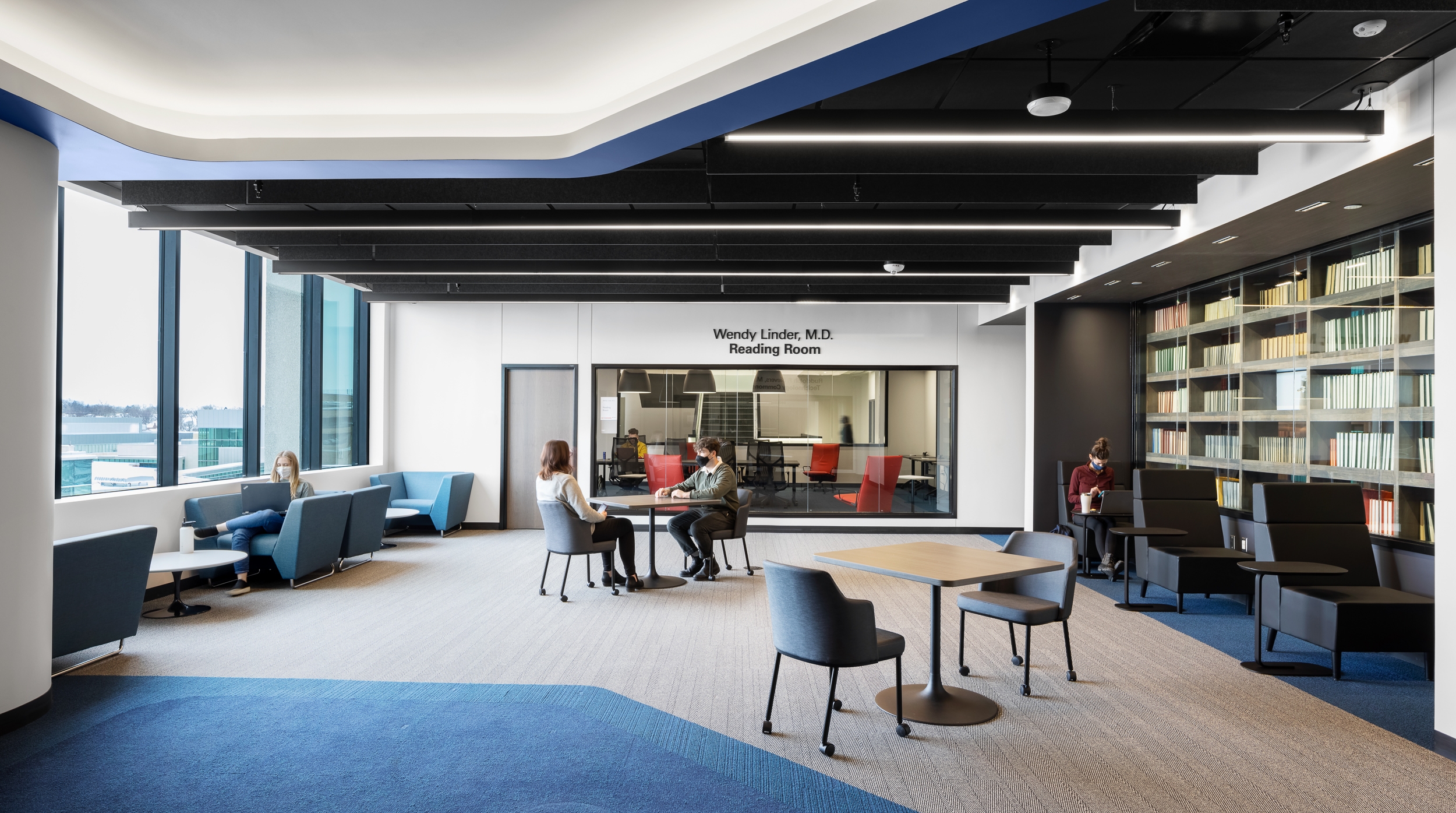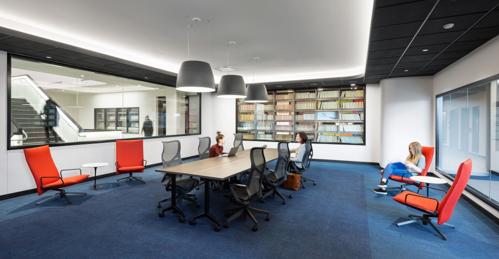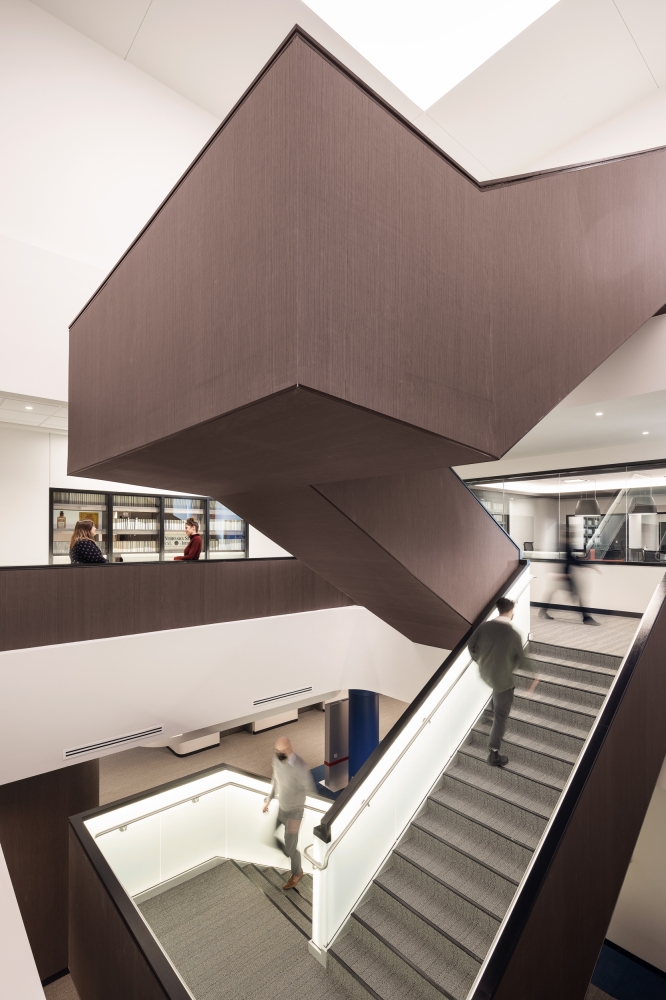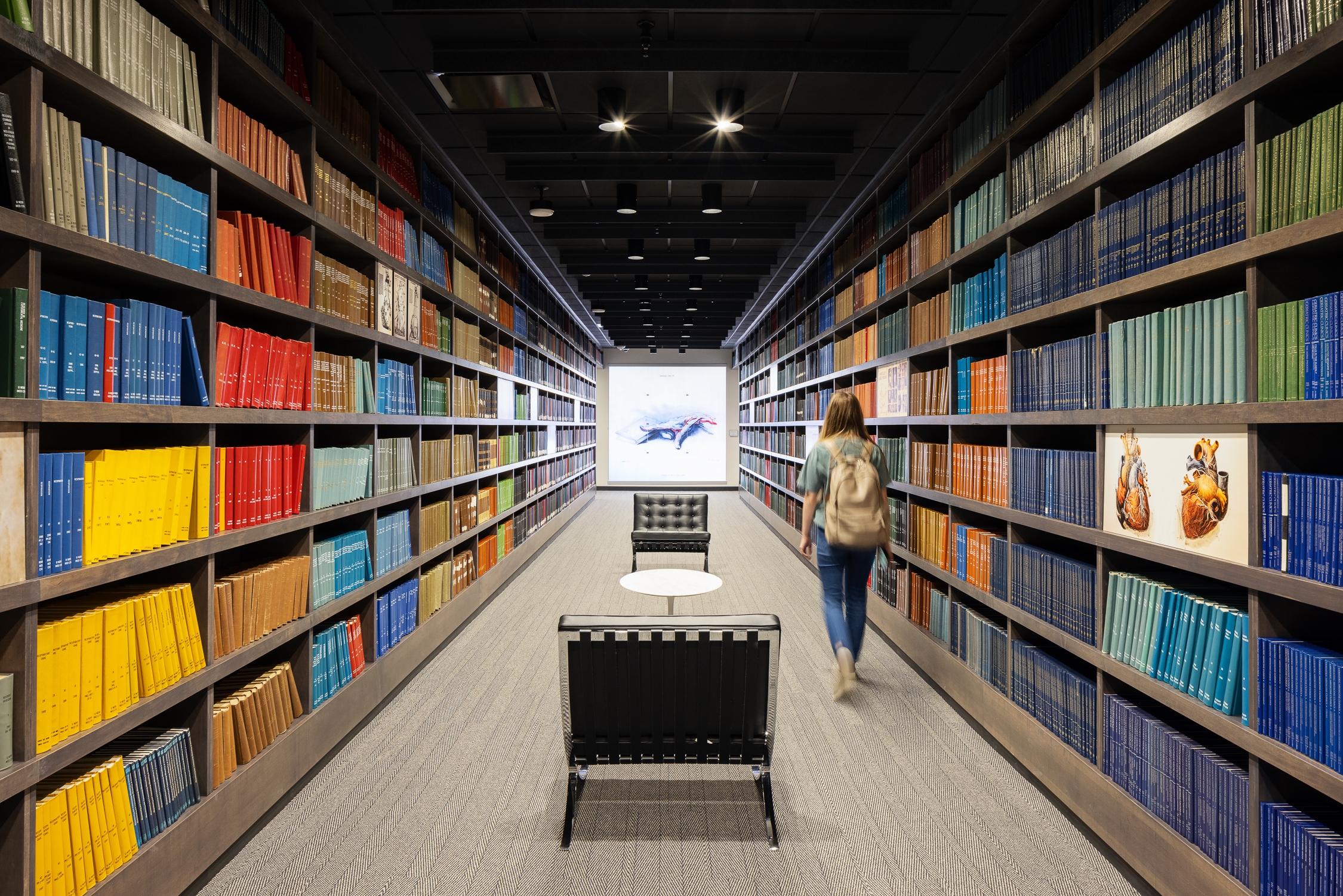 Sustainability ApproachCoordinated photocells and automated interior roller shades provide daylight harvesting and reduce lighting loads when daylight is available. The resulting lighting power density is 69% better than the energy code requirements. Large quantities of outdated texts were diverted away from landfills and utilized as an interior architecture feature. These corridors are illuminated by luminaires that provide both functional and feature lighting, minimizing the quantity of total luminaires required for a unique visual experience.