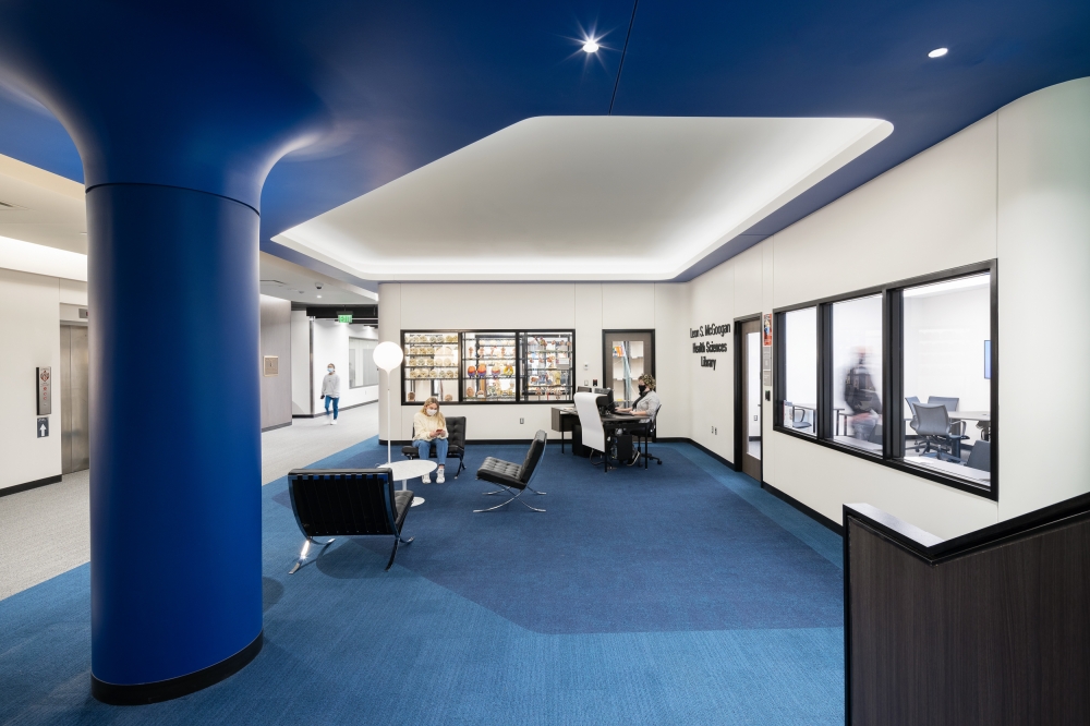 Entry DescriptionThe renovation and redesign of the McGoogan Health Sciences Library at Wittson Hall on the campus of the University of Nebraska Medical Center embraced the original 1960’s interior design style with curved architectural elements while focusing on repurposing and revitalizing for an active, collaborative, modern learning environment. The lighting design features large, illuminated coves in lobbies, study rooms, and collaboration areas. These coves provide functional illumination suitable for reading and writing while maintaining a clean ceiling plane and enhancing the curved architecture. Suspended linear pendants with lens-less indirect optics and curved profiles interrelate the linear acoustic baffle solutions to the overarching design language. Convenient, intuitive lighting controls allow task-tuning for user preferences — essential for students using the space for long hours. Repurposed stacks of outdated textbooks are evenly washed with light to create a vibrant, immersive architectural feature that serves as the library’s main circulation corridor. Backlit art panels lead visitors through the stacks. Illuminated cavities behind frosted glass in the main stairwell guardrails guide occupants through vertical space. Backlit, stretched fabric at the top of the stair volumes gives the sense of natural skylights in areas with no accessible daylight.