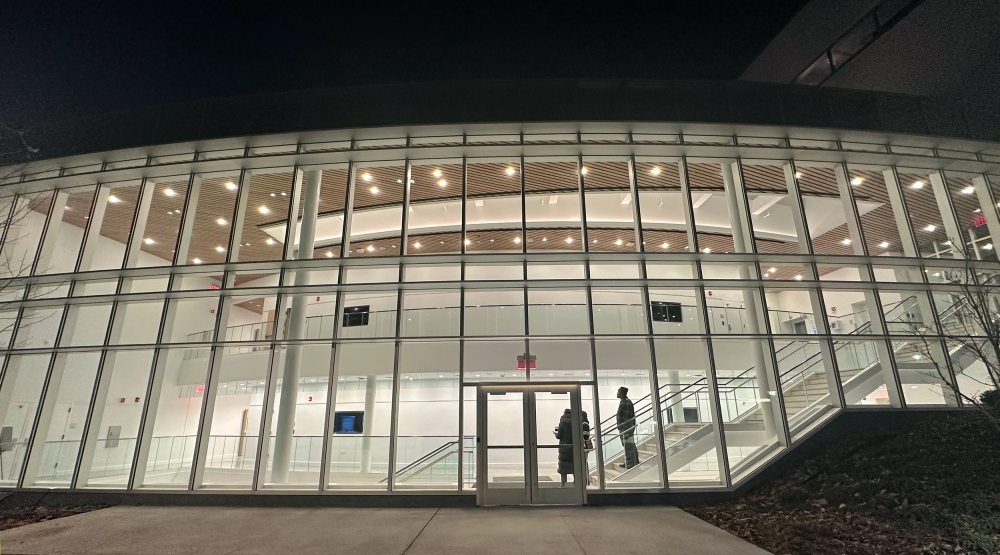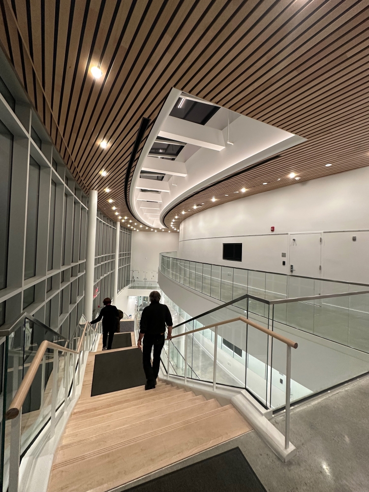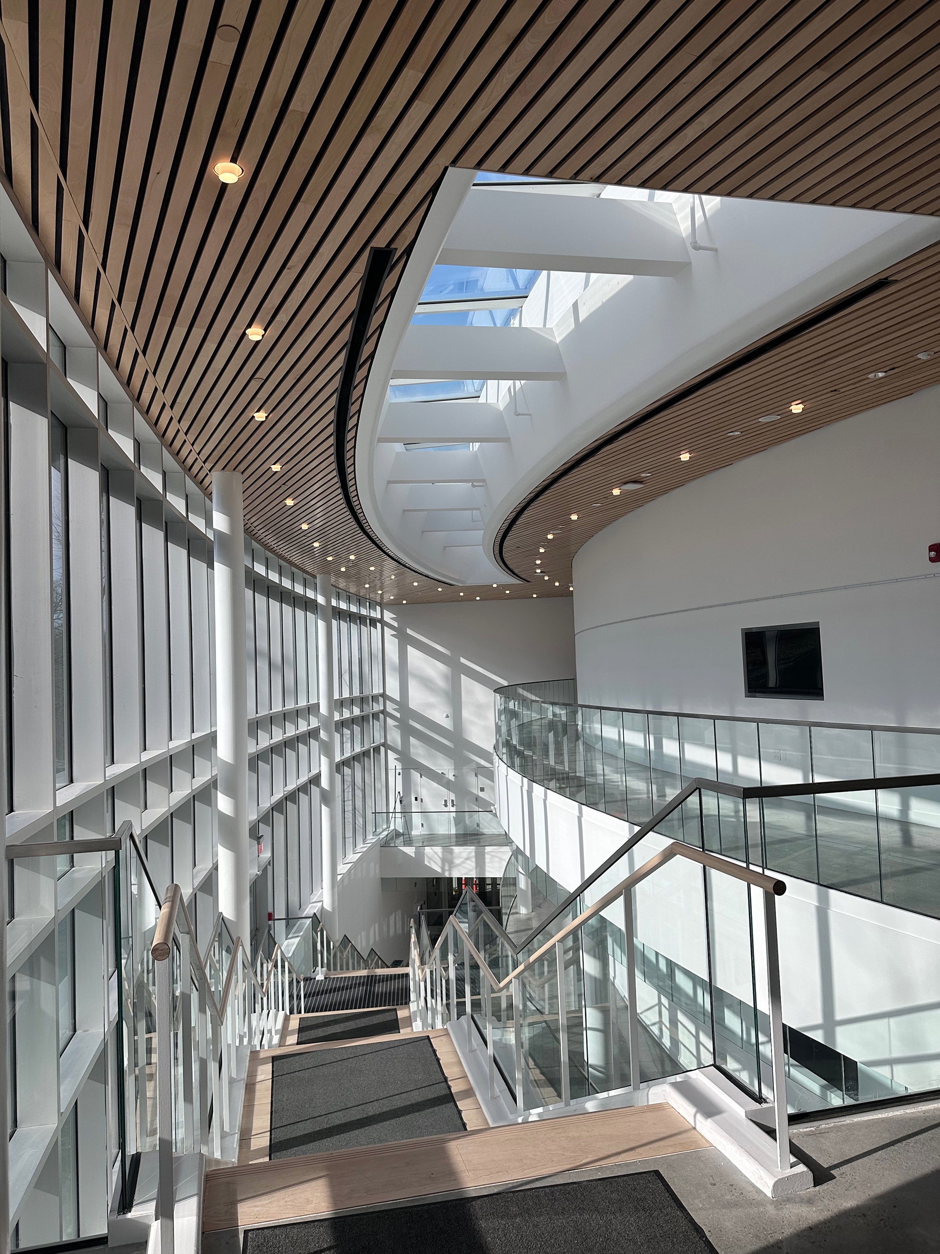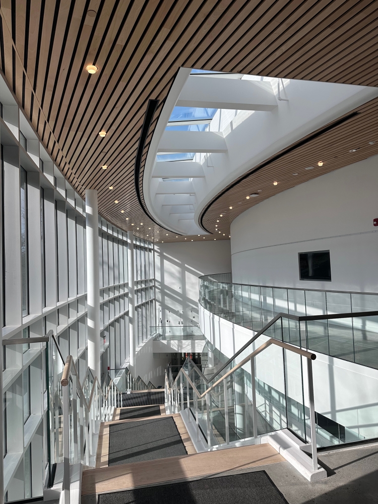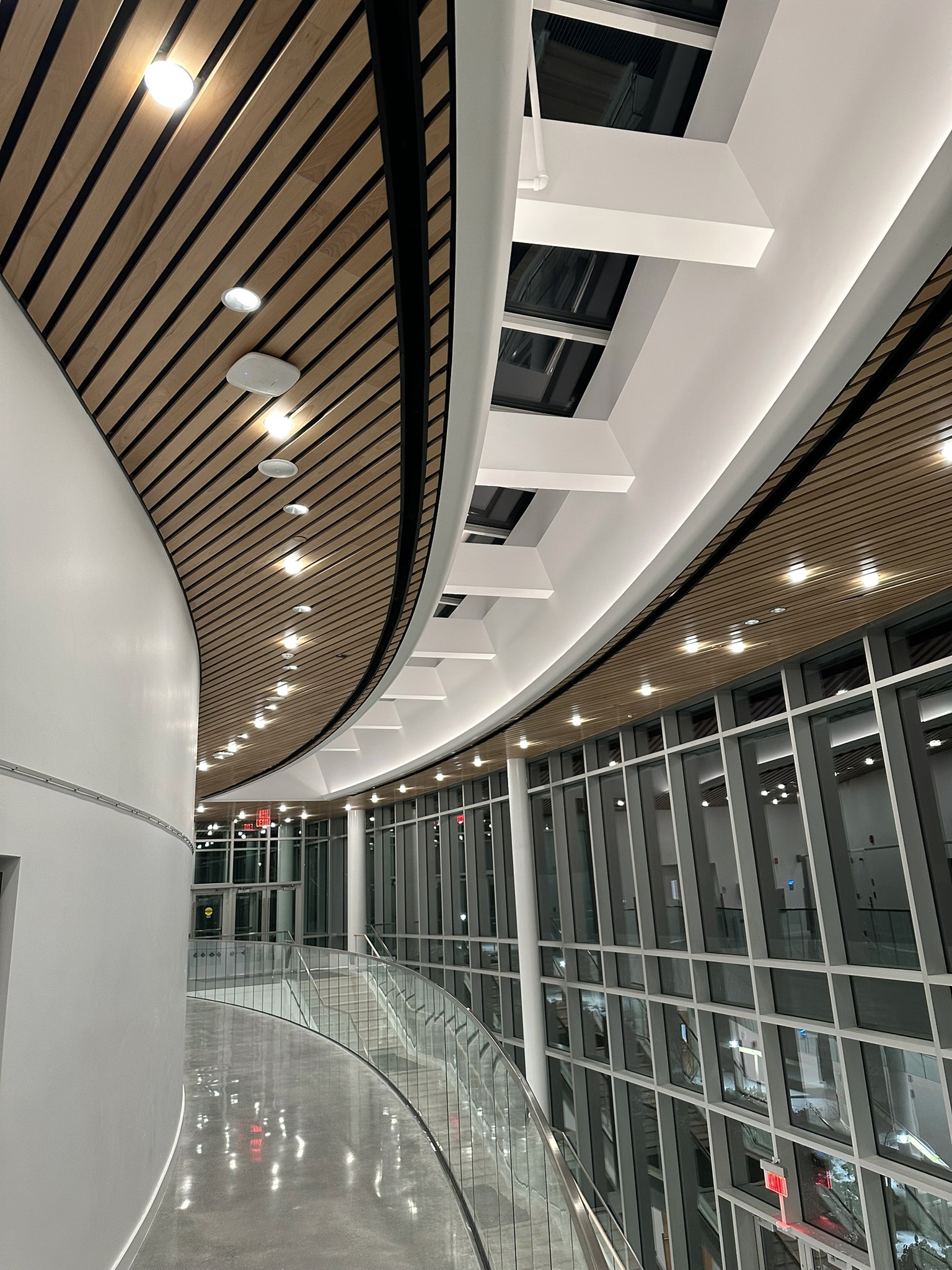 By day, the lobby is bathed in natural light, streaming through floor-to-ceiling windows and a central skylight. By night, it transforms into a glowing beacon. Recessed, lensed LED wallwashers illuminate the vertical surfaces on each level, while a pattern of downlights with decorative glass trim adds sparkle to the wood ceiling. Discretely tucked within an architectural cove at the base of the skylight, a flexible LED light illuminates the curved fascia, enhancing its form.