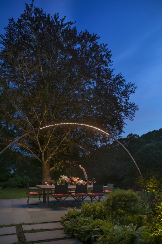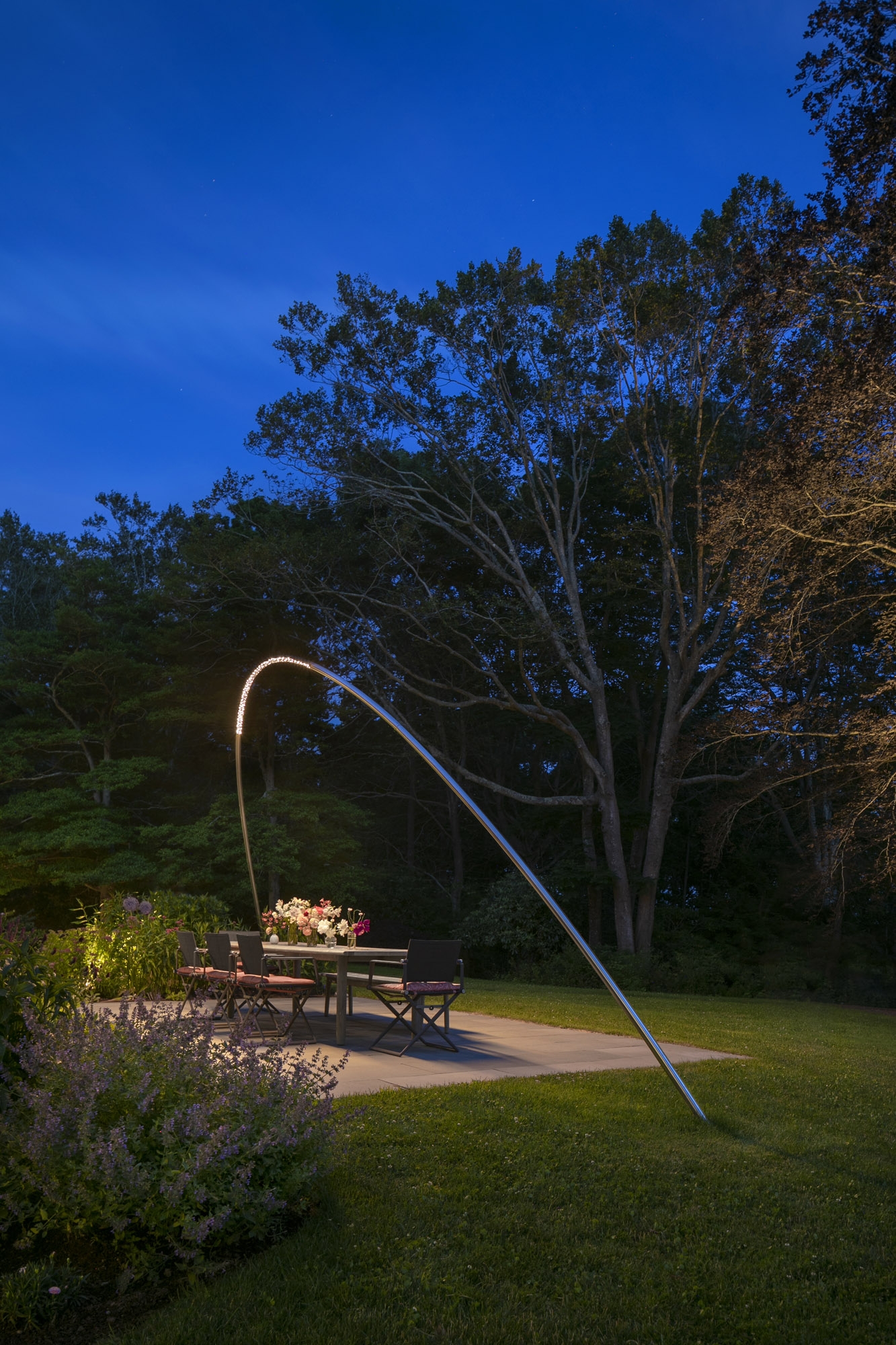 Entry DescriptionA custom-designed illuminated torqued arch was designed specifically for a private garden, framing the outdoor dining experience while embracing the landscape and preserving views. The structure features a marine grade 2" stainless steel tube with precision perforations, engineered to achieve a slender, graceful 30-foot span with minimal visual impact. A continuous channel of low-voltage LED modules is seamlessly integrated along the inner curve, providing warm, diffuse illumination calibrated for visual comfort and minimal glare.