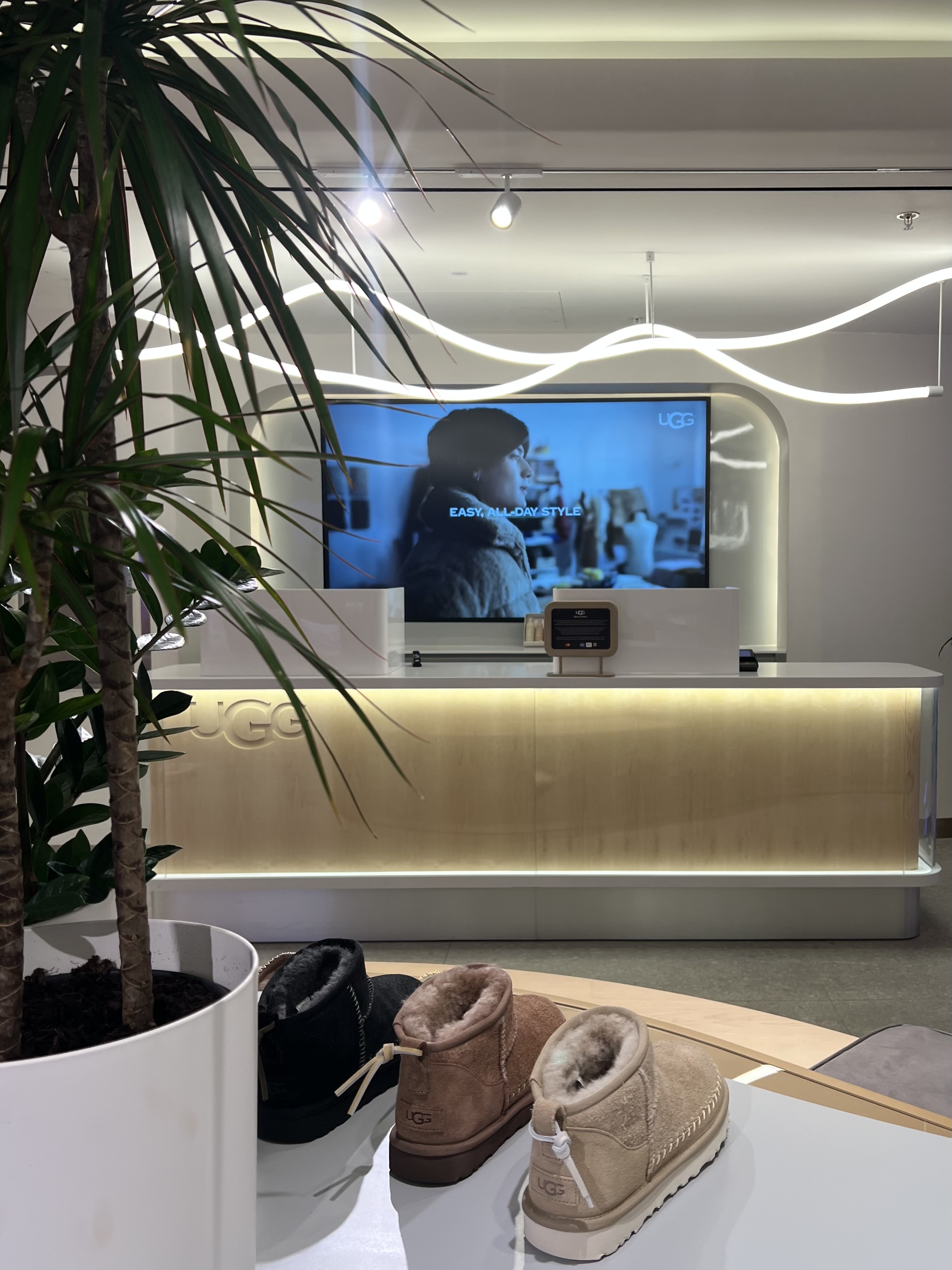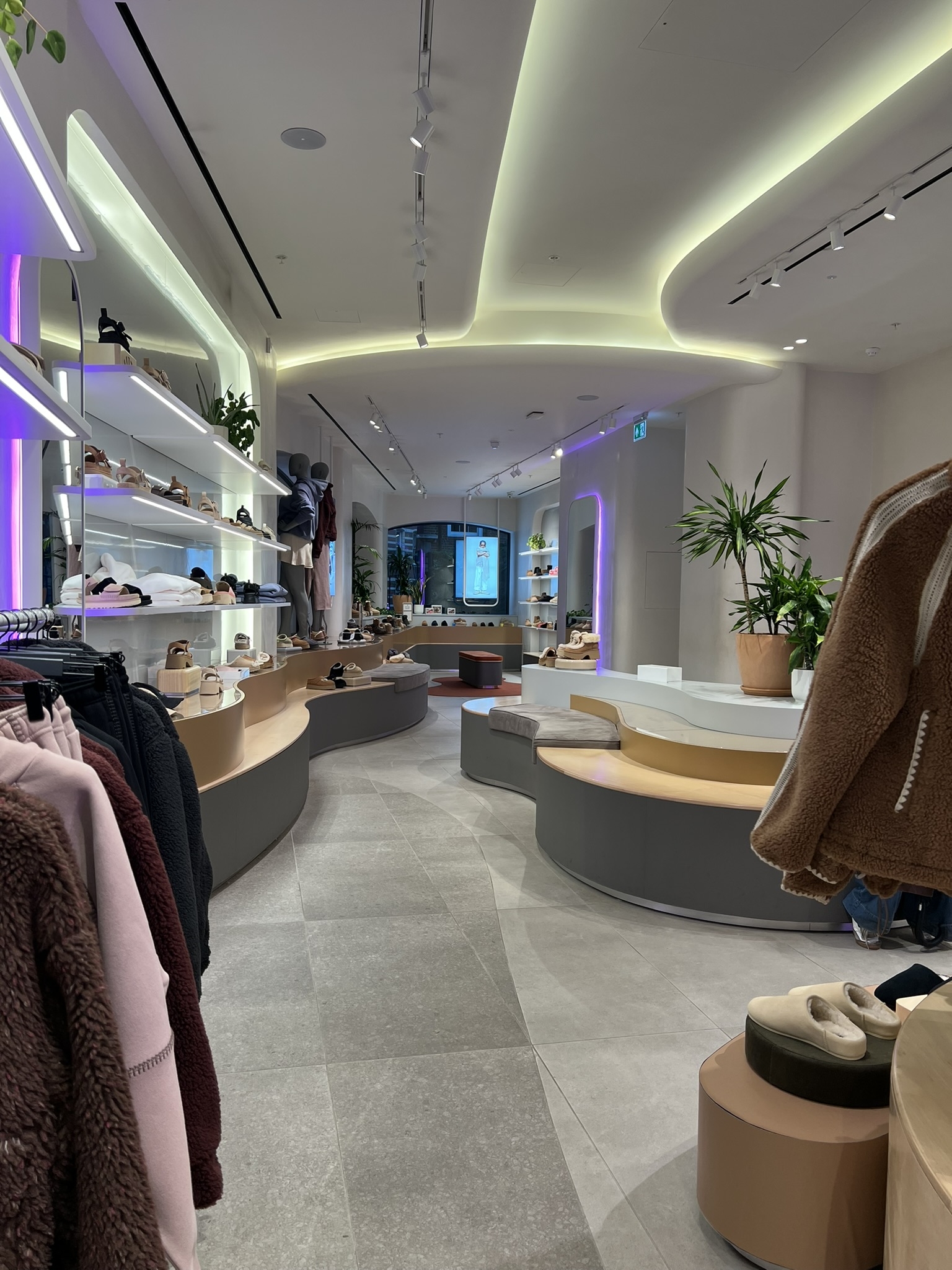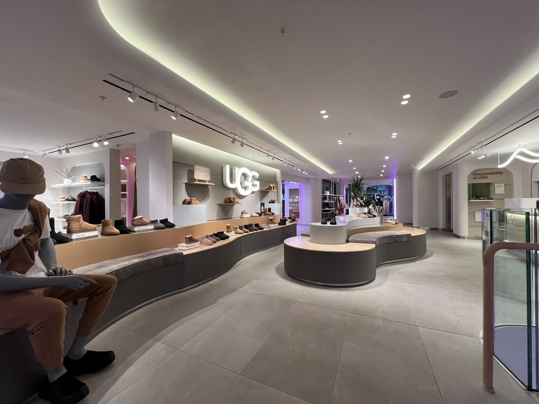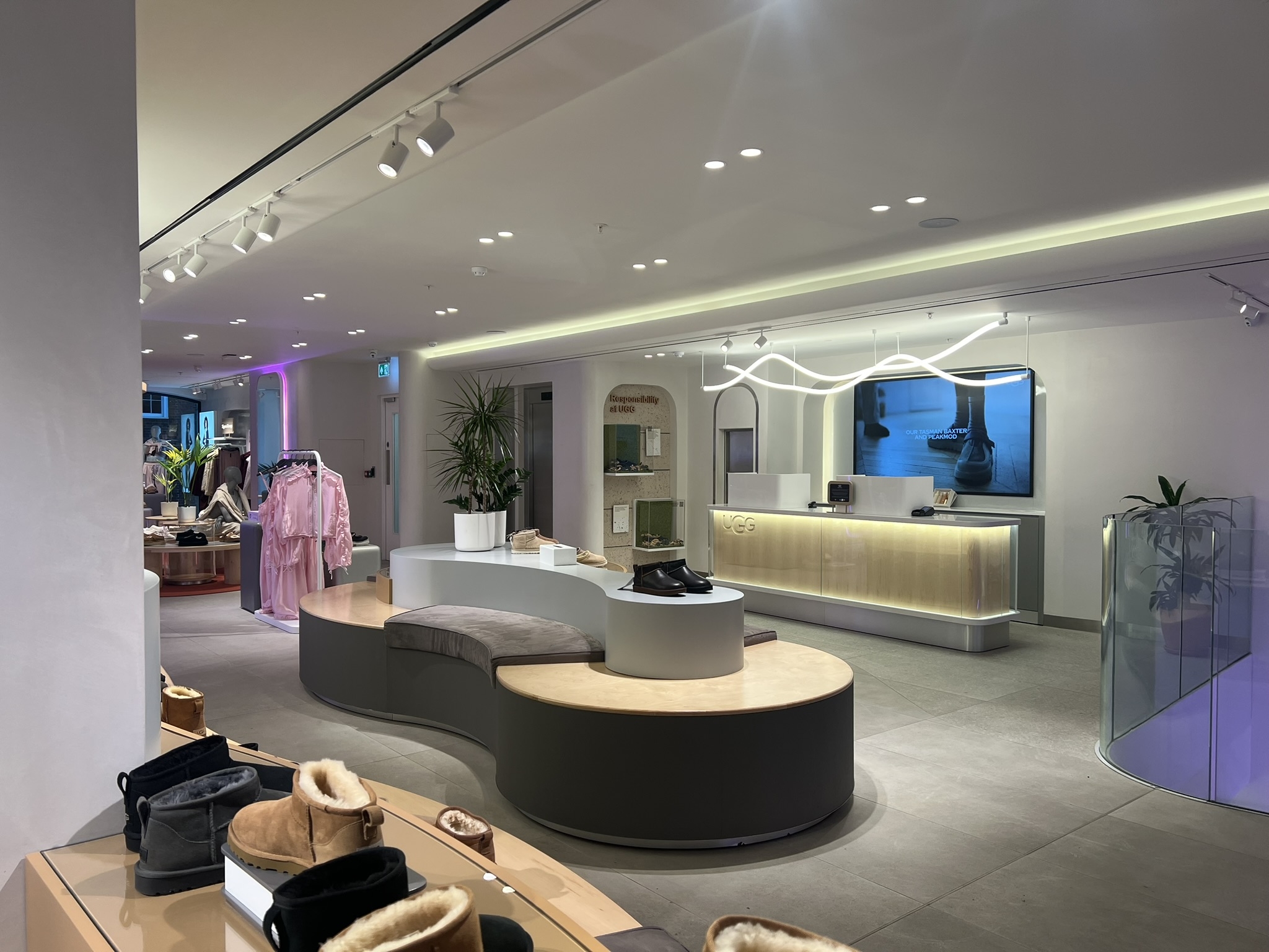 What appears as soft washes and effortless product presentation is underpinned by rigorous technical work. Light sources with the highest CRI and R-values were chosen to honour the hero product — the sheepskin boot — with absolute fidelity. Architectural details were calibrated to conceal luminaires seamlessly within the fit-out, making the execution appear natural while carrying the discipline of luxury design.