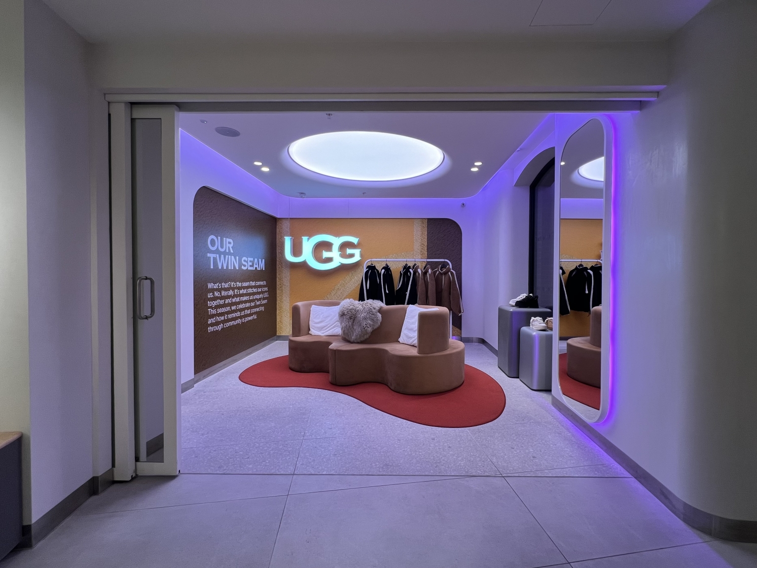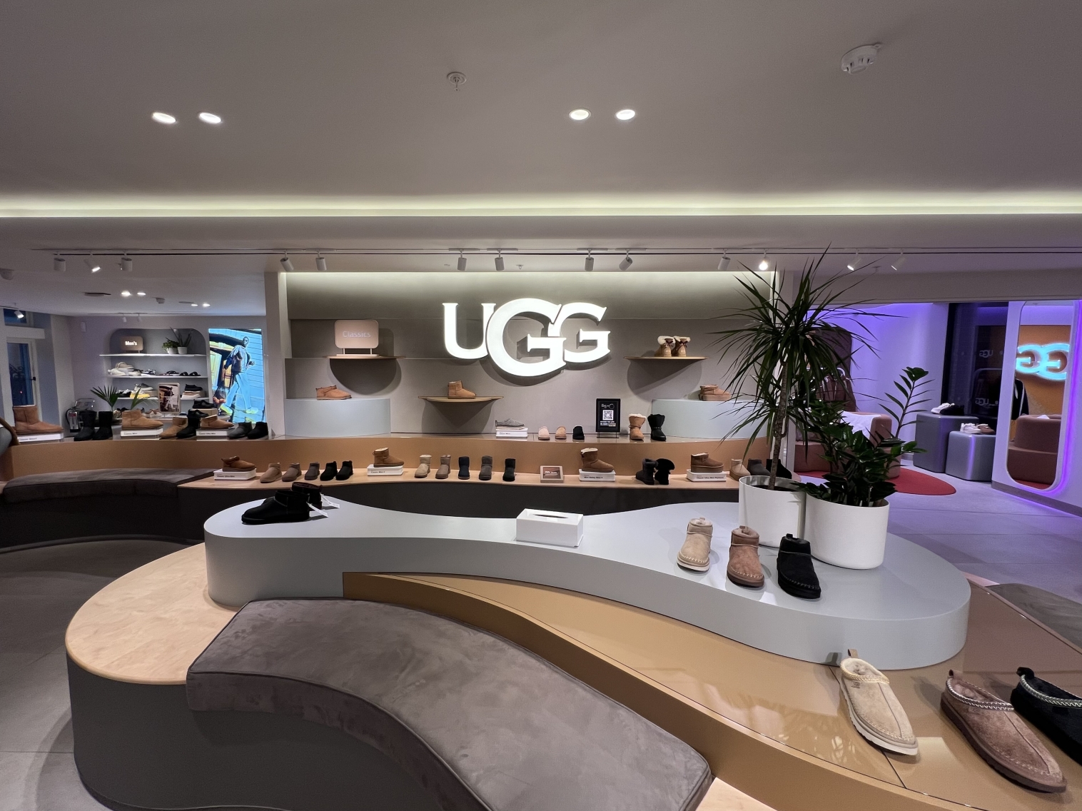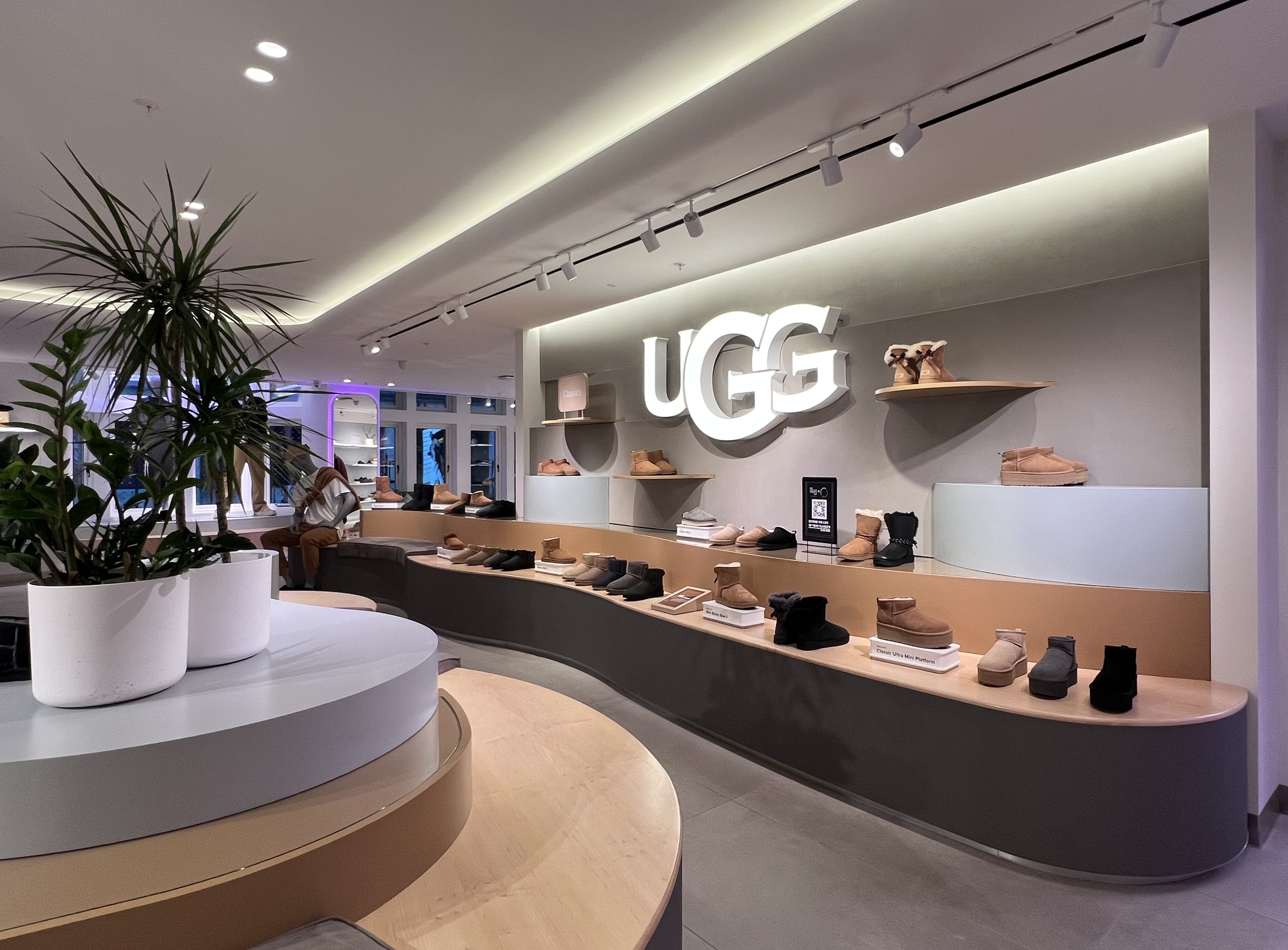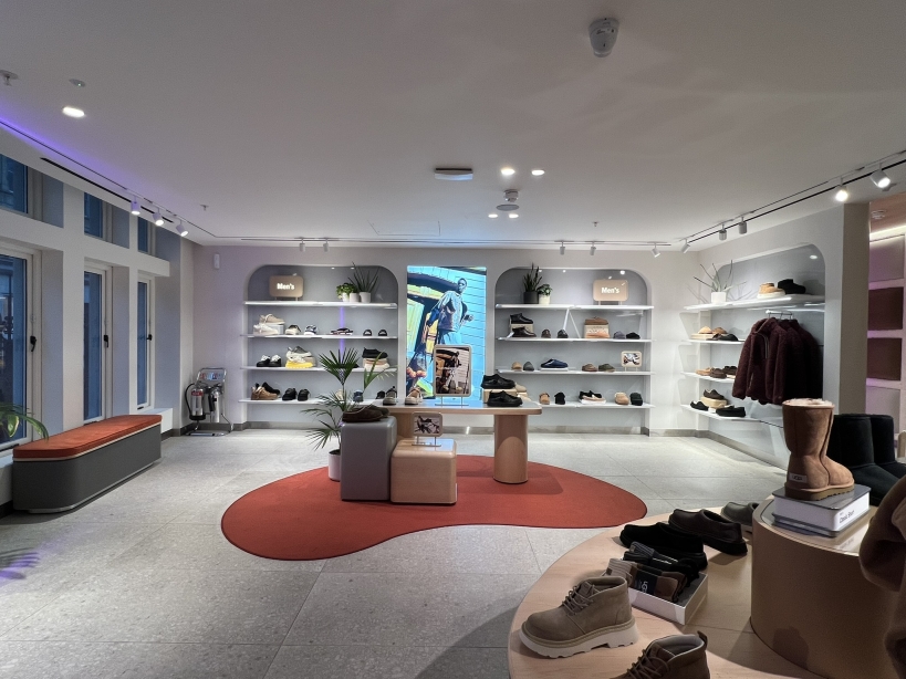 What appears as soft washes and effortless product presentation is underpinned by rigorous technical work. Light sources with the highest CRI and R-values were chosen to honour the hero product — the sheepskin boot — with absolute fidelity. Architectural details were calibrated to conceal luminaires seamlessly within the fit-out, making the execution appear natural while carrying the discipline of luxury design.