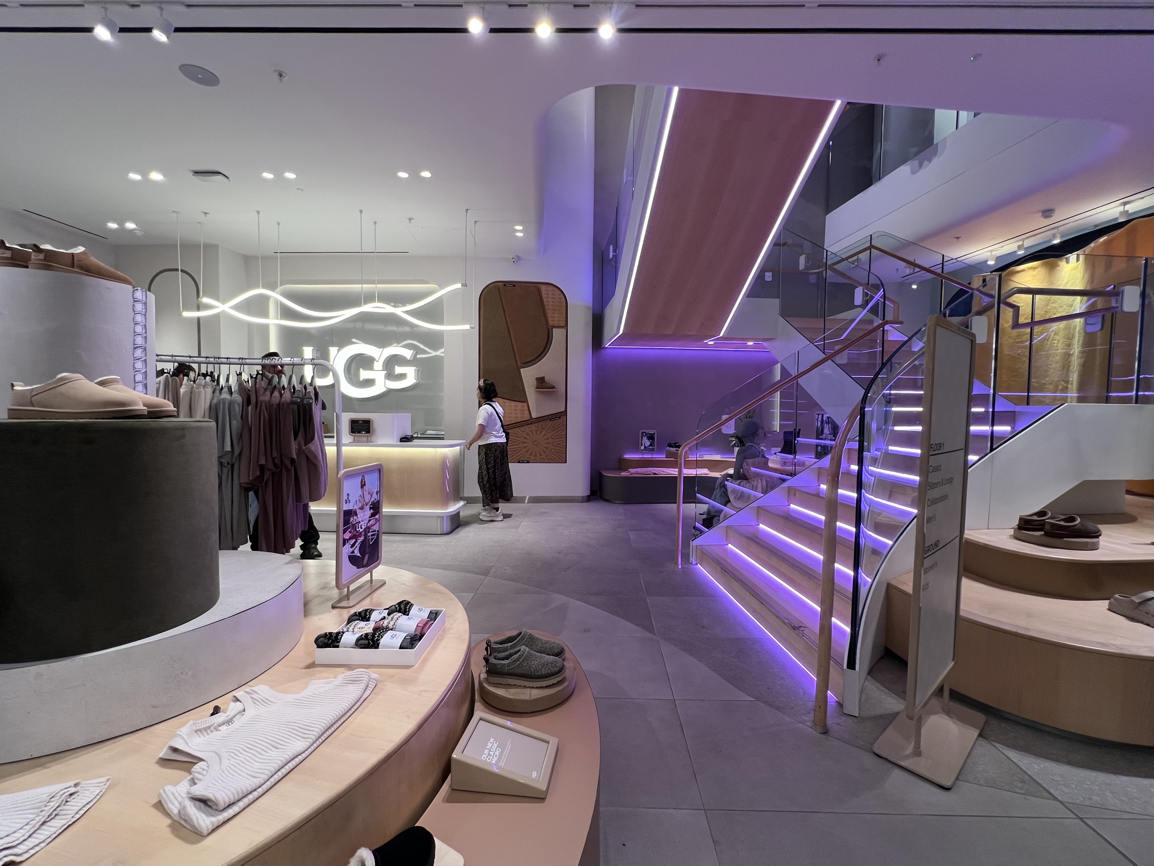 The result is a retail landscape of floating islands, luminous walls, and a vibrant stair that embodies UGG’s values of warmth, comfort, and ease. More than enhancing visibility, the lighting positions UGG confidently within its context — demonstrating that thoughtful, precise, and psychologically attuned illumination can redefine the presence of a high-street brand in one of the world’s most demanding luxury settings.