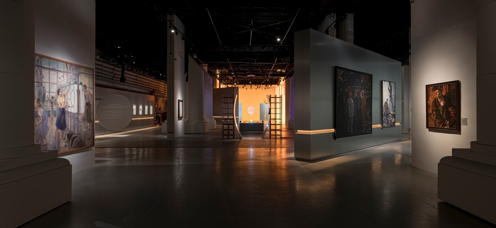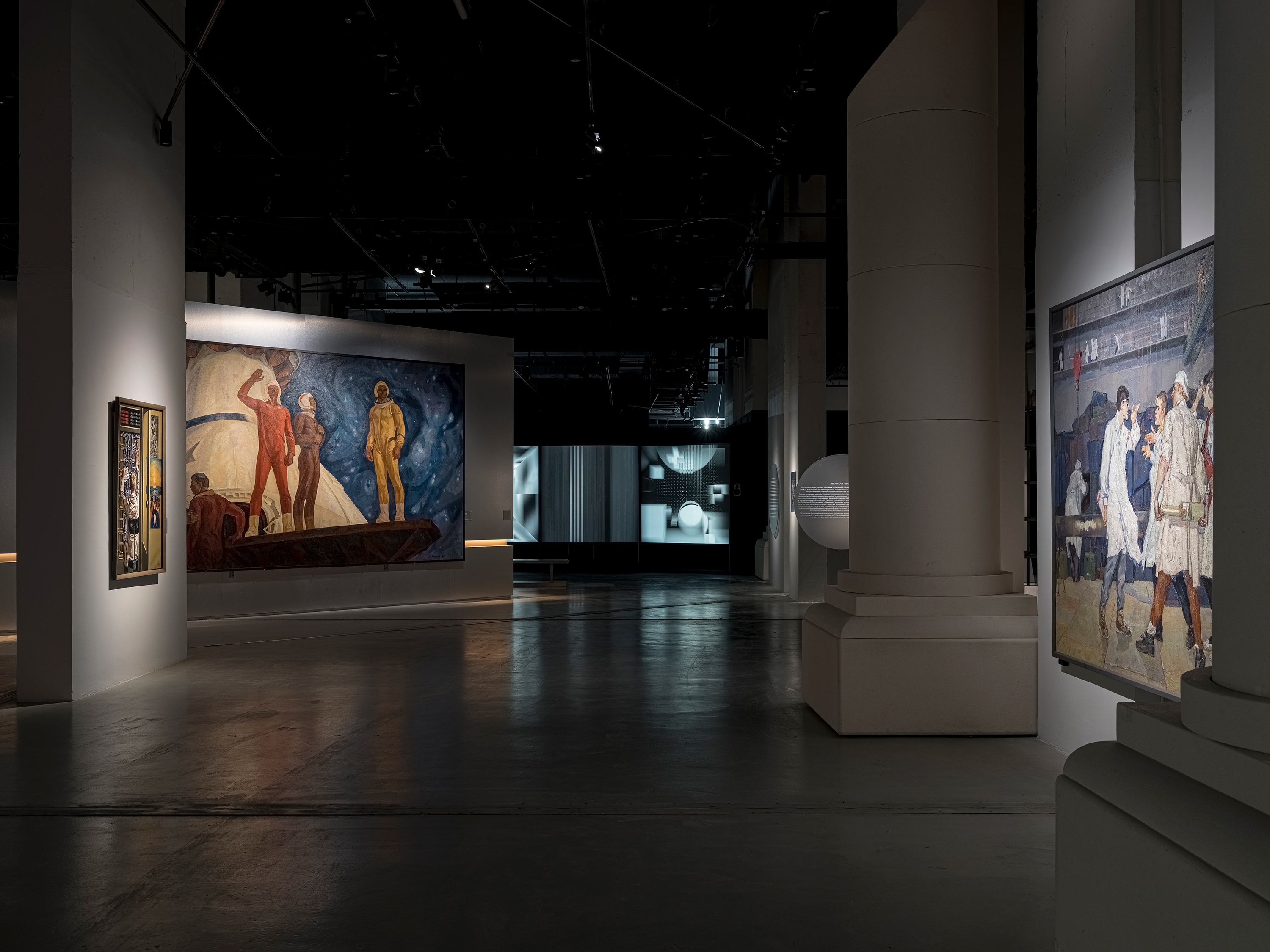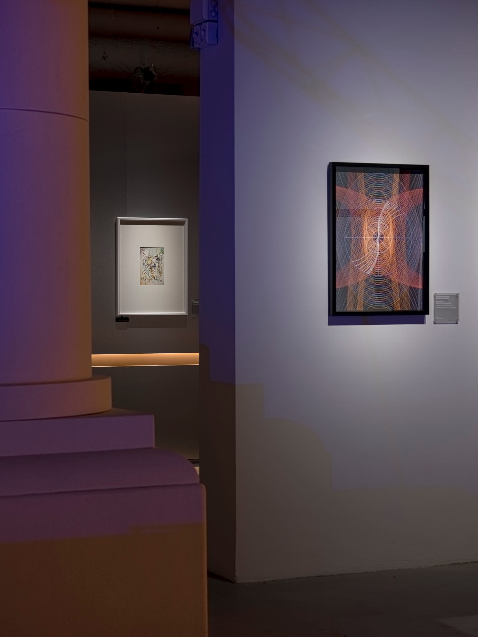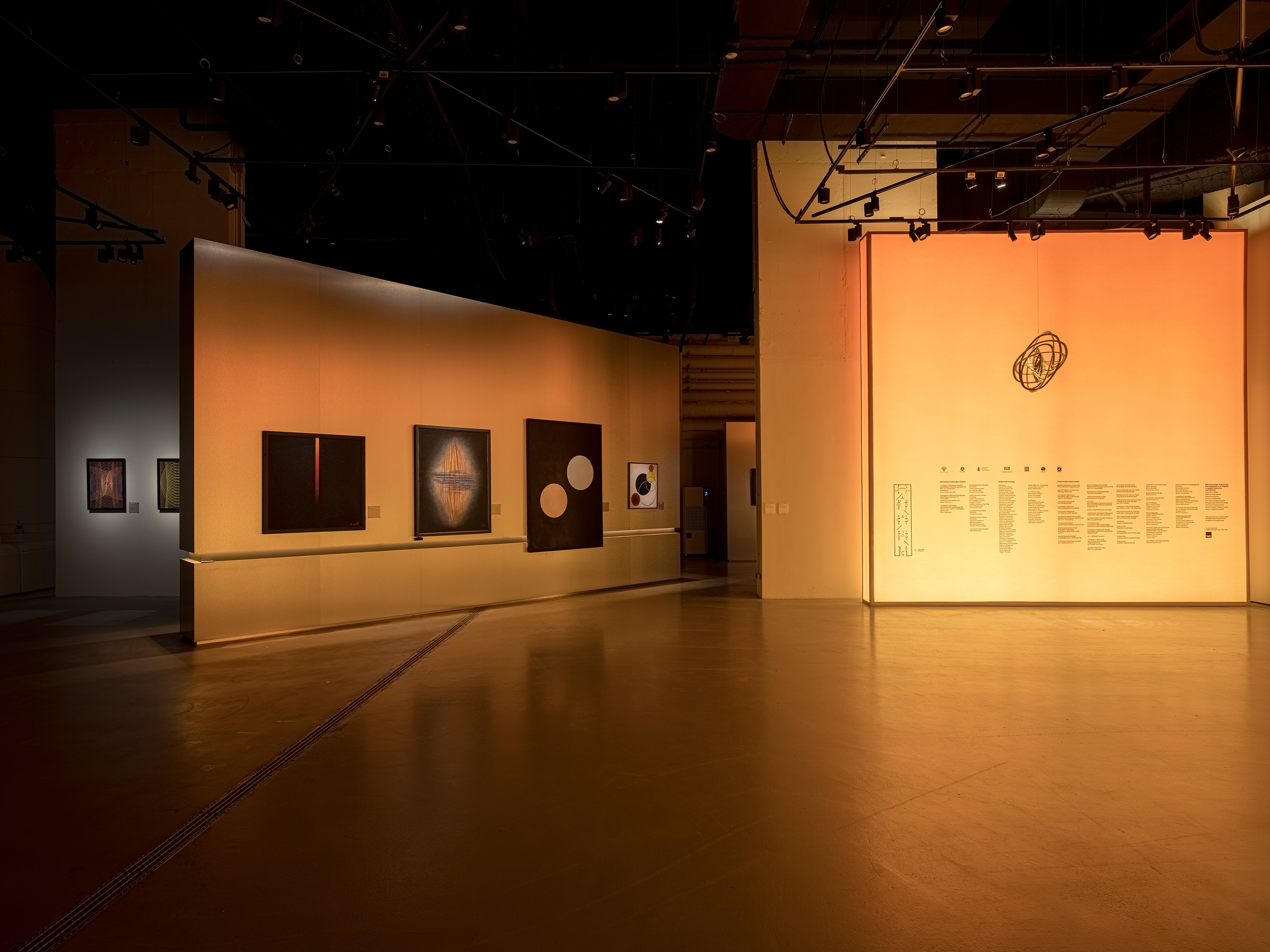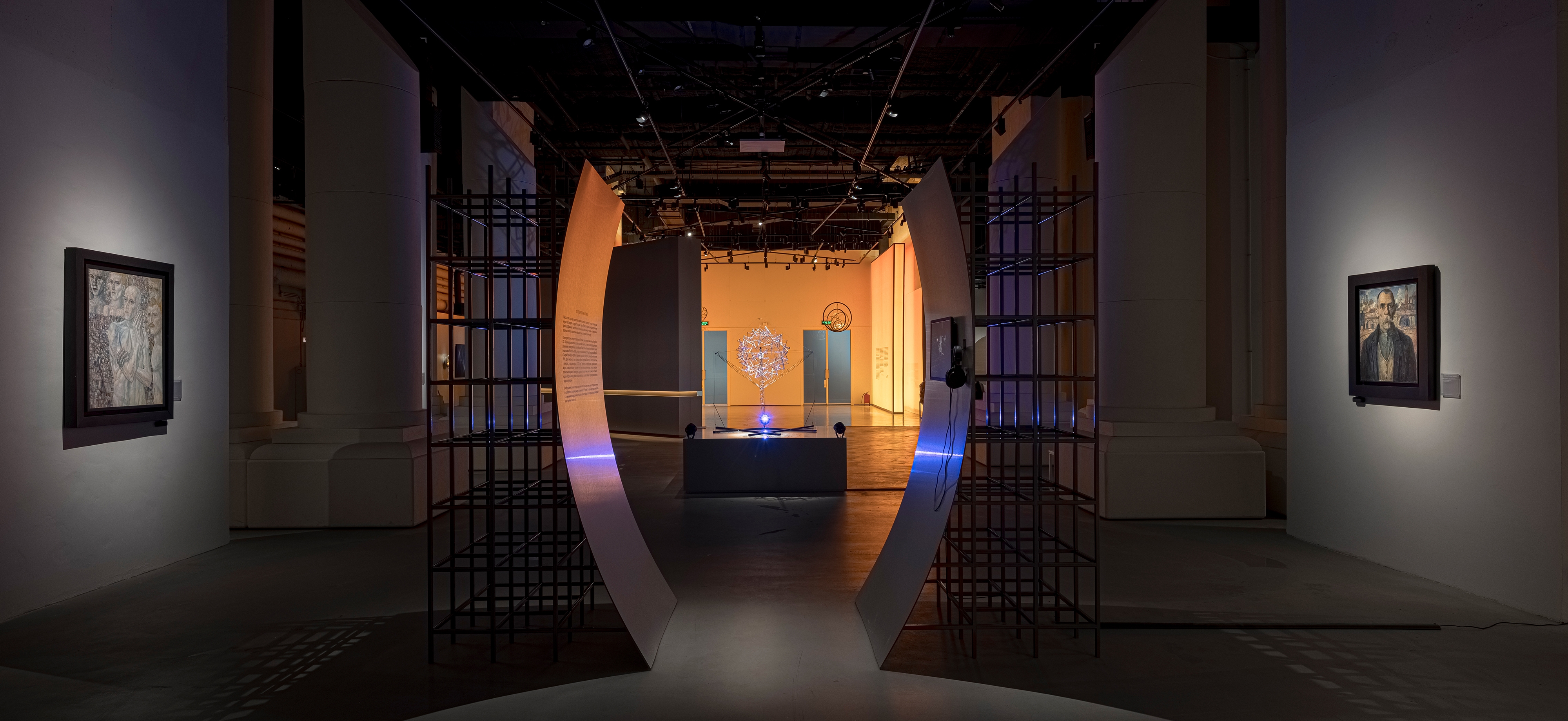 According to the vision of the architects and curators, visitors enter the exhibition through a portal symbolizing the energy flows of a nuclear reactor. This portal consists of two enormous lightboxes with gradient lighting ranging from ultra-warm orange to neutral white. These energy flows serve as the central leitmotif of the entire exhibition, continuing into each of its sections through accent warm light elements built into the walls. The exhibition lighting required extremely delicate work, as it was essential to maintain a balance between darkness and light. The light was meant to capture the artworks as if emerging from the darkness, enhancing the atmosphere of creation and focusing the viewers’ attention on the works of art.