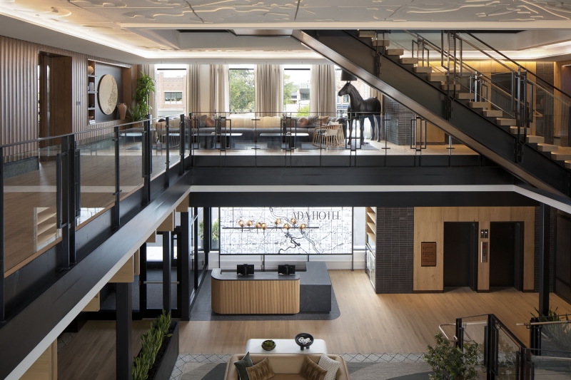 Entry DescriptionNestled in a vibrant community, the newly constructed Ada Hotel rises from the ashes of the original structure lost to fire in 1942. Designed as a welcoming destination for visitors and locals, the hotel honors its past while embracing a modern hospitality experience. A thoughtfully integrated lighting approach blends natural and electric light to elevate the architectural character and atmosphere throughout.