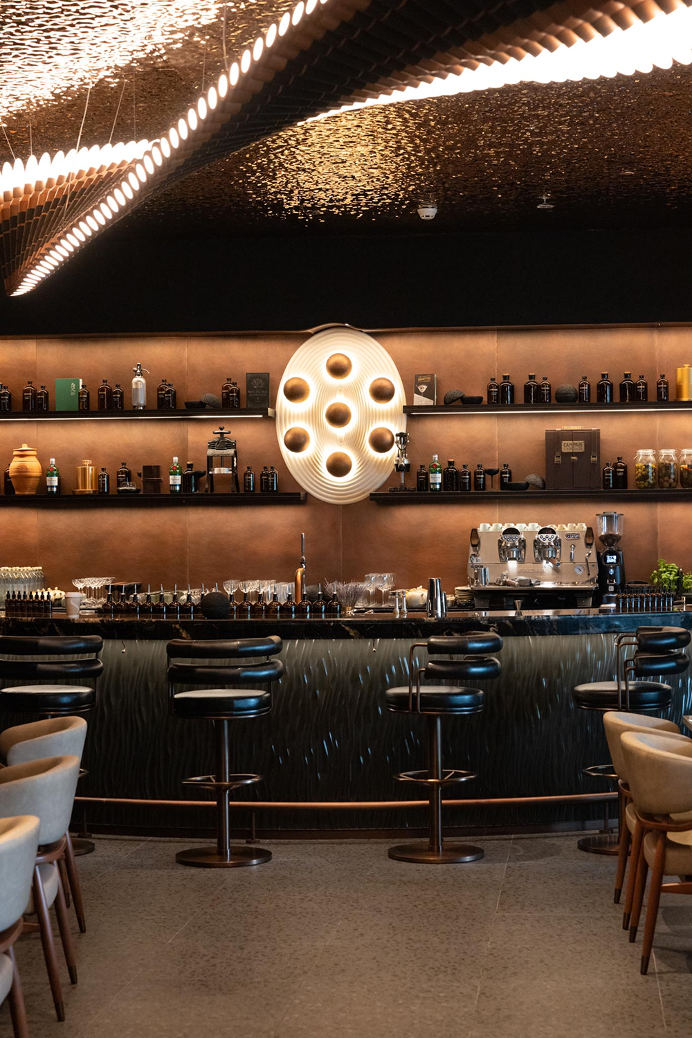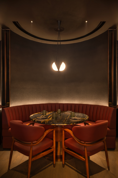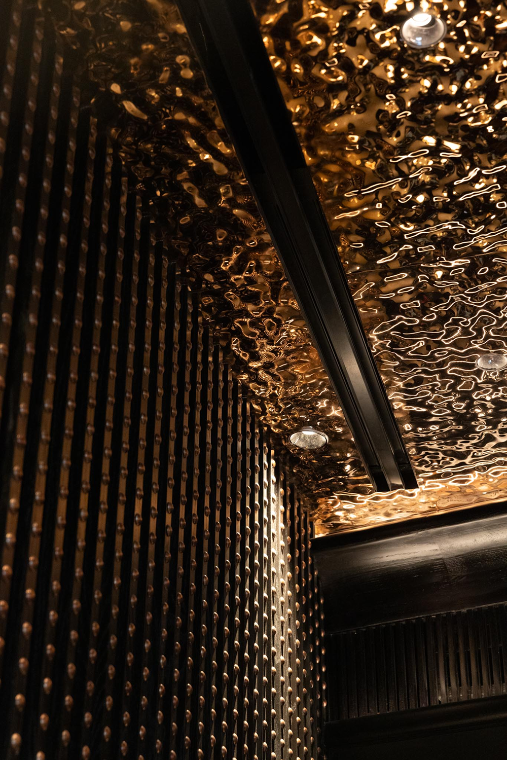 Throughout the restaurant, the lighting is moody and subdued to heighten the experience. Space-defining lines of light create a strong visual impact in the reception and extend into the restaurant, wrapping the banquette seating in intimacy and highlighting the hammered texture of the metal ceiling. Contrasting layers of light and shadow were also used to form soft halos of illumination around the table areas. The subtlety of the lighting draws the eye through to the show kitchen and gives the sculptural bullet installation space to shine.