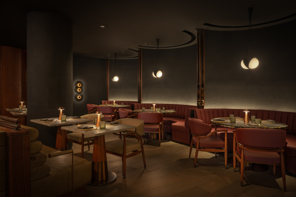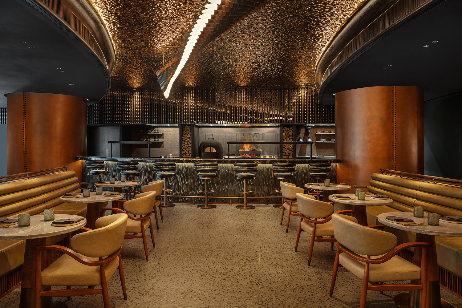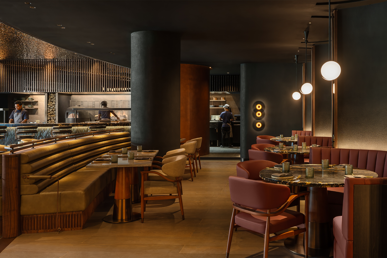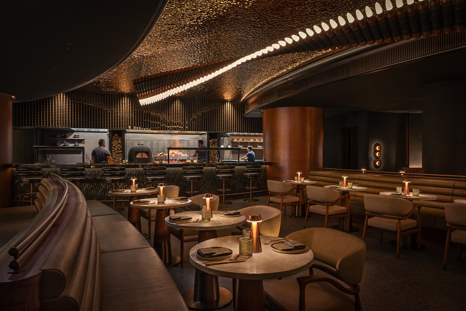 Throughout the restaurant, the lighting is moody and subdued to heighten the experience. Space-defining lines of light create a strong visual impact in the reception and extend into the restaurant, wrapping the banquette seating in intimacy and highlighting the hammered texture of the metal ceiling. Contrasting layers of light and shadow were also used to form soft halos of illumination around the table areas. The subtlety of the lighting draws the eye through to the show kitchen and gives the sculptural bullet installation space to shine.