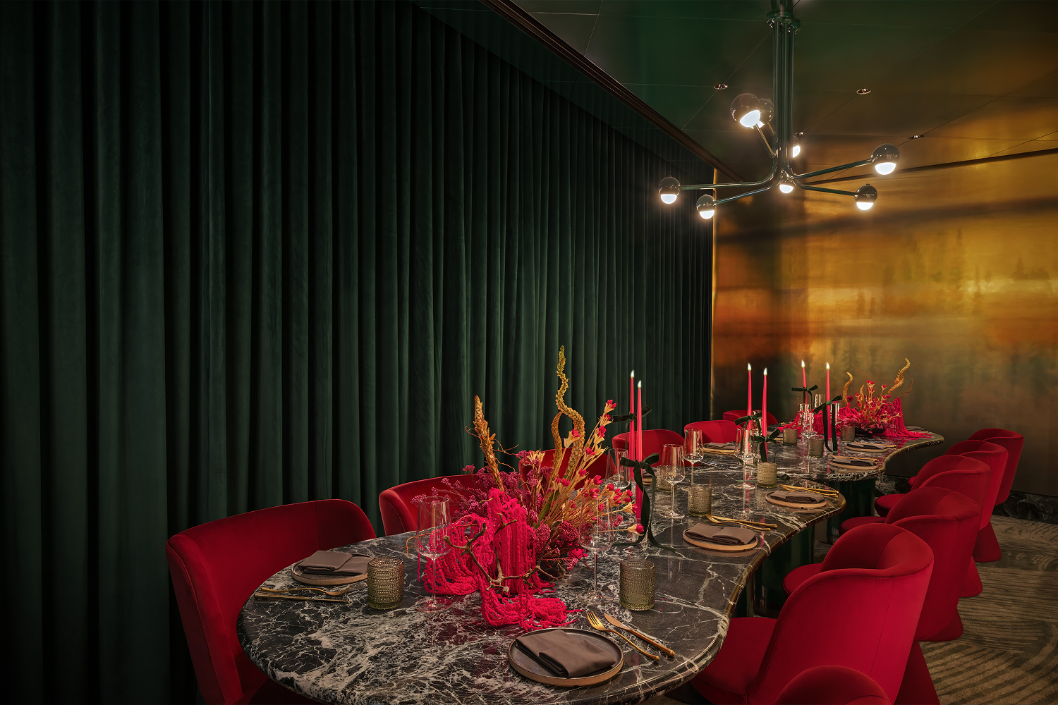 Entry DescriptionRevolver elevates maximalist dining to new heights. From the luscious palette of dark hues and tactile finishes to its central visual anchor – a dramatic belt of bullets – every detail is crafted to achieve drama and impact.