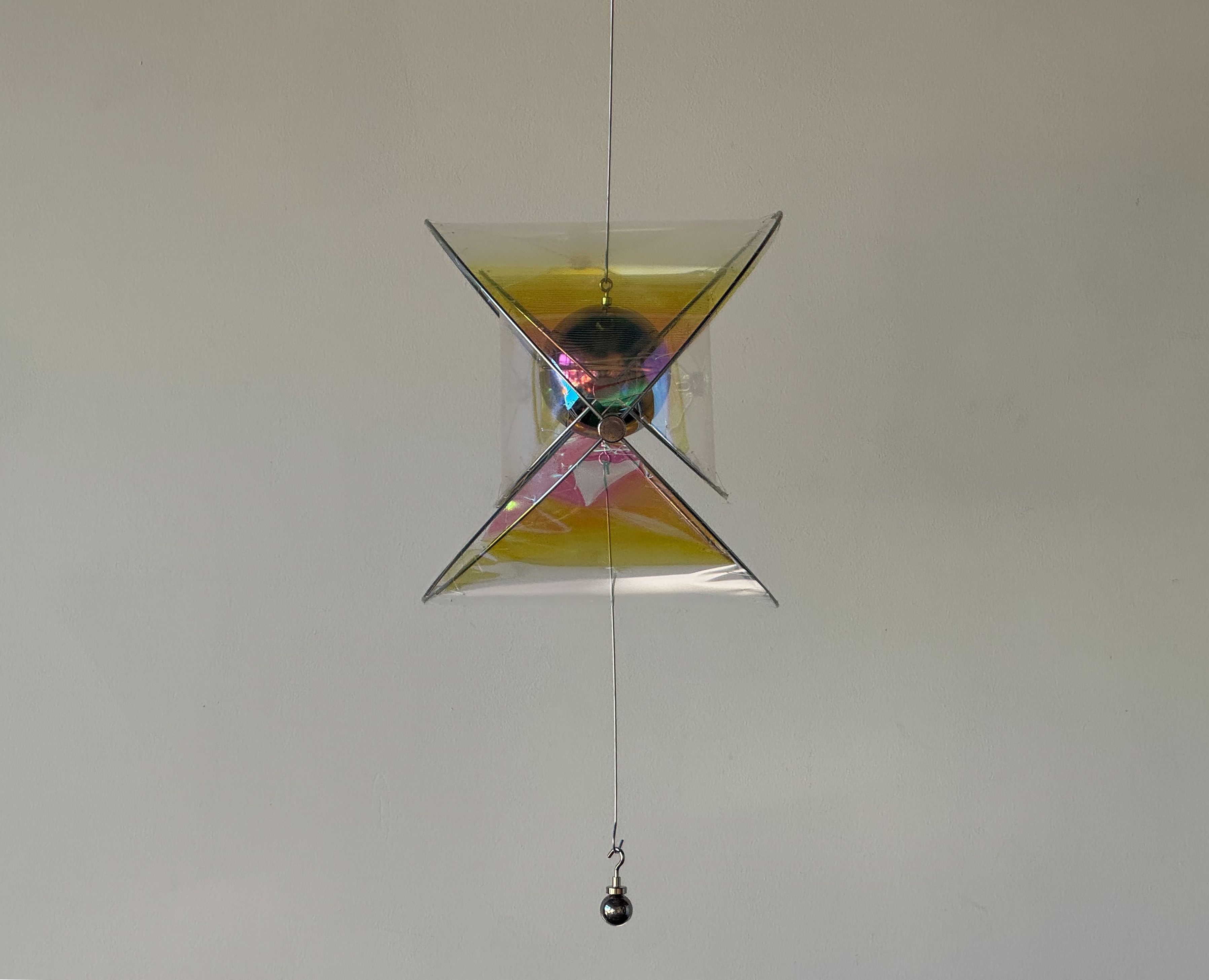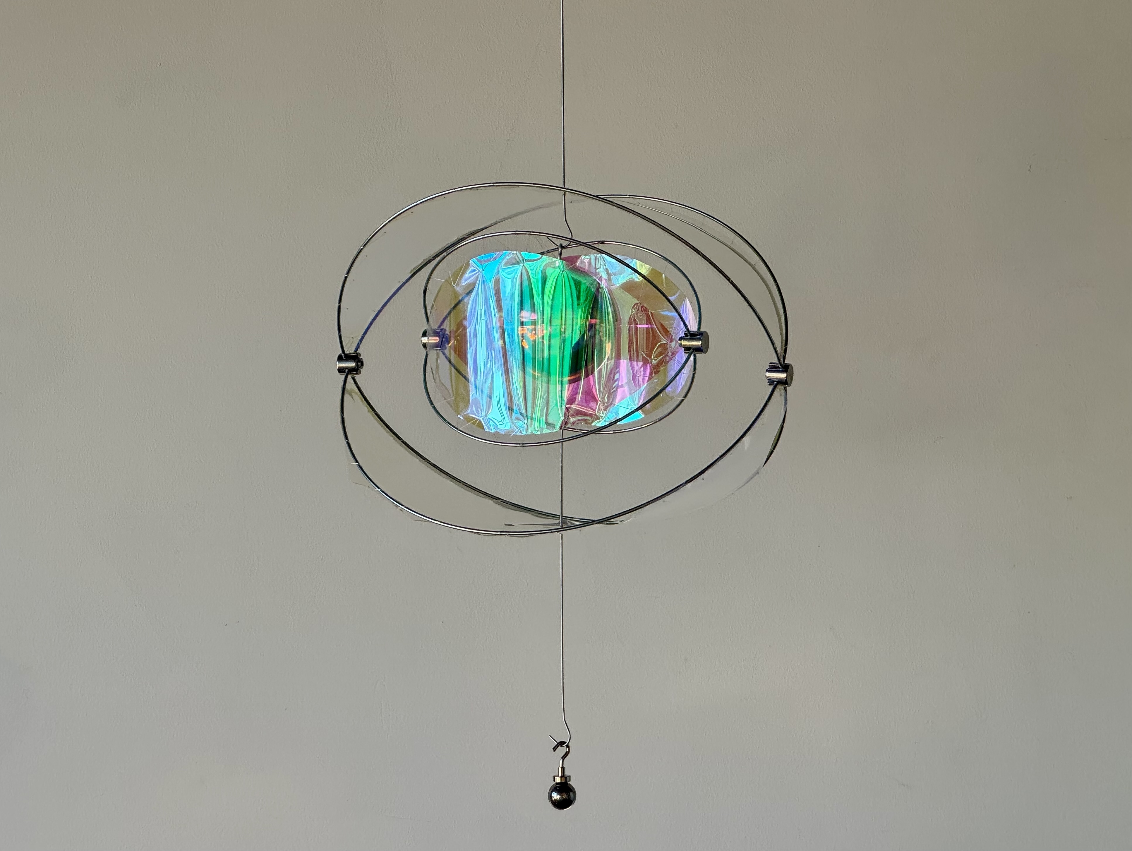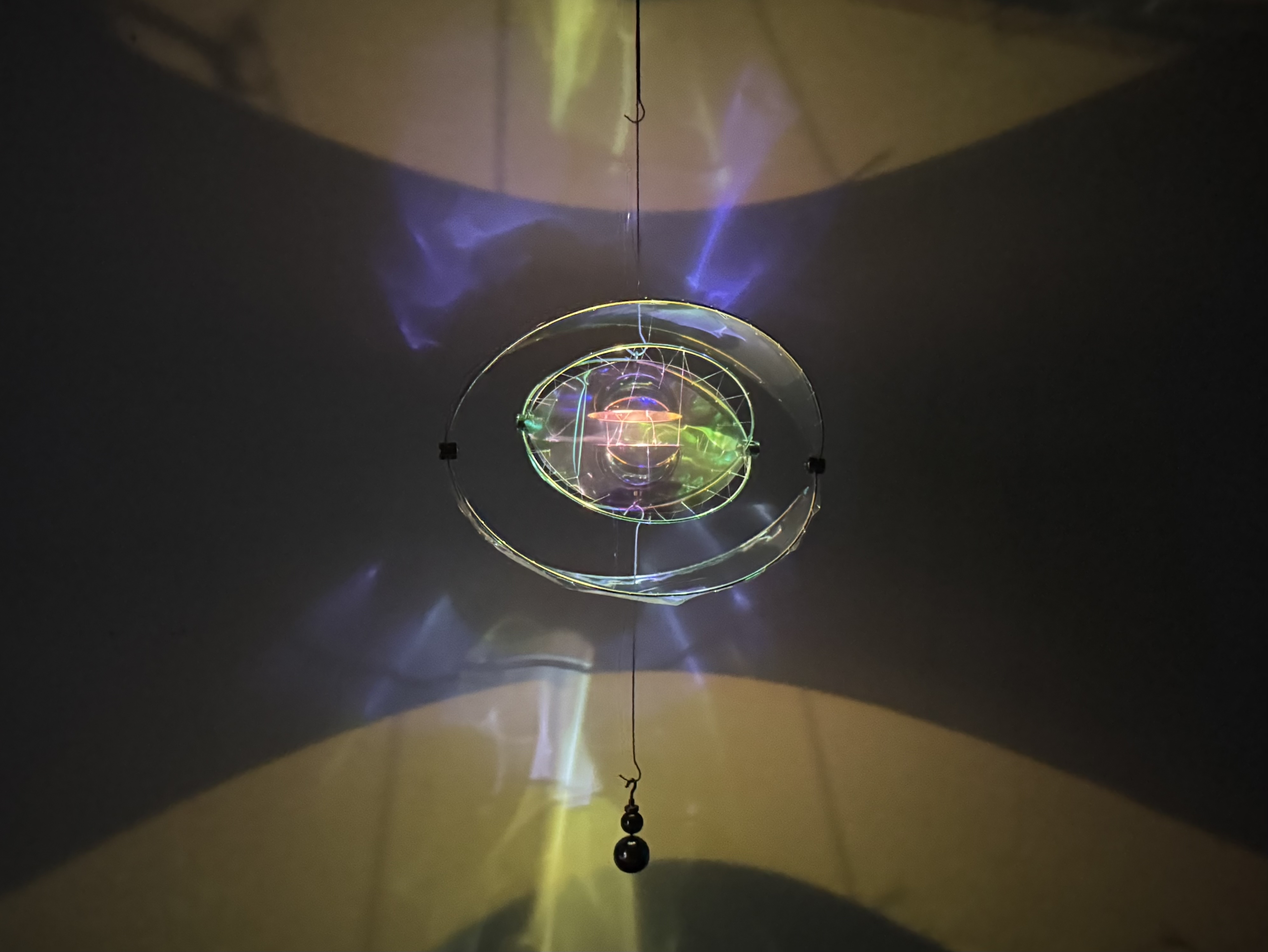 Entry DescriptionLumen Touch is an interactive decorative luminaire that redefines the way users experience illumination. Rather than switching or dimming the light directly, users influence its behavior through subtle physical interaction: adding weight to the lower hook shifts the structure, expanding the space between two polished metal hemispheres, each containing an internal light source. Reflected uplight and downlight pass through iridescent filters, casting evolving color patterns onto the surrounding environment. Under daylight, the reflective surfaces scatter delicate hues, keeping the piece alive without artificial illumination. Acting as a reflective sculpture by day and an atmospheric luminaire by night, Lumen Touch invites users to explore light through touch and movement—transforming every interaction into a tangible, playful, and poetic experience that blurs the boundaries between product, art, and interaction.