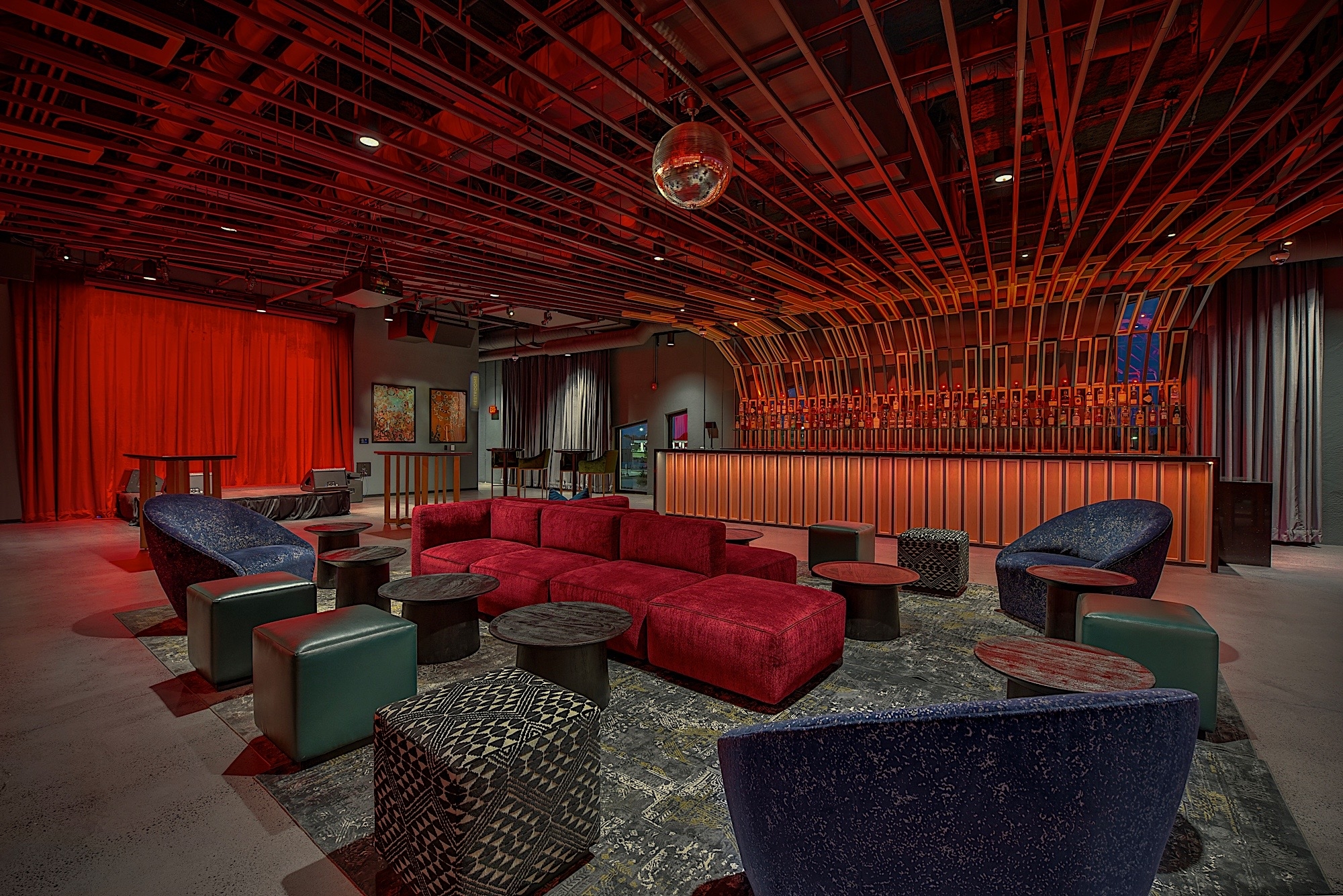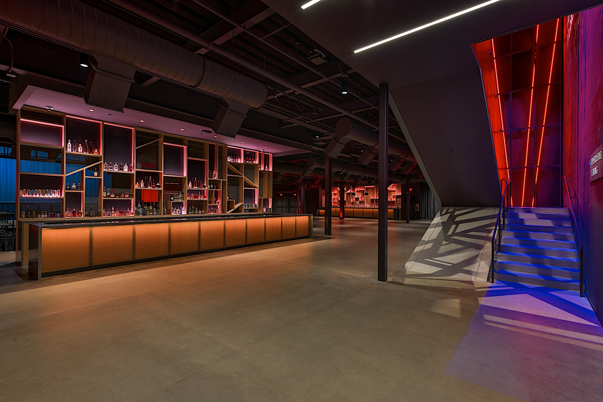 Each bar features a distinct lighting scheme that reflects its architectural style. The VIP bar, known as the Red Room, features subtle red accents and ambient lighting that invites guests to relax in luxury. Decorative pendants and flexible lighting support various event layouts.