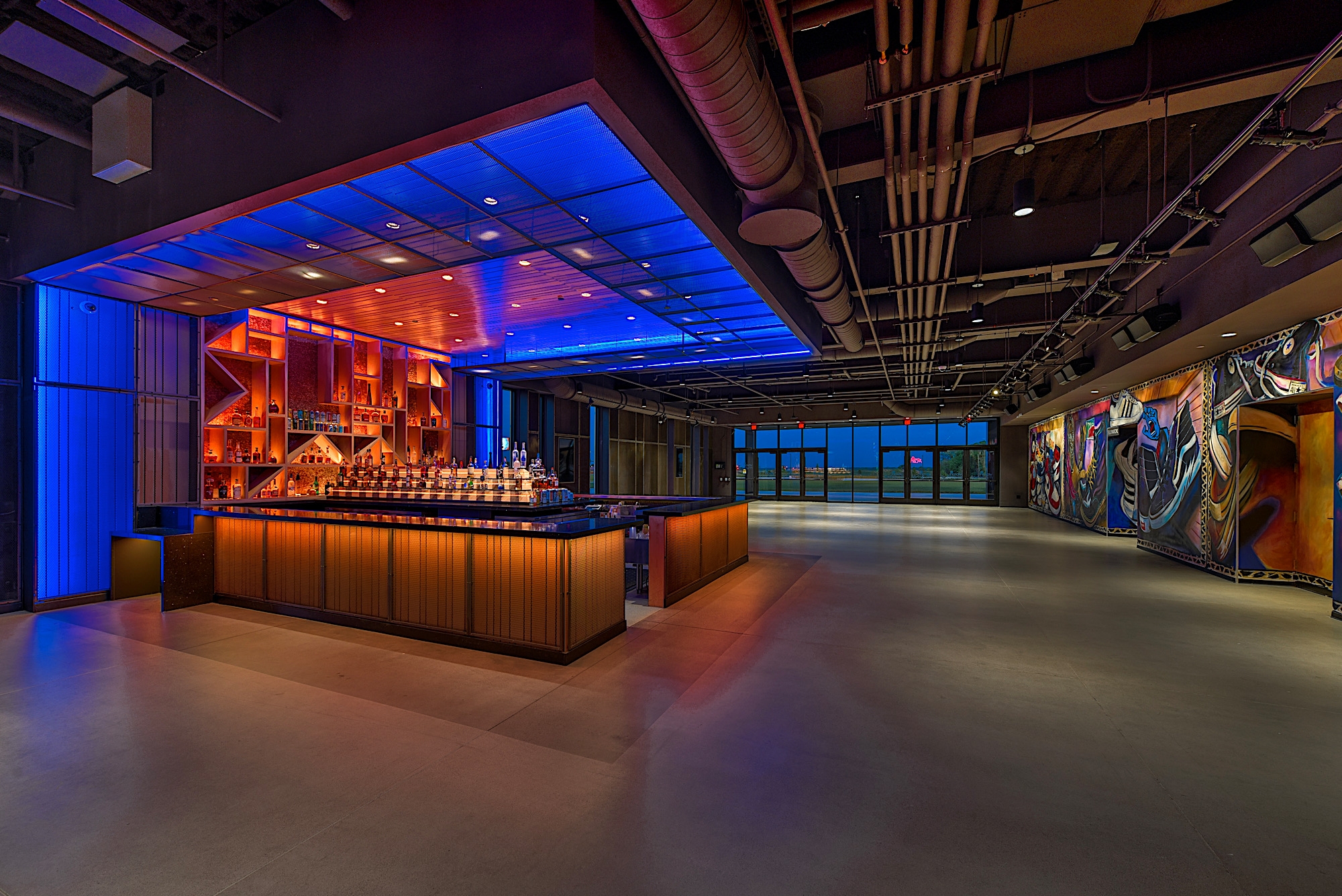 In the lobby, lighting creates an inviting atmosphere for guests to gather. A mix of warm and cool tones highlights the bar back and liquor tiers, while downlights illuminate the central bar tier and bar top for smooth transactions. Lighting on the opposite wall brings attention to floor-to-ceiling murals, enriching the guest experience.