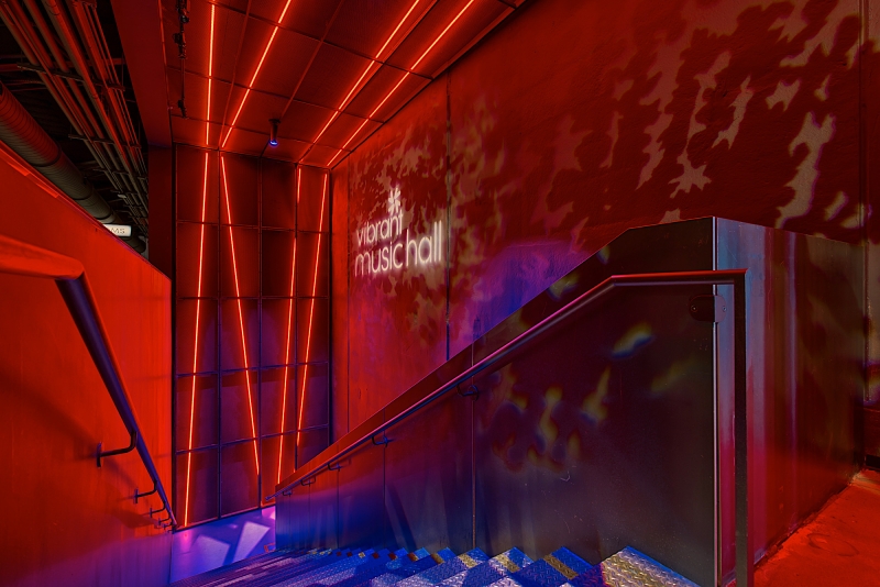 Entry DescriptionThe lighting design for this music venue reinforces the brand identity and creates a striking icon that envelopes guests in the brand experience. Dynamic architectural lighting enhances visibility and excitement, enticing visitors to explore the different spaces. Each space is tailored to its audience, using color, intensity, and texture to create a cohesive and immersive experience unique to the venue.
