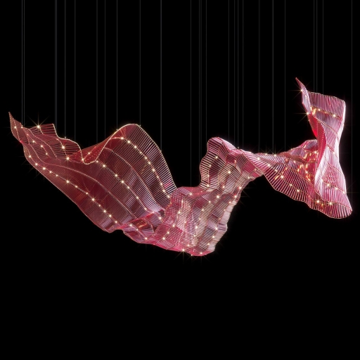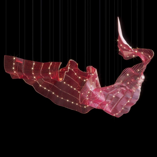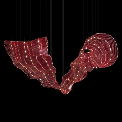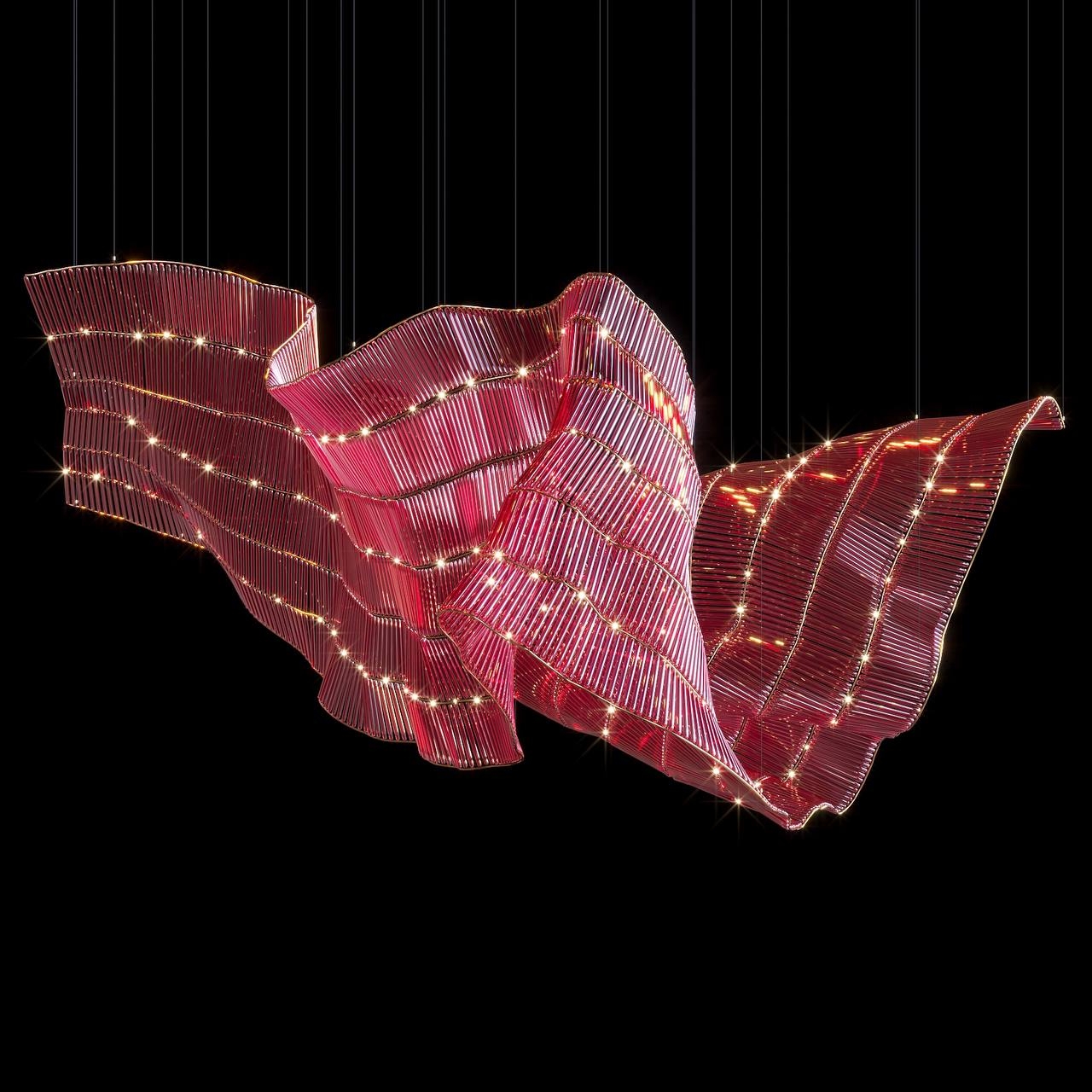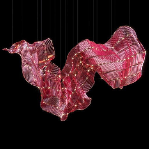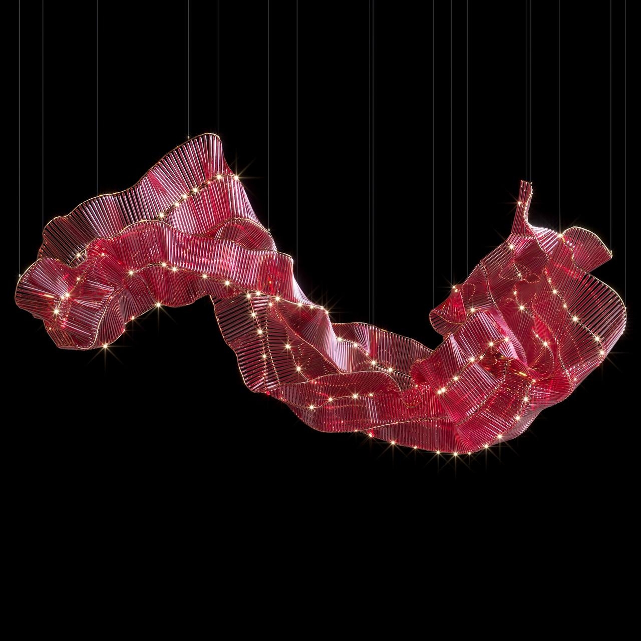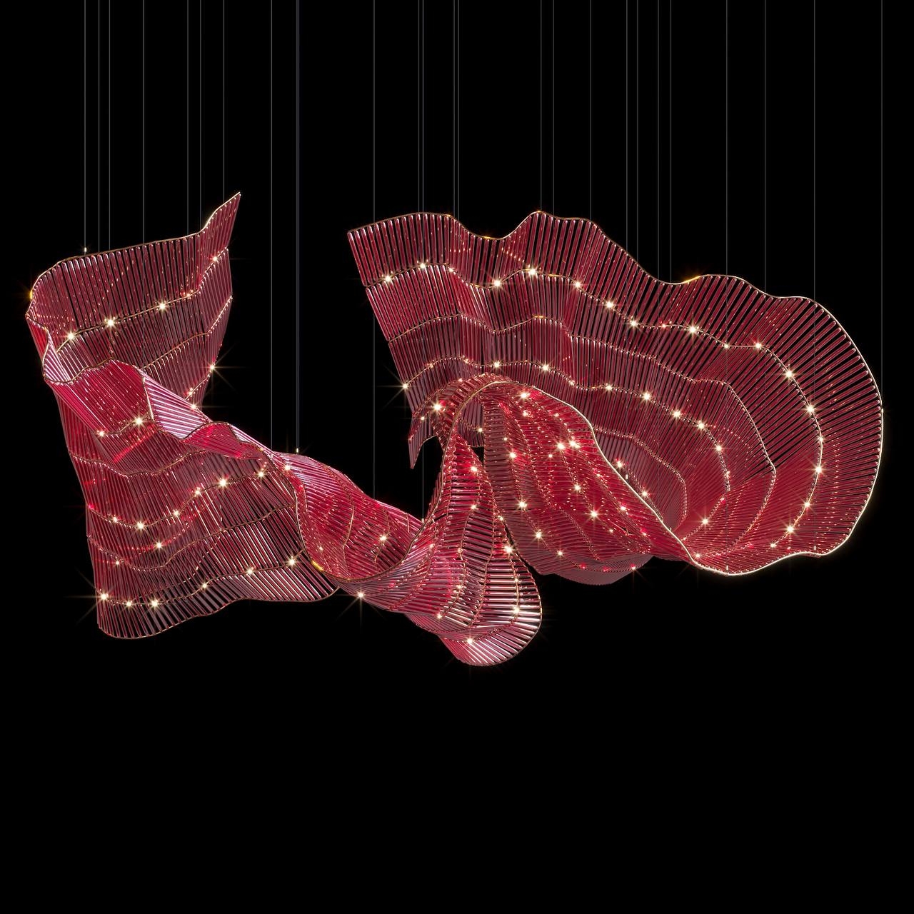 Materials: The composition is made of thin glass rods that refract and reflect light. These are mounted on a flexible metal frame, ensuring dynamic and adaptable forms.