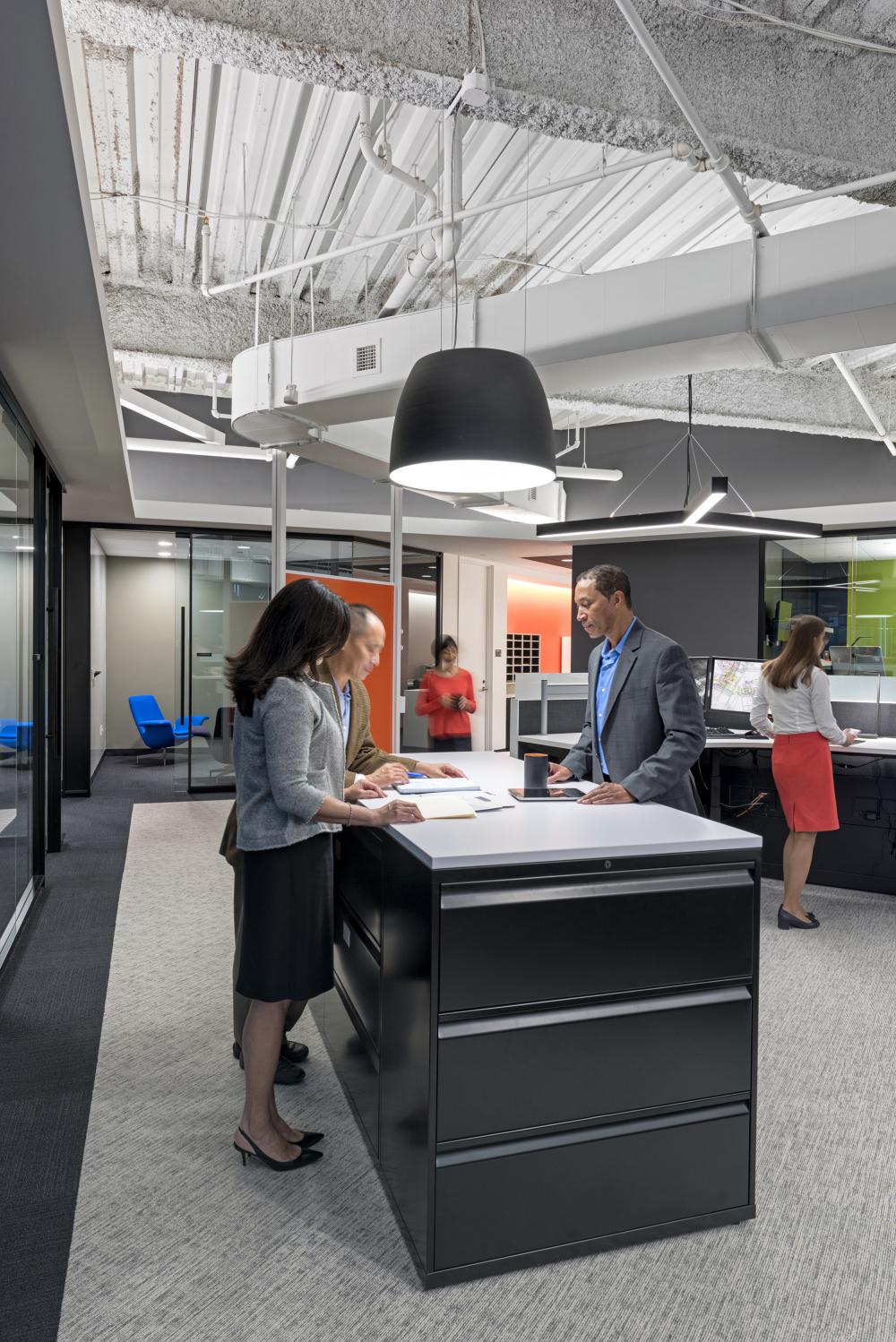 Magnifying the quiet brilliance of many scientists, and casting light into the dark shadows of a tired, old 1980s building was the primary goal of the design team. The remarkable minds that helped Apollo 11 safely navigate to the moon in 1969 needed an environment conducive to their highest levels of performance. The new interior design needed to reflect the intelligence, creativity, and ingenuity of these scientists, to help display their services and perform their crafts. The 7th floor is the first impression for the outside world. That's where the design team started the transformation. Each programmed space utilizes a unique visual enhancement conducive to the programmed usage. Incorporating LED light sources exclusively, the design team was able to achieve lighting power densities 26% below the energy code. Further energy reduction is accomplished through automatic daylight dimming in all perimeter zones, and vacancy sensors in small offices and meeting rooms.