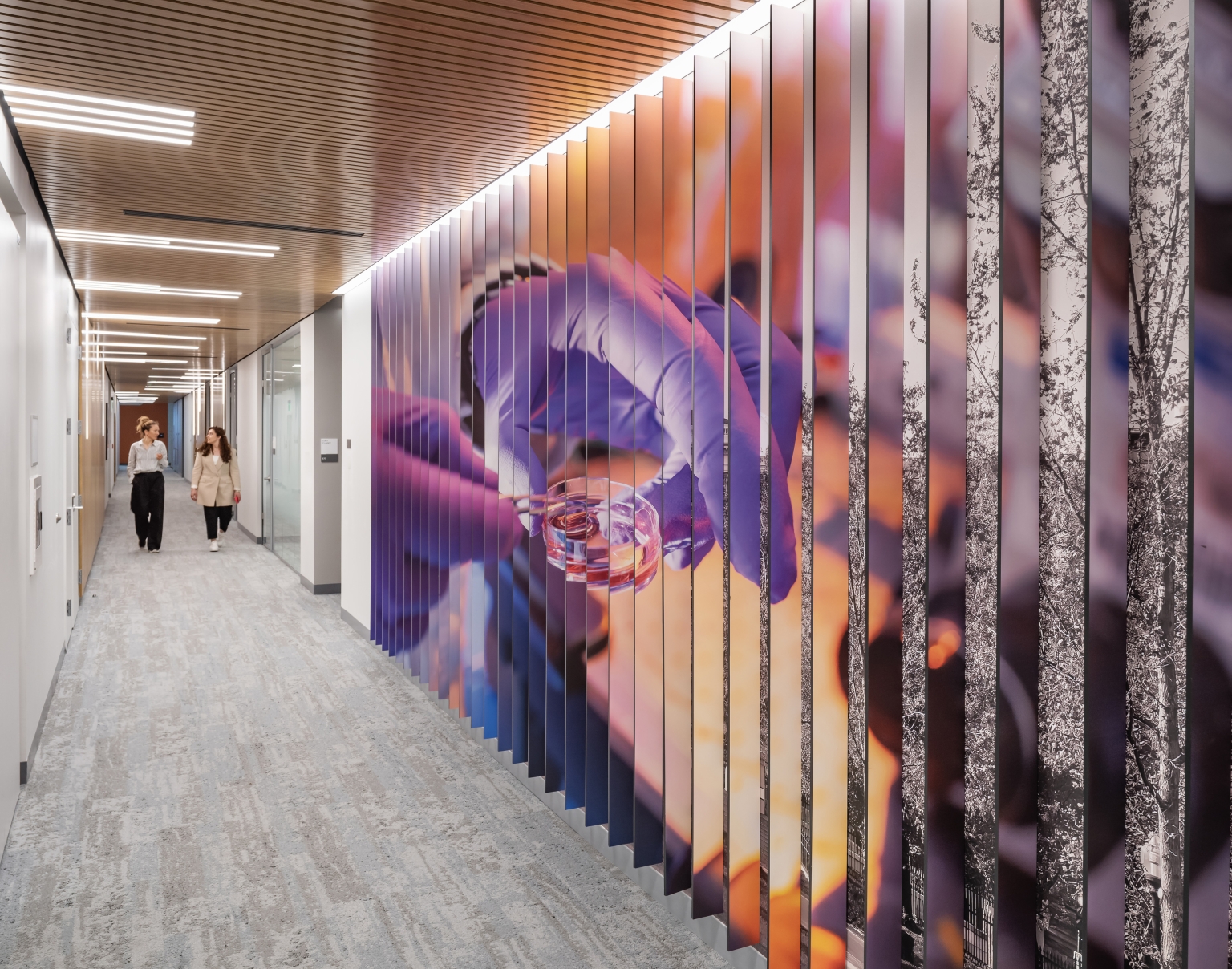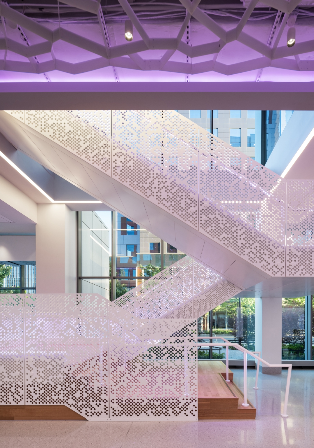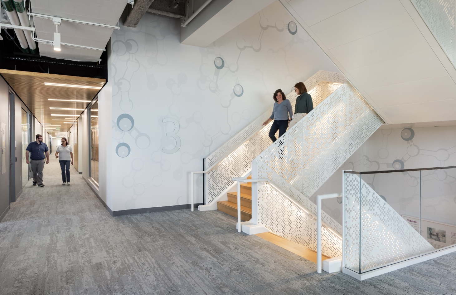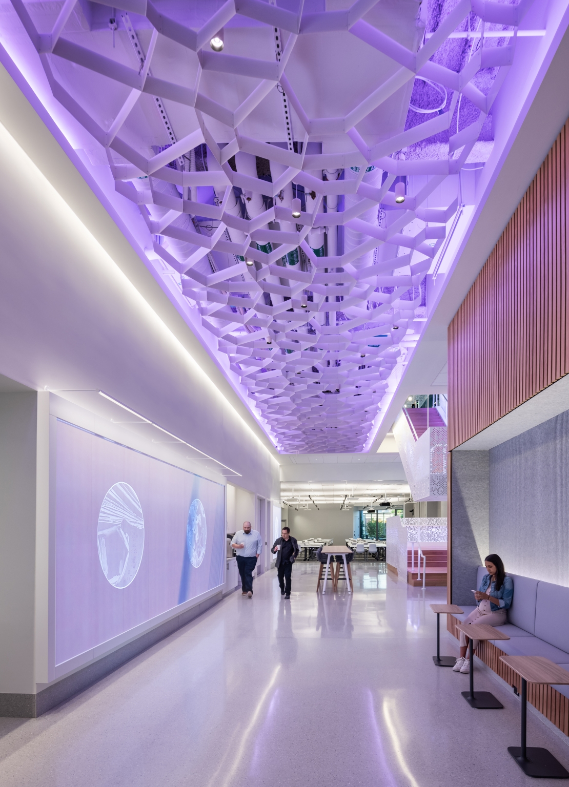 Guided by the concept “Connections Through Color,” color-changing RGBW lighting animates ceilings, stairs, and the building’s conference tower, linking spaces visually through a DMX-controlled network. Murals and graphics throughout the labs are evenly illuminated with fixtures carefully integrated into shallow plenums.