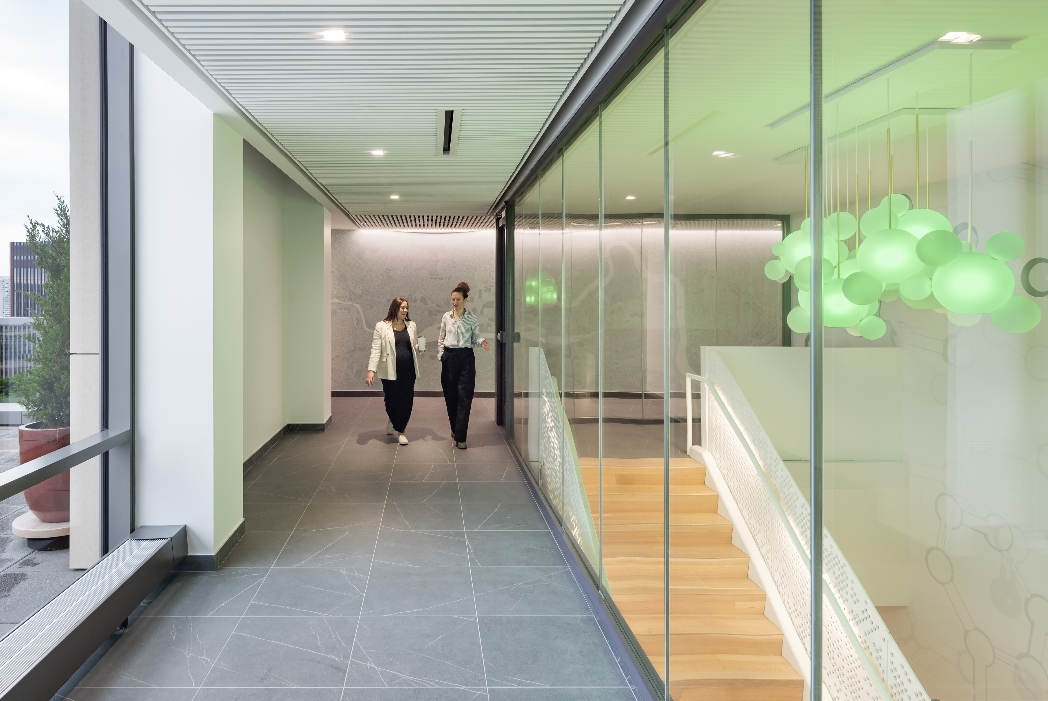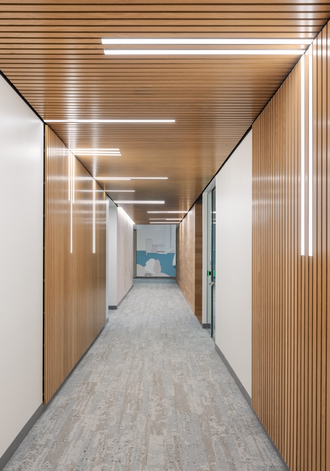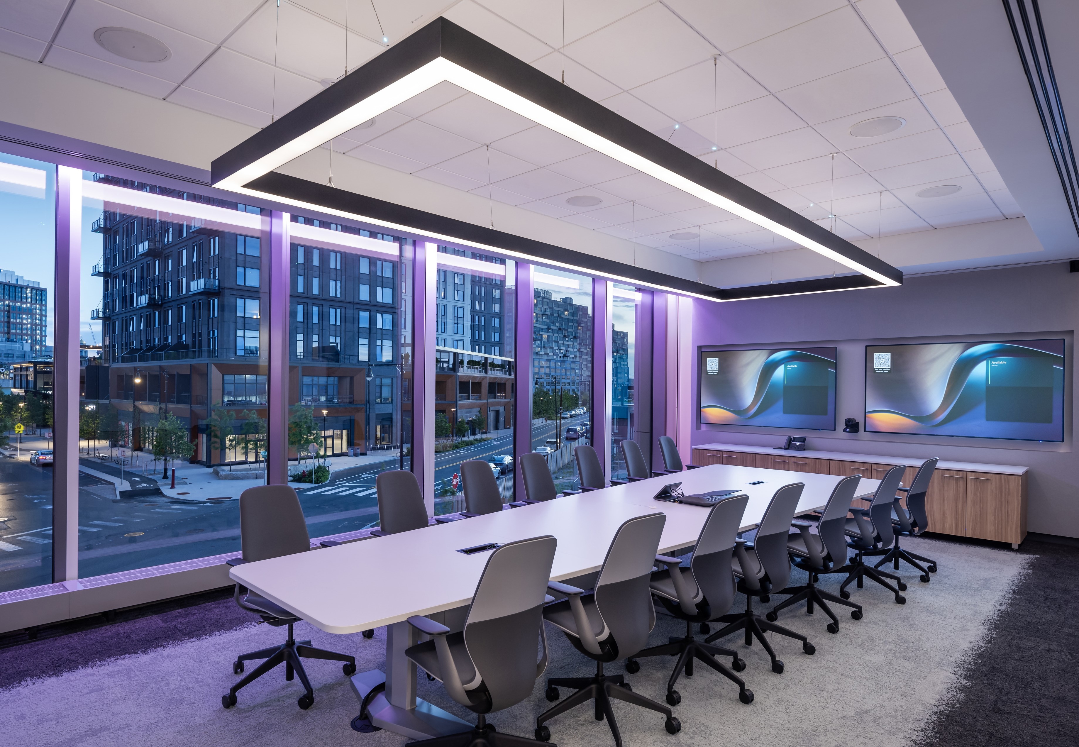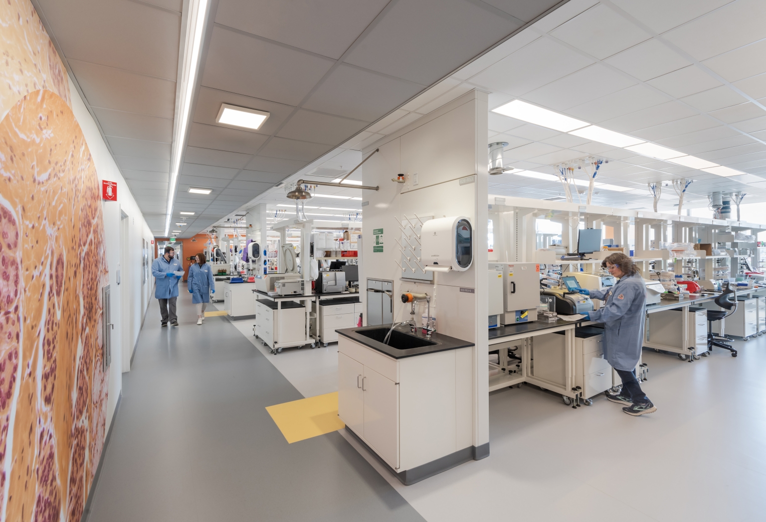 Guided by the concept “Connections Through Color,” color-changing RGBW lighting animates ceilings, stairs, and the building’s conference tower, linking spaces visually through a DMX-controlled network. Murals and graphics throughout the labs are evenly illuminated with fixtures carefully integrated into shallow plenums.