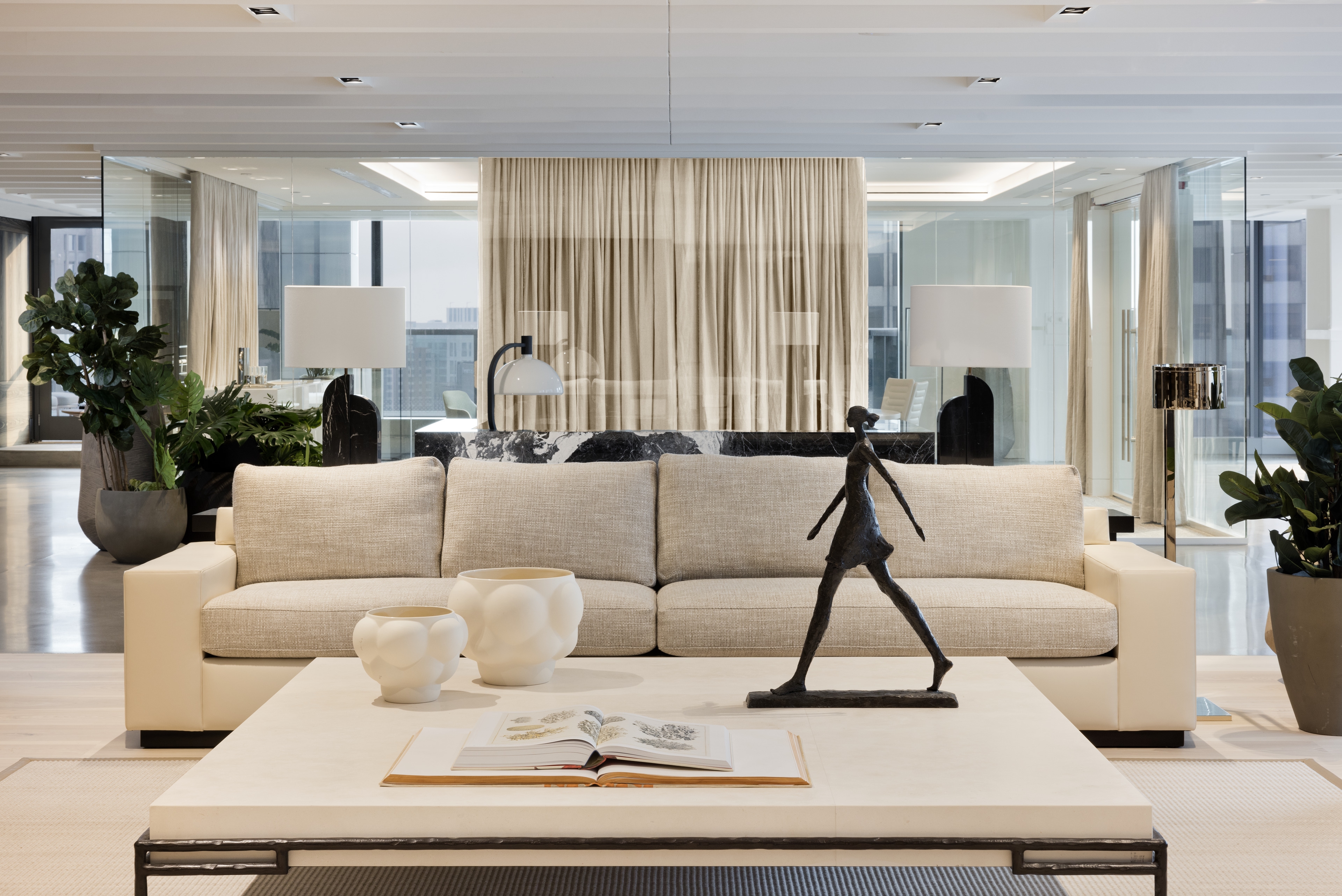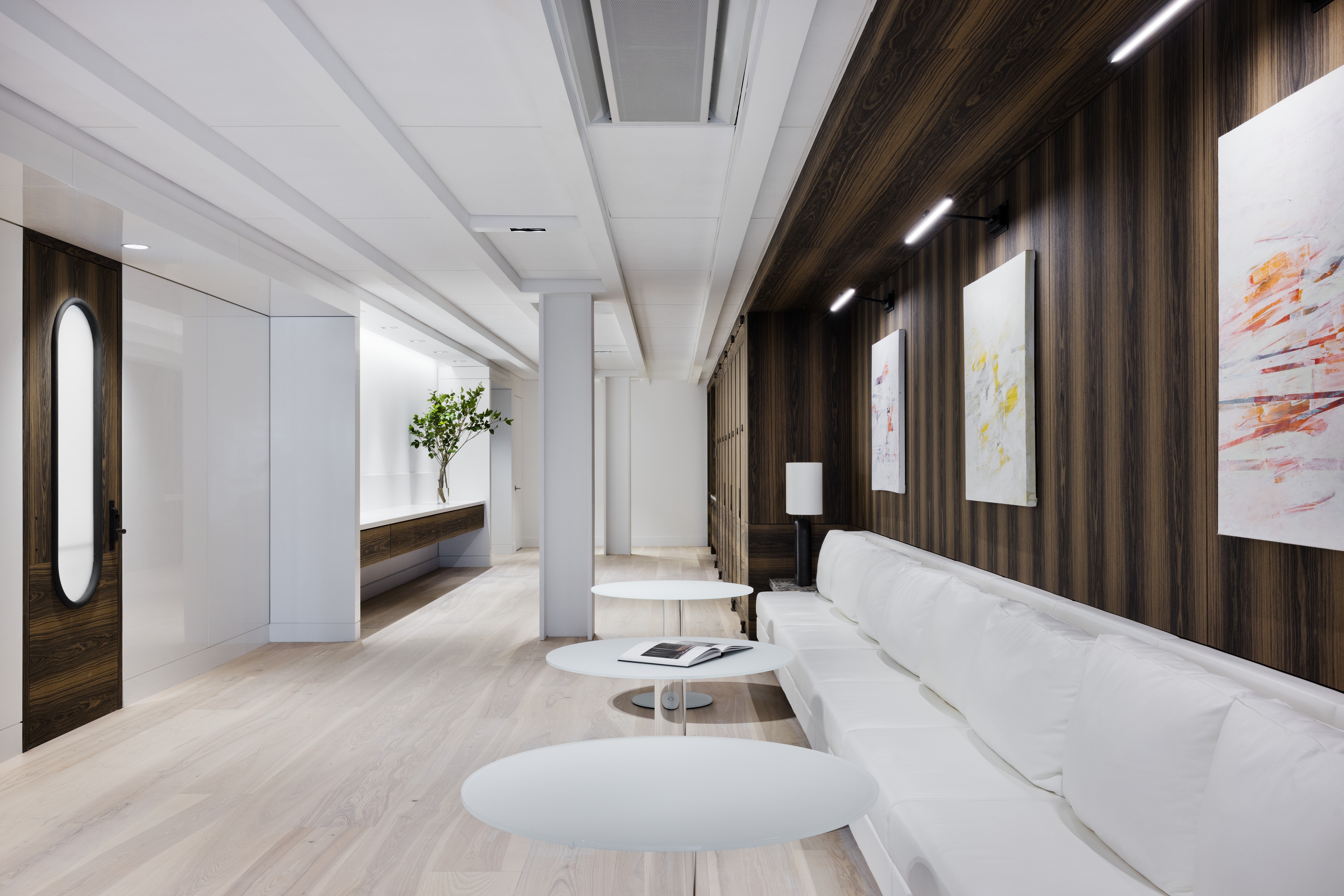 Entry DescriptionAs the elevator doors open, expectations of a “typical” law office fade. Instead, you step into a space that feels like a private residential gallery—warm, refined, and artfully illuminated. The reception area resembles an elegant living room, where rich materials and meticulous millwork create a welcoming atmosphere. Select artwork is highlighted, while other surfaces glow softly from concealed architectural lighting, reinforcing the firm’s goal of an inviting, sophisticated environment that puts clients at ease.