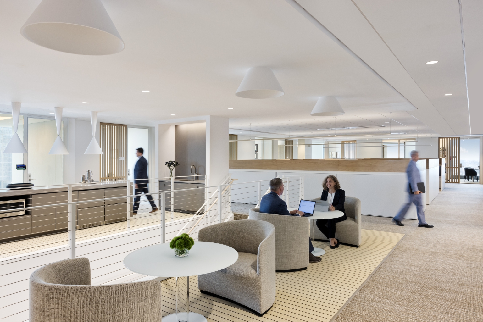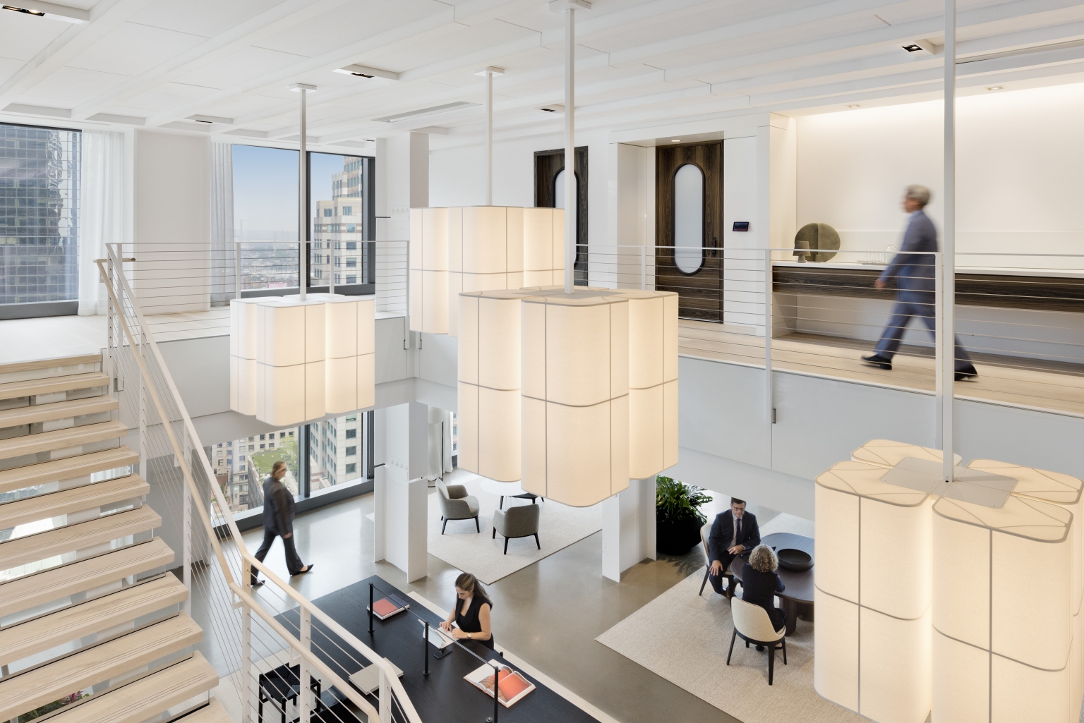 Across the two client-facing floors, custom gimbal fixtures integrate seamlessly within textured ceiling purlins, combining form and function. Decorative elements and wall sconces accentuate artwork and materials, creating layers of warmth and discovery. A “jewel box” conference room glows behind linen drapes, revealing a bright, engaging meeting space.