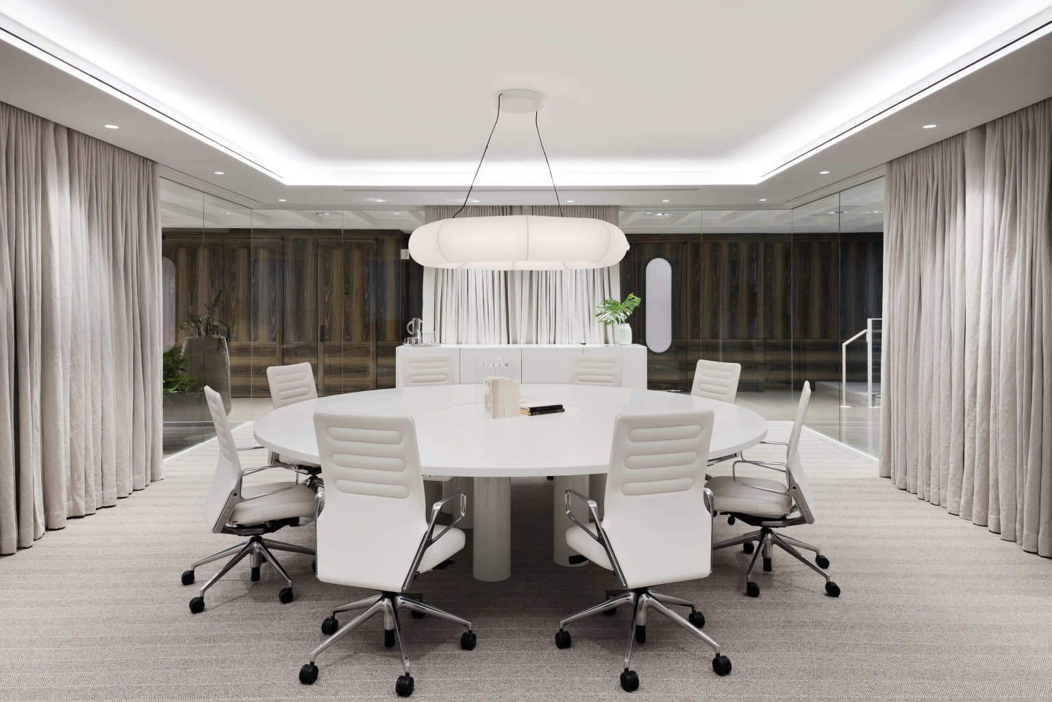 Sustainability ApproachSustainability in the lighting design is achieved through efficiency, control, and restraint. Integrated architectural lighting minimizes fixture visibility and material use while delivering balanced illumination. Carefully tuned sources provide visual comfort and warmth without excess energy, emphasizing quality over quantity of light. Layered lighting strategies ensure that brightness is directed only where needed—highlighting materials, art, and form—reducing both glare and waste. Dimming and preset control systems empower users to tailor light levels for meetings, gatherings, and daily use, enhancing comfort and minimizing consumption. The result is an elegant, high-performance environment where energy efficiency is seamlessly integrated into the design experience.